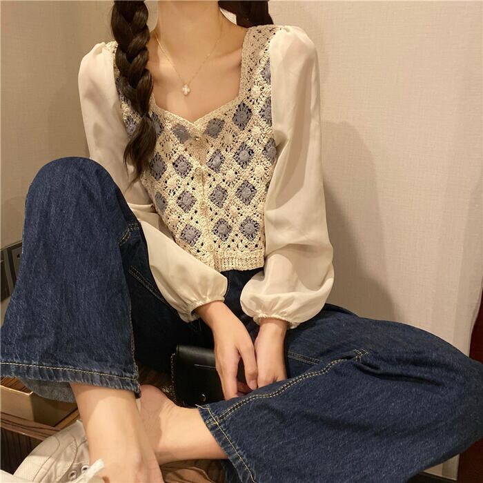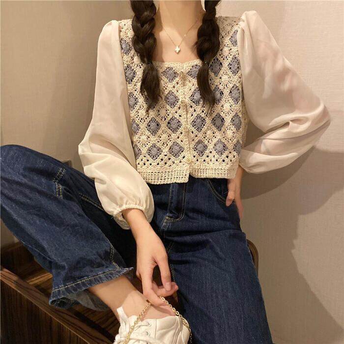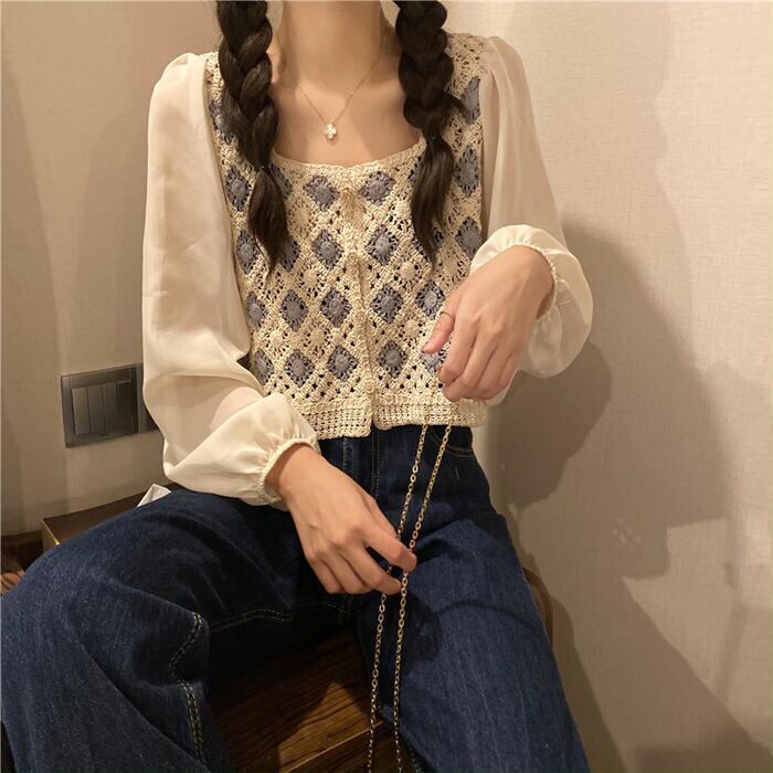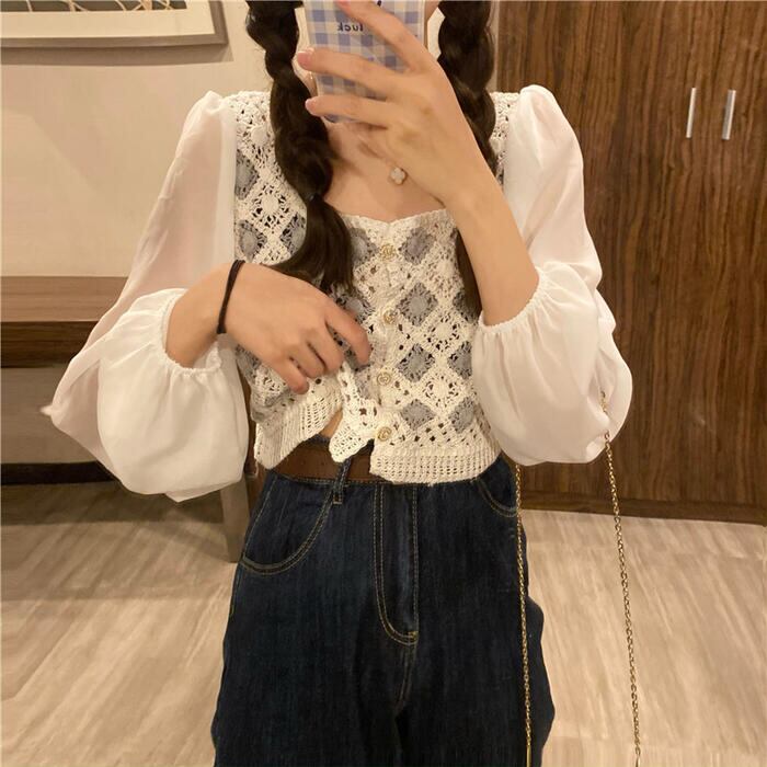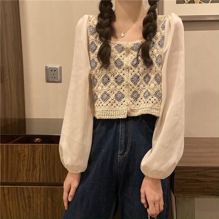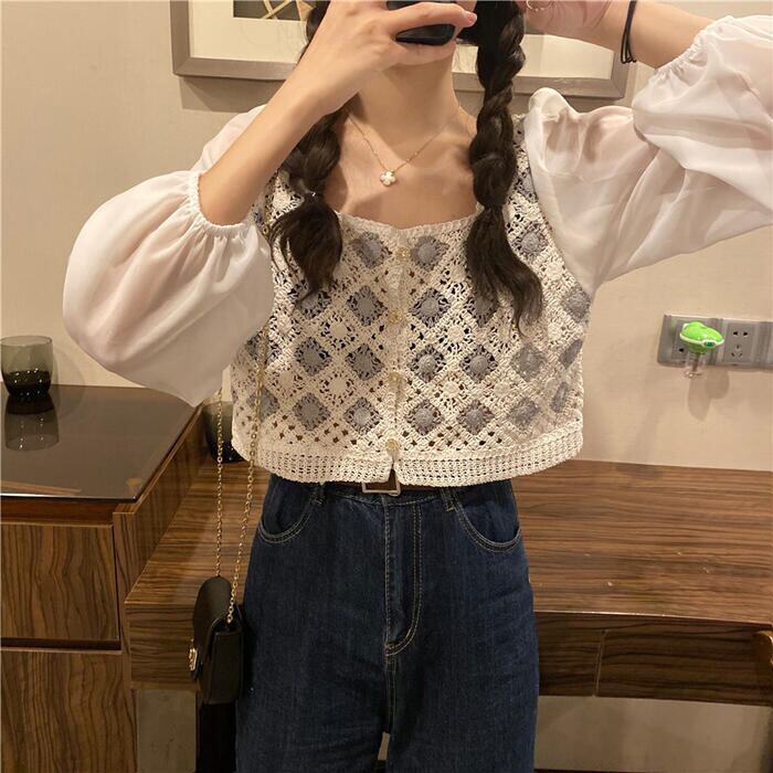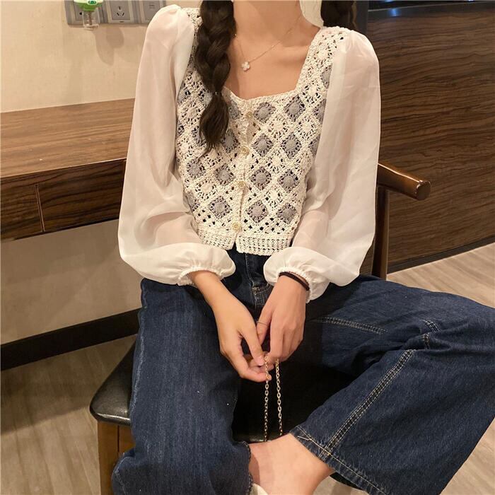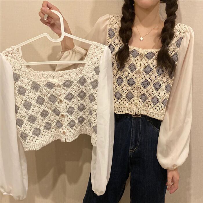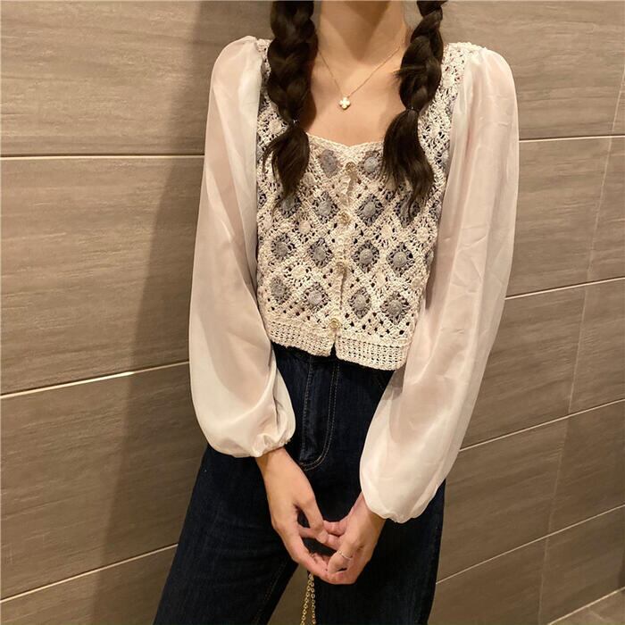 全2色 パフスリーブ トップス ブラウス シャツ 異素材ミックス カーディガン 長袖 ショート丈 きれいめ カジュアル おしゃれ 大人可愛い フェミニン 透け感 シアー クロップド丈 ナチュラル フェミニン ホワイト 白 ベージュ 春 冬 秋 20代 30代 40代 50代