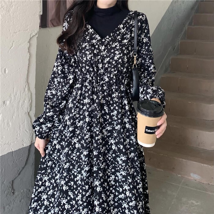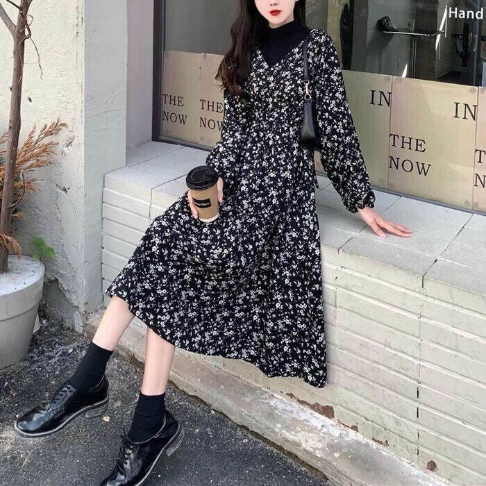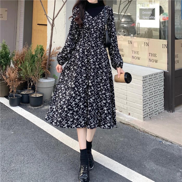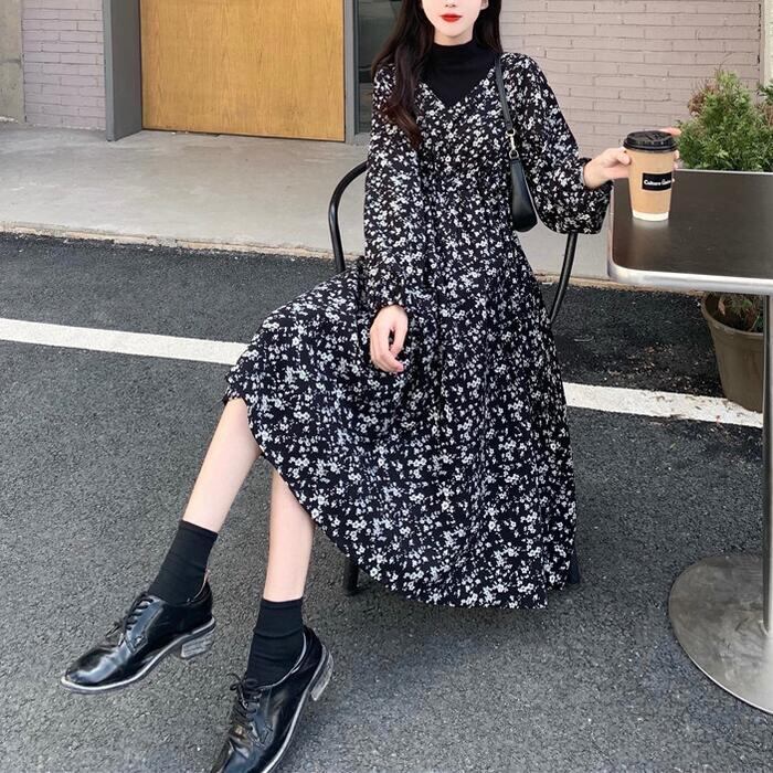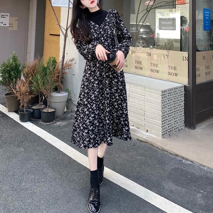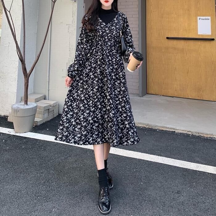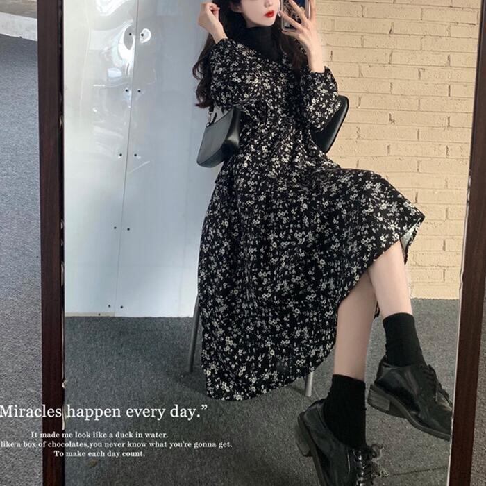 ハイネックのインナーにフラワーワンピを合わせたようなレイヤード風ワンピース。