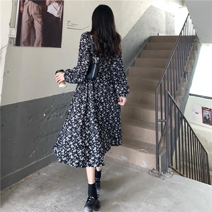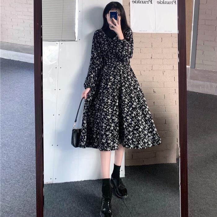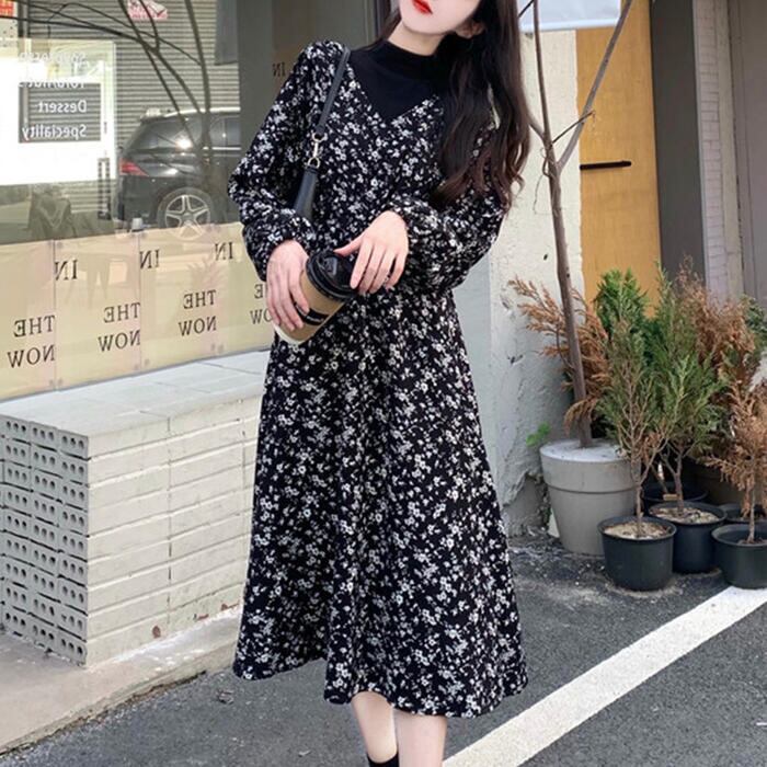 大きいサイズレイヤード風 ワンピース ロングワンピ 袖あり 花柄 ハイネック レディース きれいめ カジュアル ミモレ丈 長袖 おしゃれ 大人 可愛い ワンピ ドレス フェミニン Aライン 重ね着 体型カバー ブラック 黒 春 秋 冬 20代 30代 40代 50代
