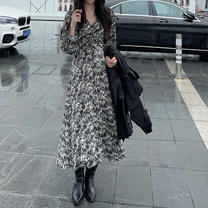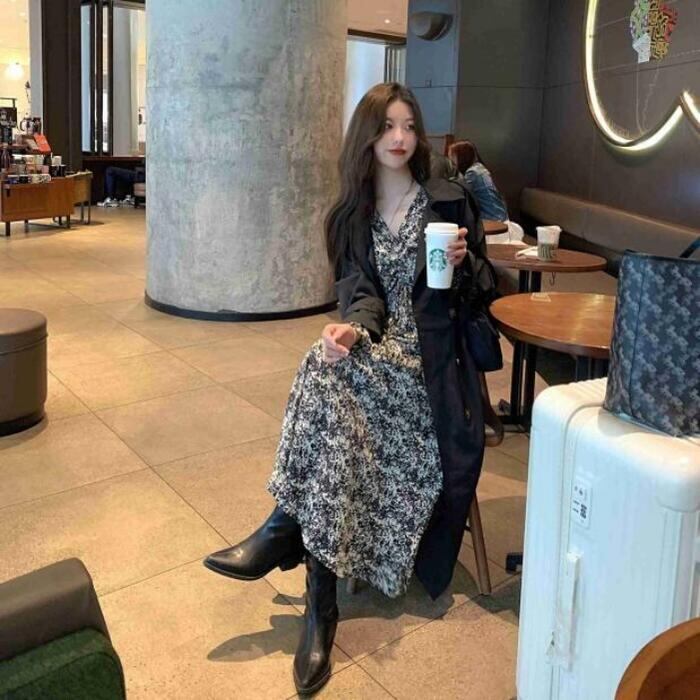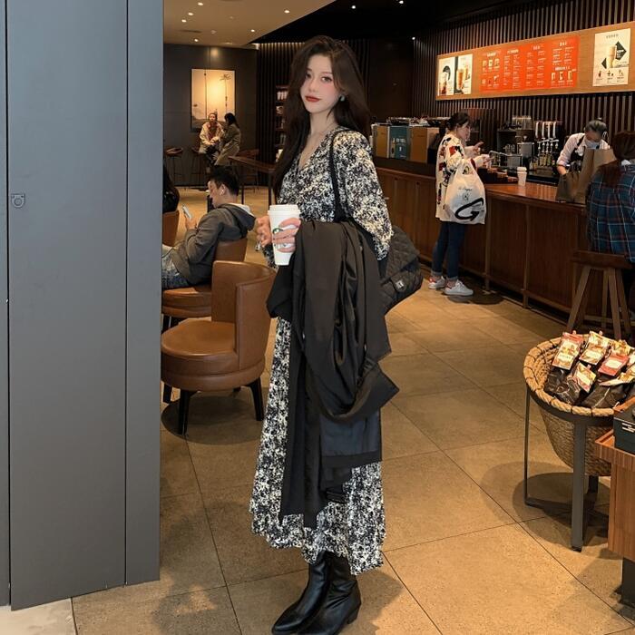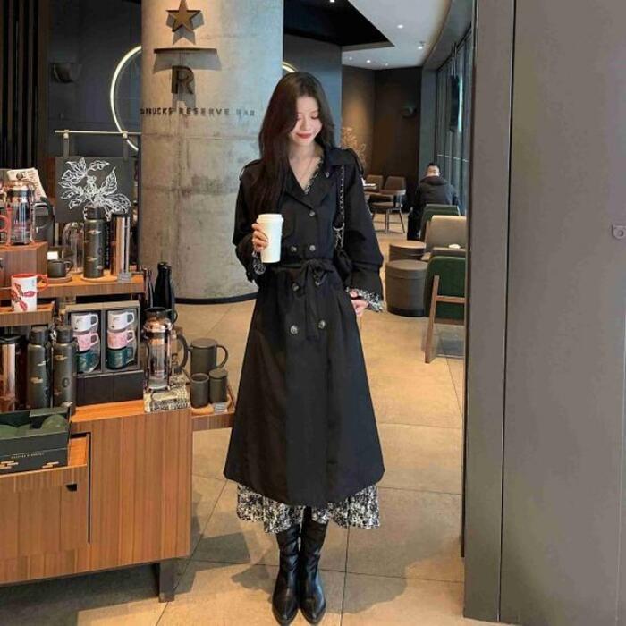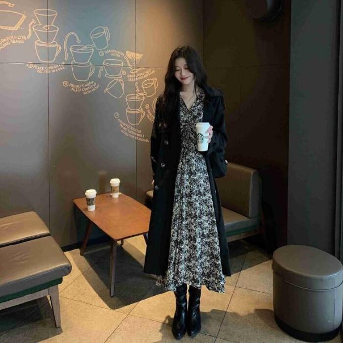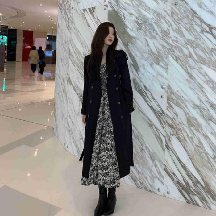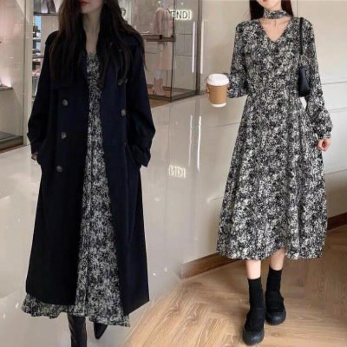 セットアップ 2点セット アウター コート ワンピース 花柄 トレンチ 長袖 おしゃれ 大人 可愛い きれいめ カジュアル レイヤード シンプル Aライン ロング丈 ベーシック 大きいサイズ ブラック 黒 春 秋 冬 20代 30代 40代 50代
