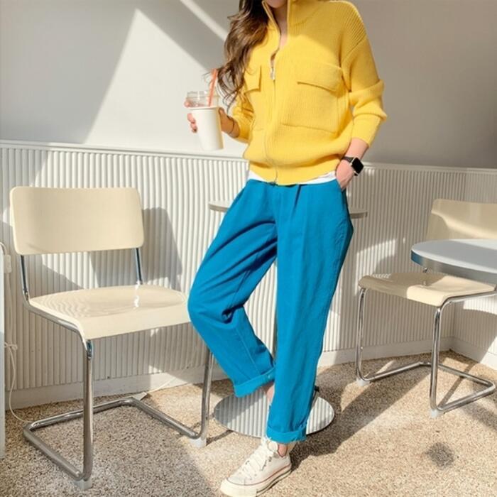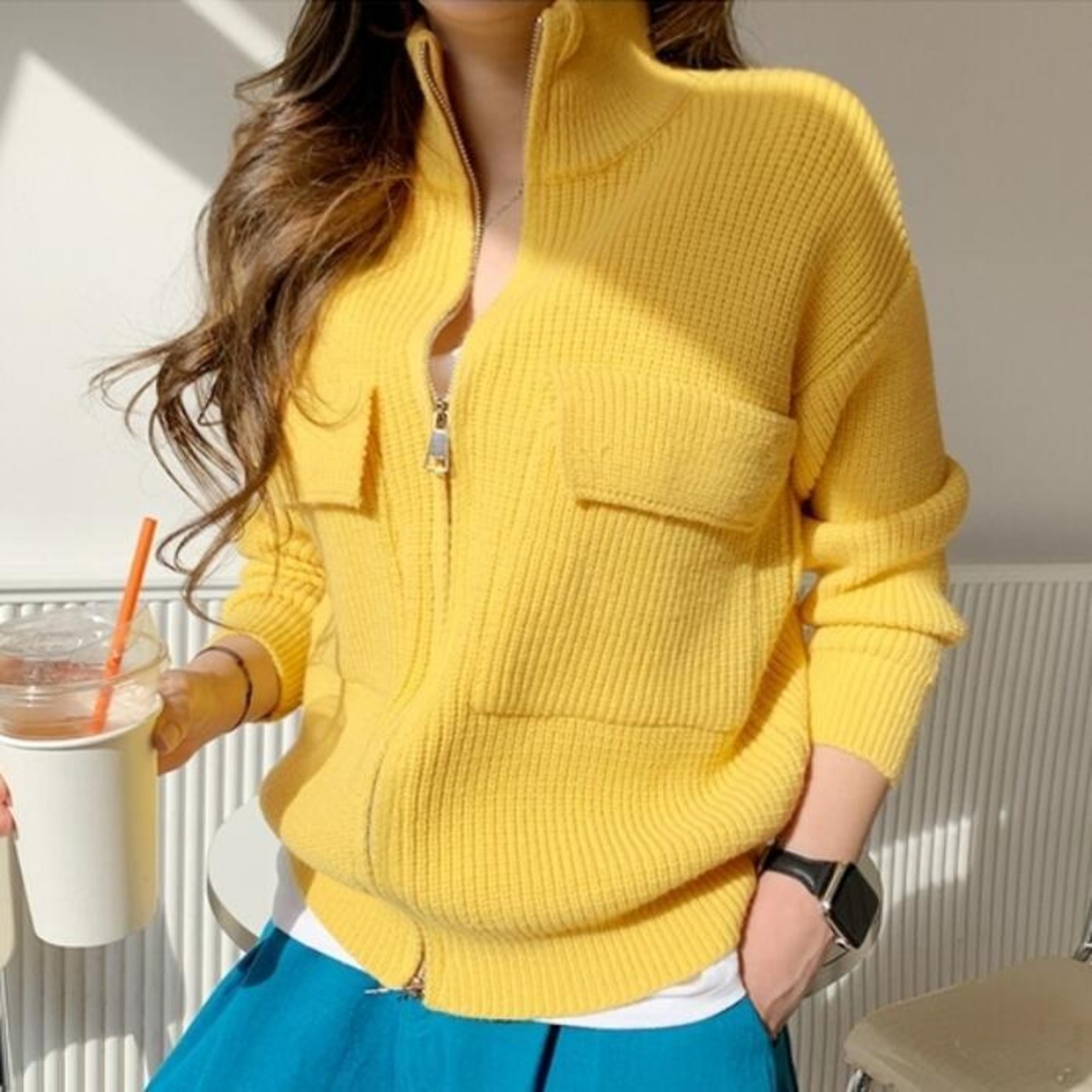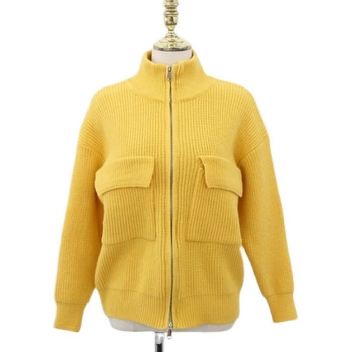 全3色 トップス ニット カーディガン 羽織り ジャケット コート ジップアップ レディース ハイネック きれいめ カジュアル おしゃれ 長袖 大人 可愛い 体型カバー シンプル かっこいい イエロー ブルー 青 ベージュ 春 秋 冬 20代 30代 40代 50代