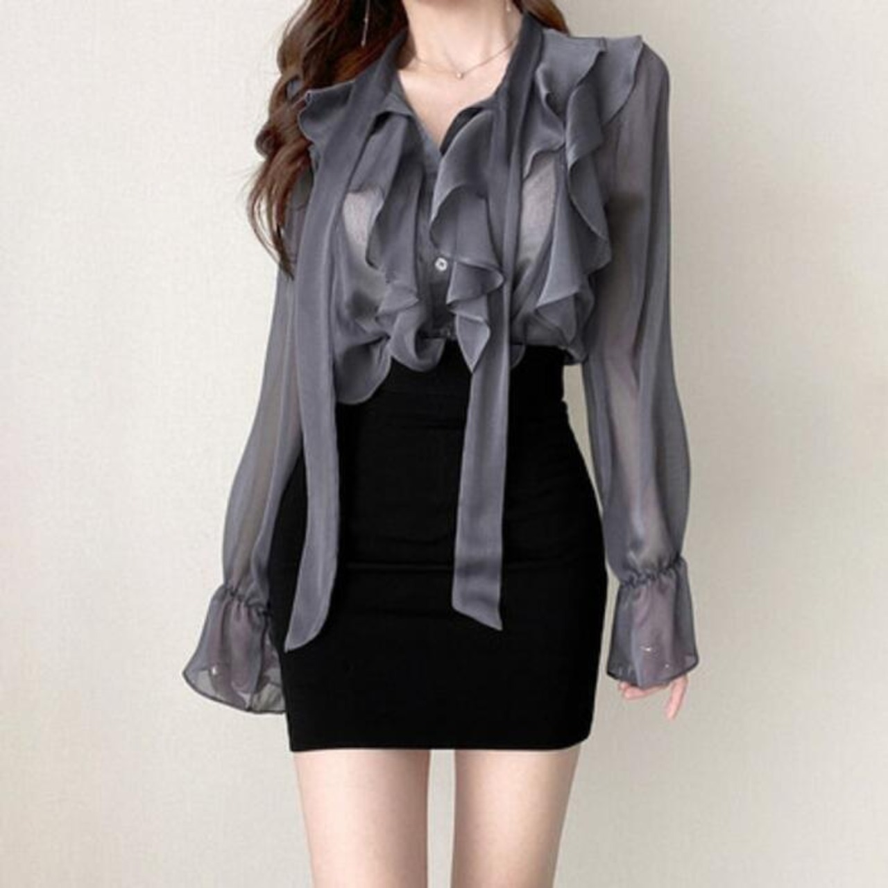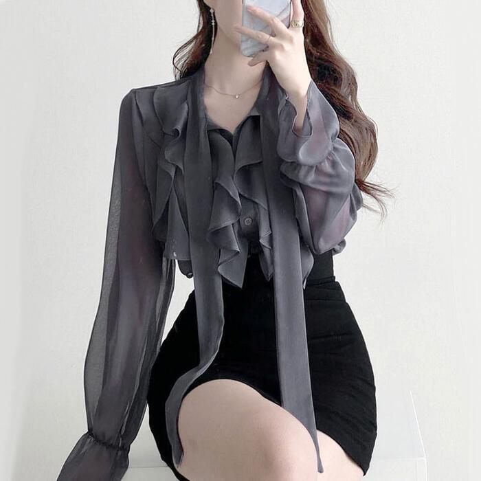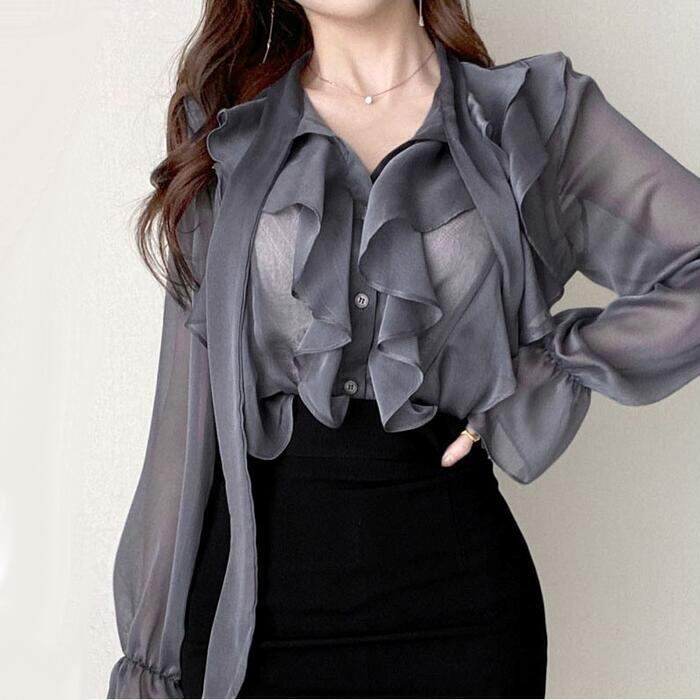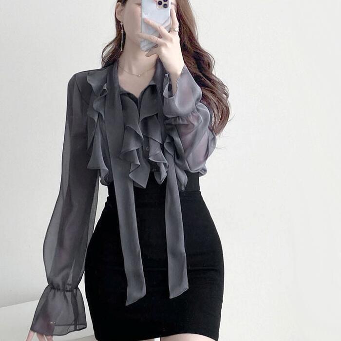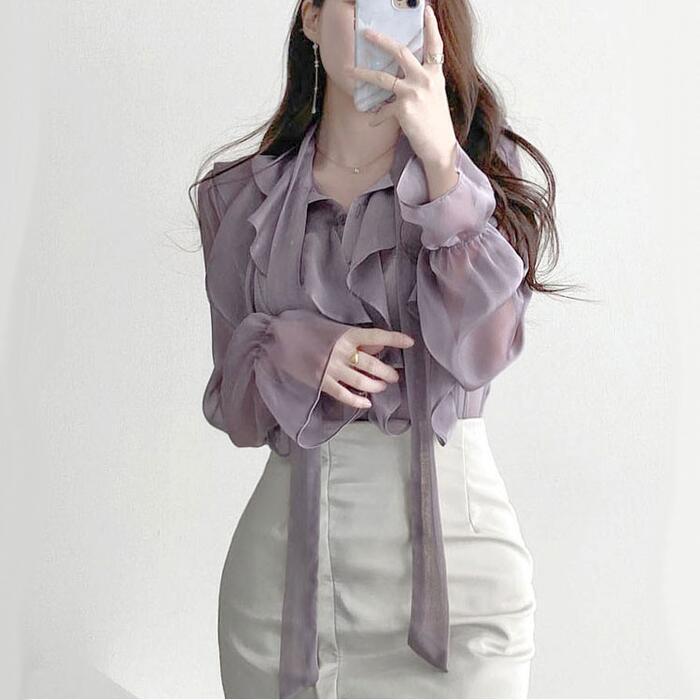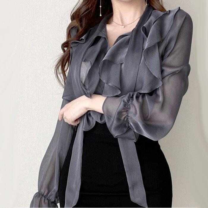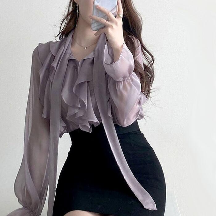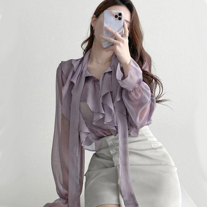 上品な透け感が魅力のラッフルボウタイブラウス。