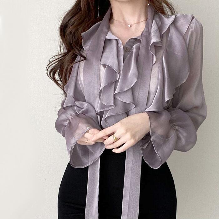 全2色 大きいサイズトップス ブラウス シャツ ラッフル フリル ボウタイ リボン 羽織り レディース エレガント きれいめ カジュアル おしゃれ 長袖 大人 可愛い 透け感 フェミニン かっこいい グレー パープル 春 秋 冬 20代 30代 40代 50代