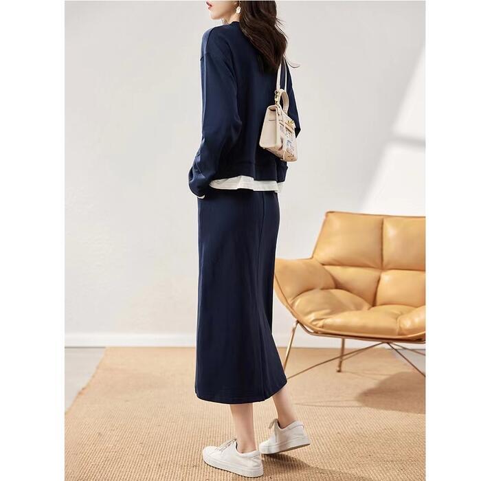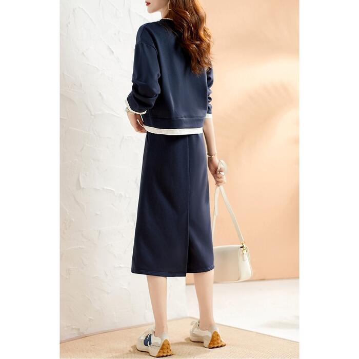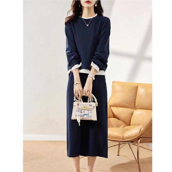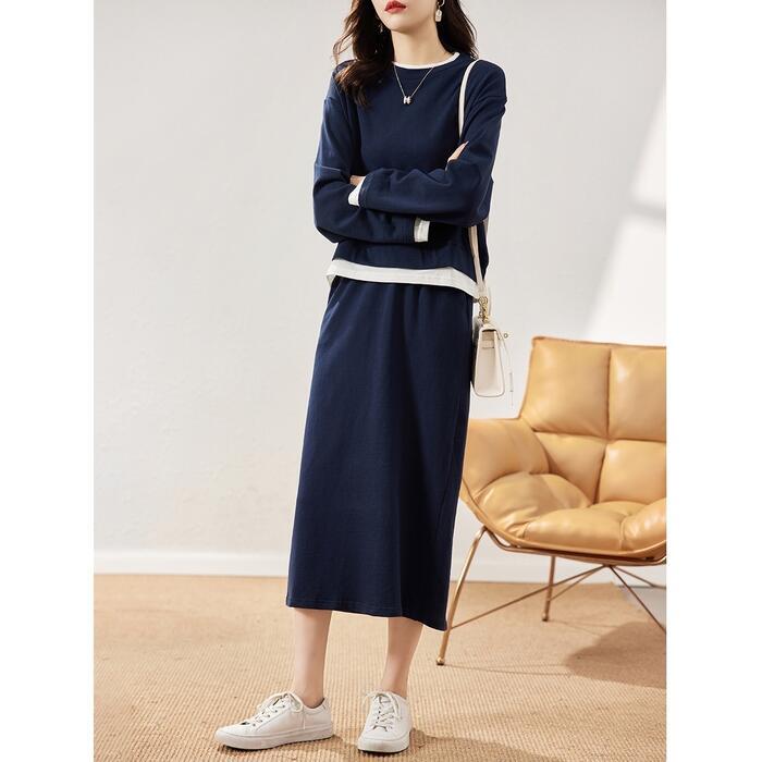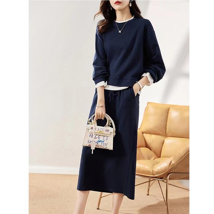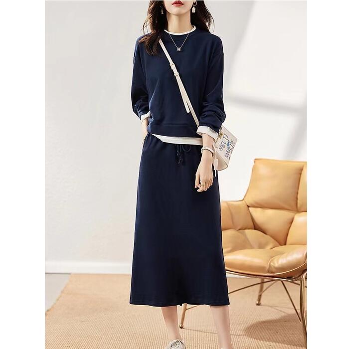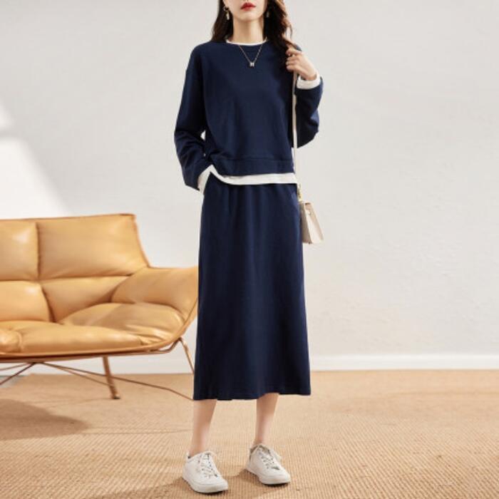 大きいサイズセットアップ 2点セット トップス スウェット スカート レイヤード風 長袖 おしゃれ 大人 可愛い カジュアル ミモレ丈 きれいめ シンプル 体型カバー フェミニン 楽ちん リラックス ネイビー 春 秋 冬 20代 30代 40代 50代