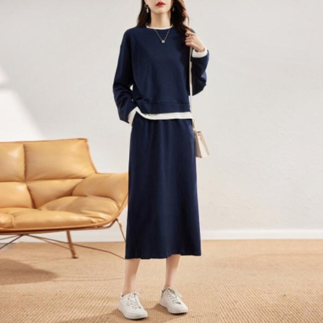 リラクシーな着心地の長袖トップス&スカートのセットアップ。