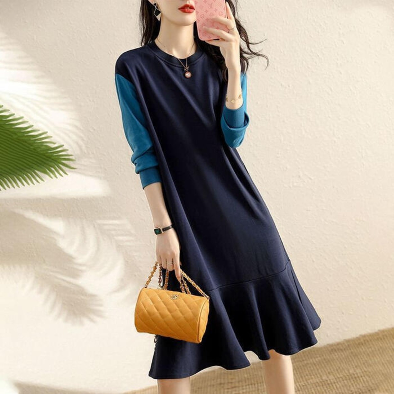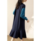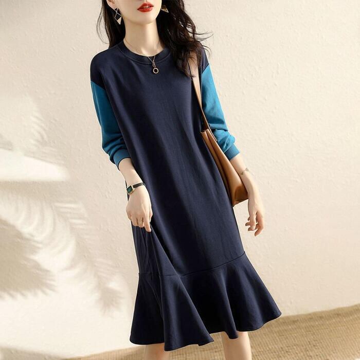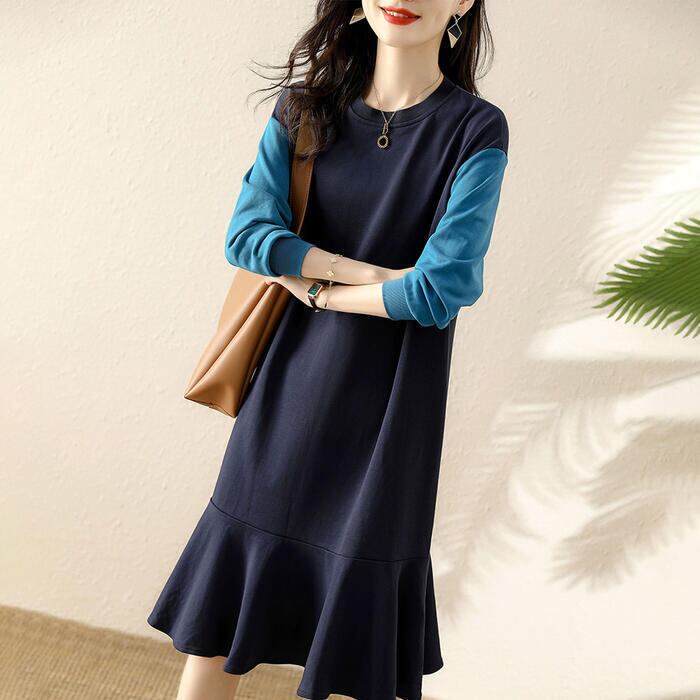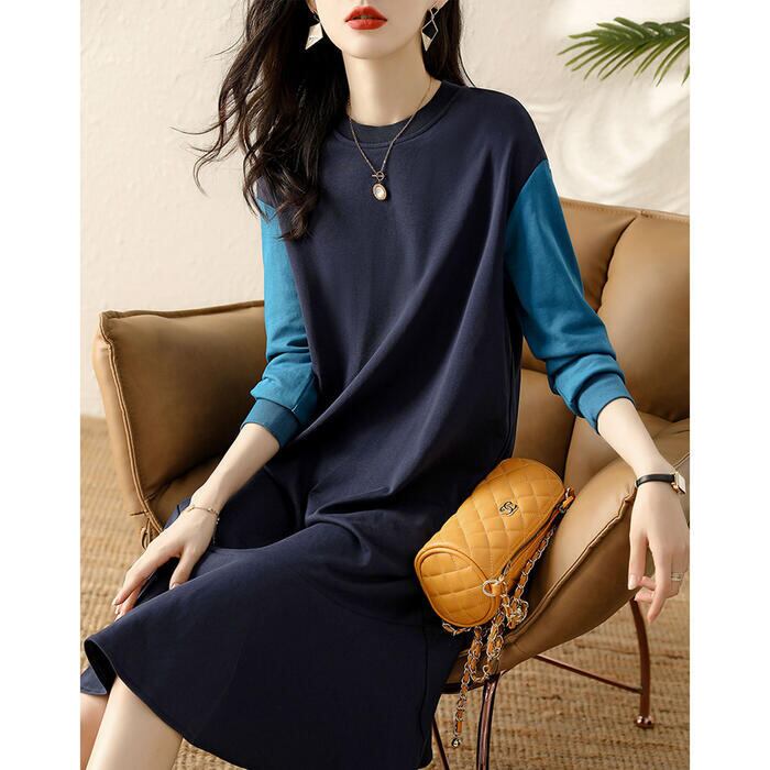 大きいサイズワンピース ロングワンピ バイカラー 切り替え 袖あり レディース きれいめ カジュアル ミモレ丈 フレア 長袖 おしゃれ 大人 可愛い ワンピ ドレス スウェット フェミニン シンプル ネイビー 春 秋 冬 20代 30代 40代 50代