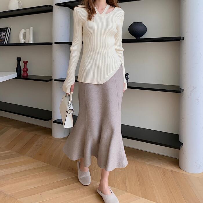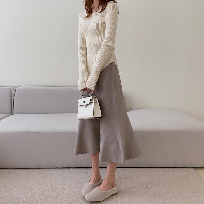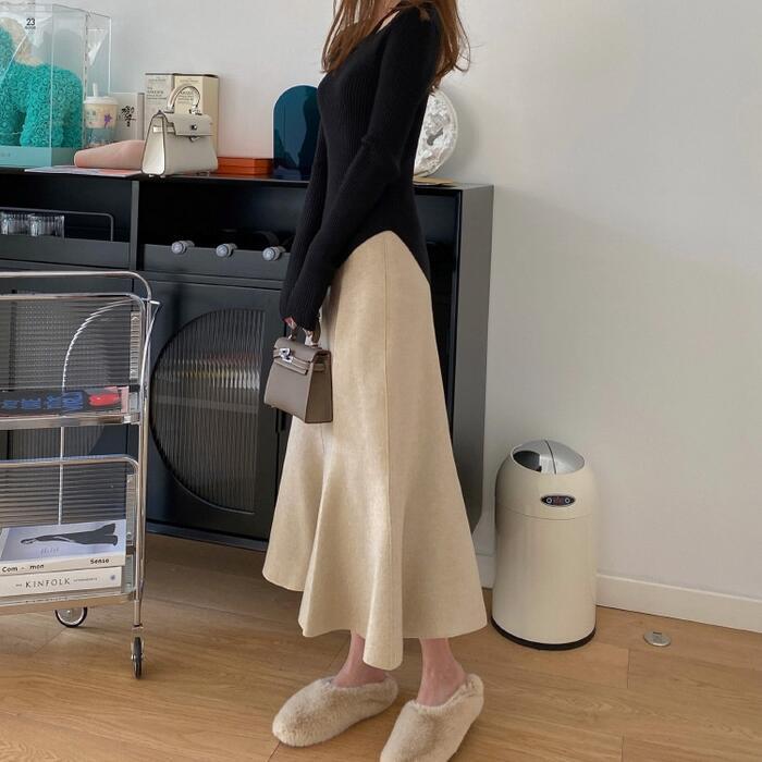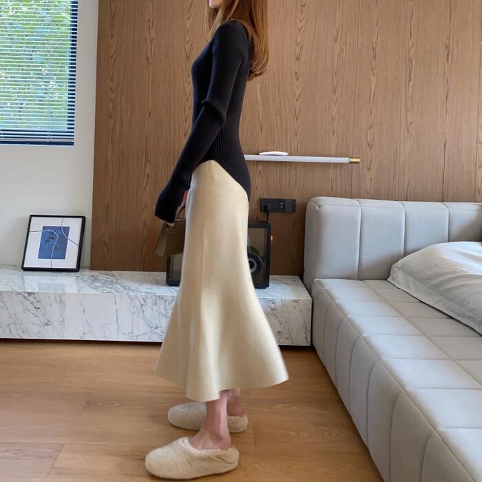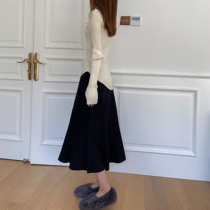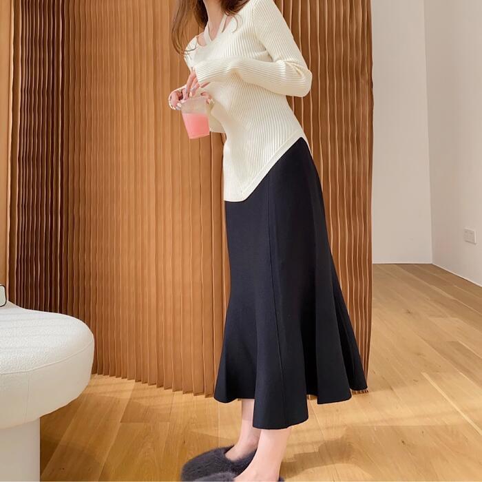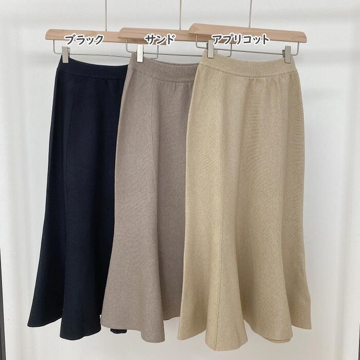 全3色 スカート ボトムス ニット ミモレ丈 マーメイド エレガント カジュアル レディース フェミニン 大人 可愛い きれいめ ナチュラル フレア ウエストゴム おしゃれ 楽ちん ホワイト 白 ベージュ ブラック 黒 春 秋 冬 20代 30代 40代 50代