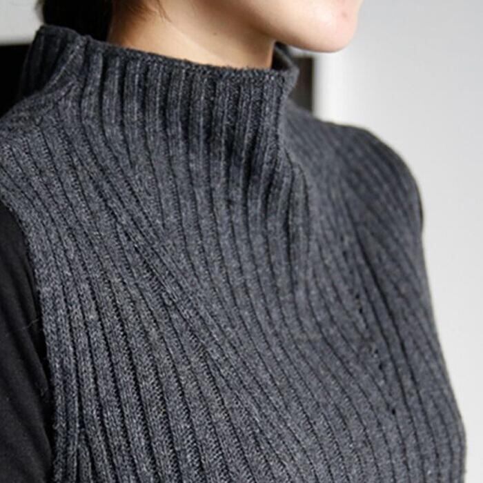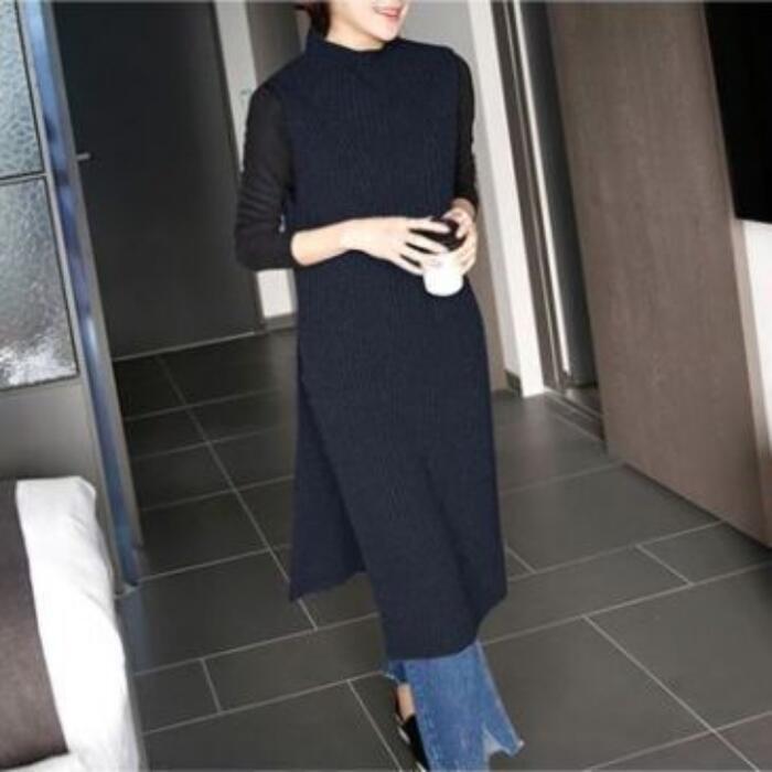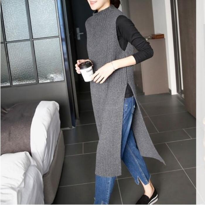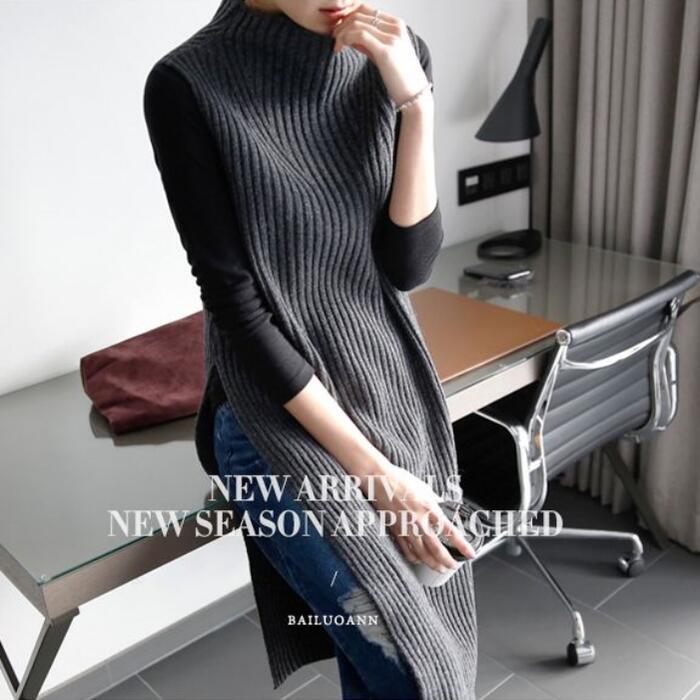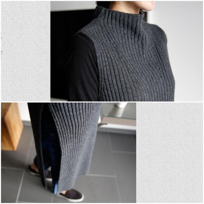 全2色 体型カバーレイヤード トップス ニット ハイネック サイドスリット ベスト ワンピース プルオーバー レディース エレガント きれいめ カジュアル おしゃれ ノースリーブ 大人 可愛い フェミニン 重ね着 グレー ブラック 黒 春 秋 冬 20代 30代 40代 50代
