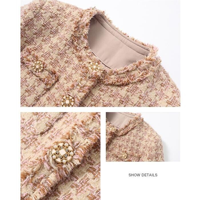大きいサイズアウター ジャケット コート ツイード 羽織り ノーカラー レディース エレガント きれいめ カジュアル おしゃれ 長袖 大人 可愛い フェミニン こなれ感 フリンジ オフィス お呼ばれ フォーマル ピンク 春 秋 冬 20代 30代 40代 50代