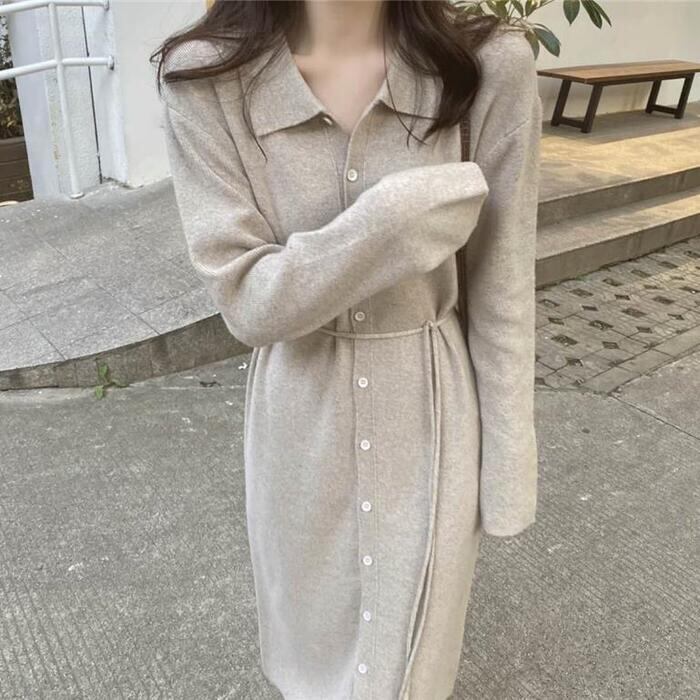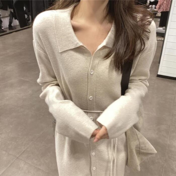 全2色 大きいサイズワンピース ロングワンピ ニット 袖あり 襟付き レディース きれいめ カジュアル ミモレ丈 長袖 おしゃれ 大人 可愛い ワンピ ドレス ウエストリボン シンプル 体型カバー ベージュ ピンク 春 秋 冬 20代 30代 40代 50代