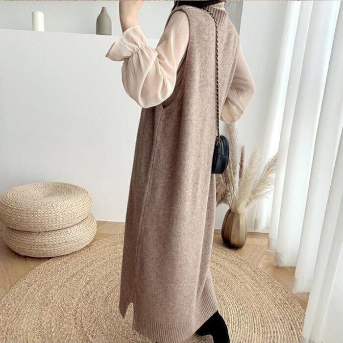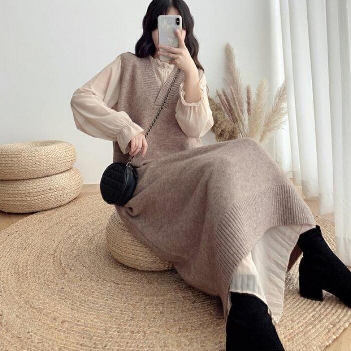 大きいサイズセットアップ 2点セット ワンピース ベスト ニット シフォン 袖あり レイヤード 長袖 ノースリーブ おしゃれ 大人 可愛い カジュアル きれいめ シンプル フェミニン ゆったり 体型カバー ベージュ 春 秋 夏 20代 30代 40代 50代