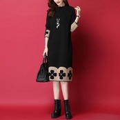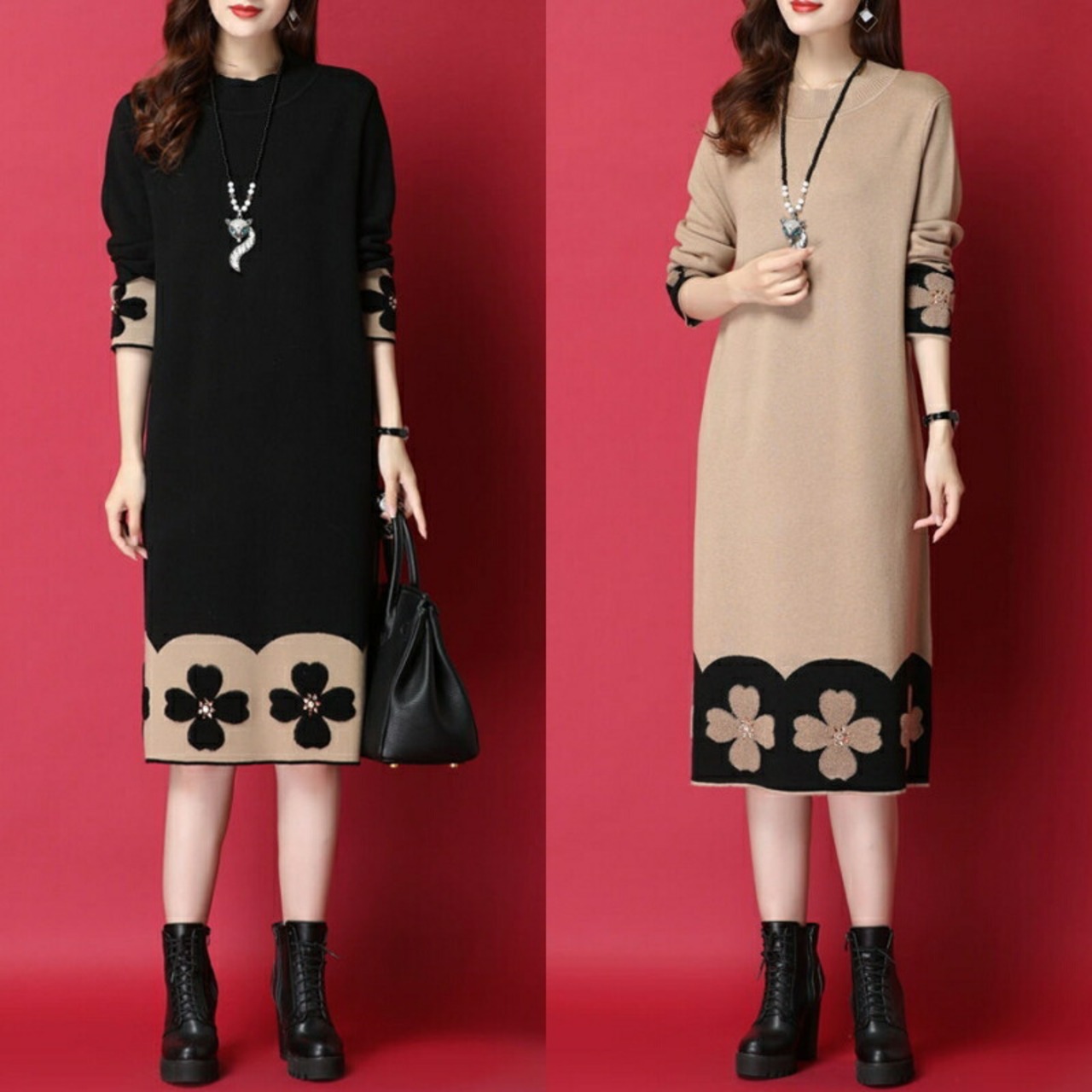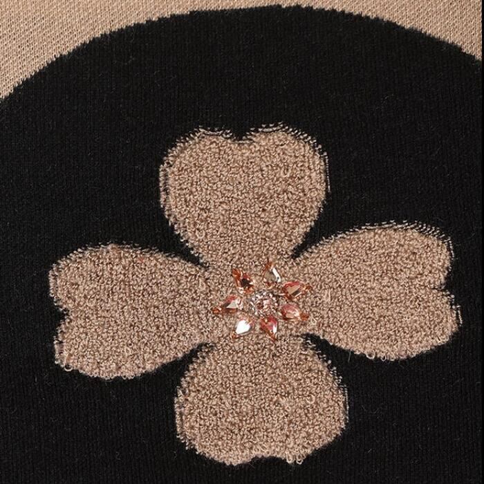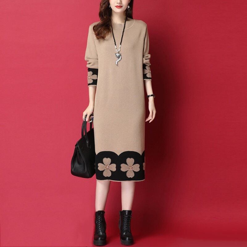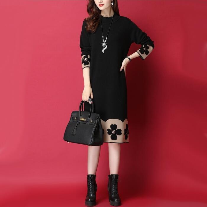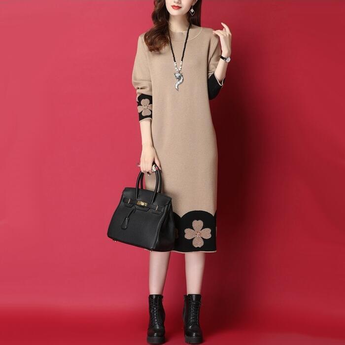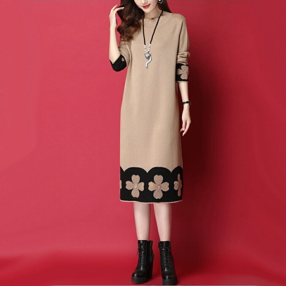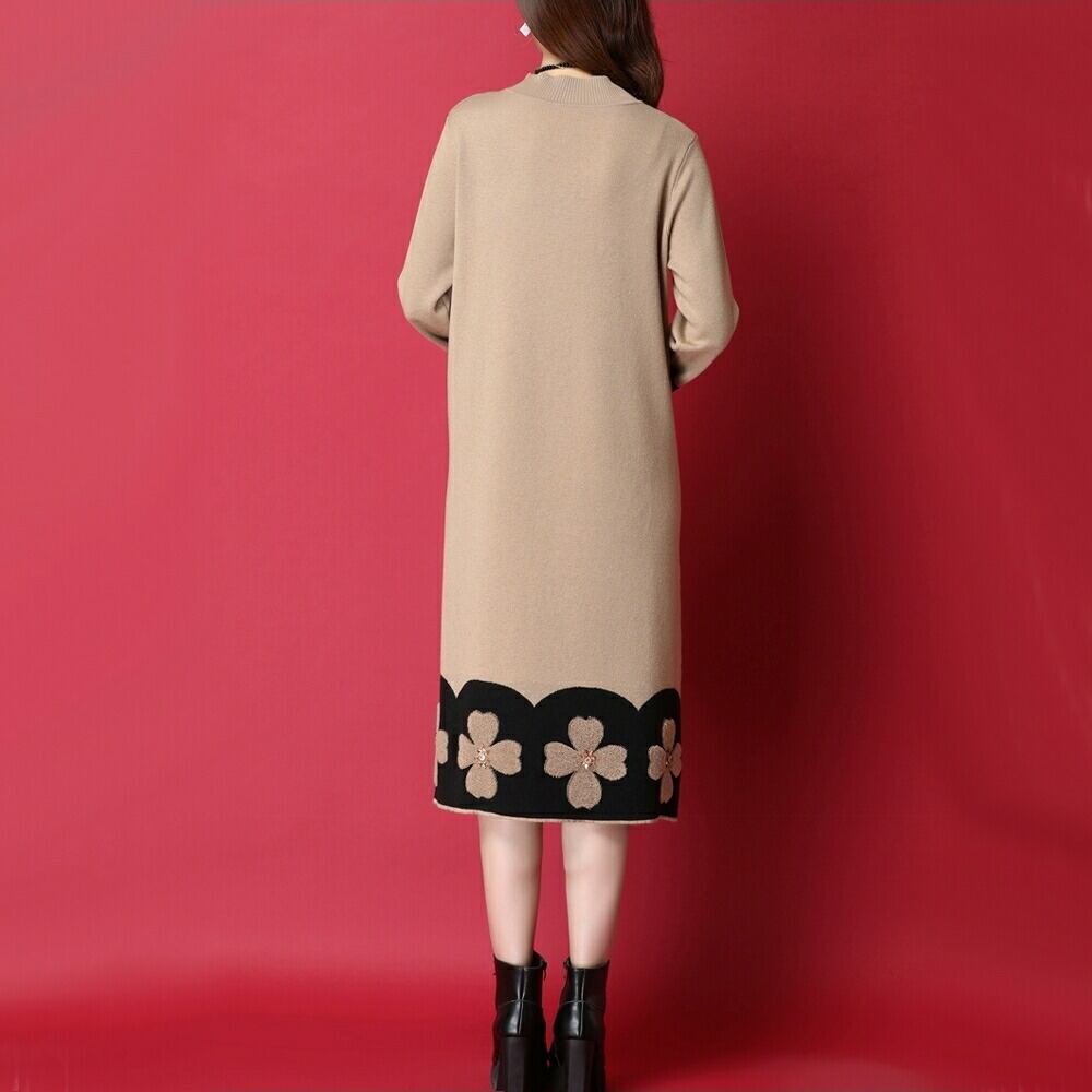 全2色 ワンピース ニット 花柄 袖あり エレガント レディース きれいめ カジュアル ひざ丈 ミモレ丈 長袖 おしゃれ 大人 可愛い ワンピ ゆったり 体型カバー ラインストーン ベージュ ブラック 黒 春 秋 冬 20代 30代 40代 50代