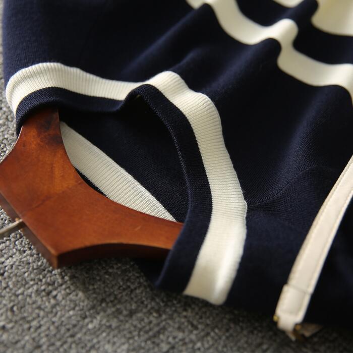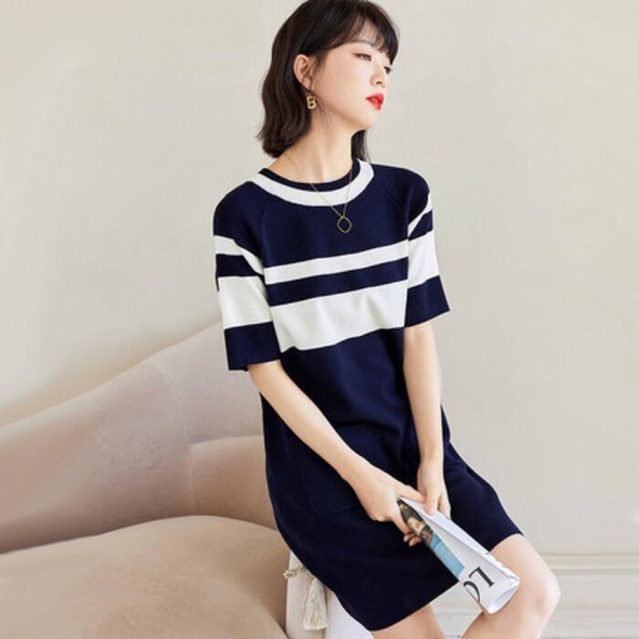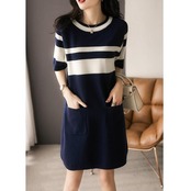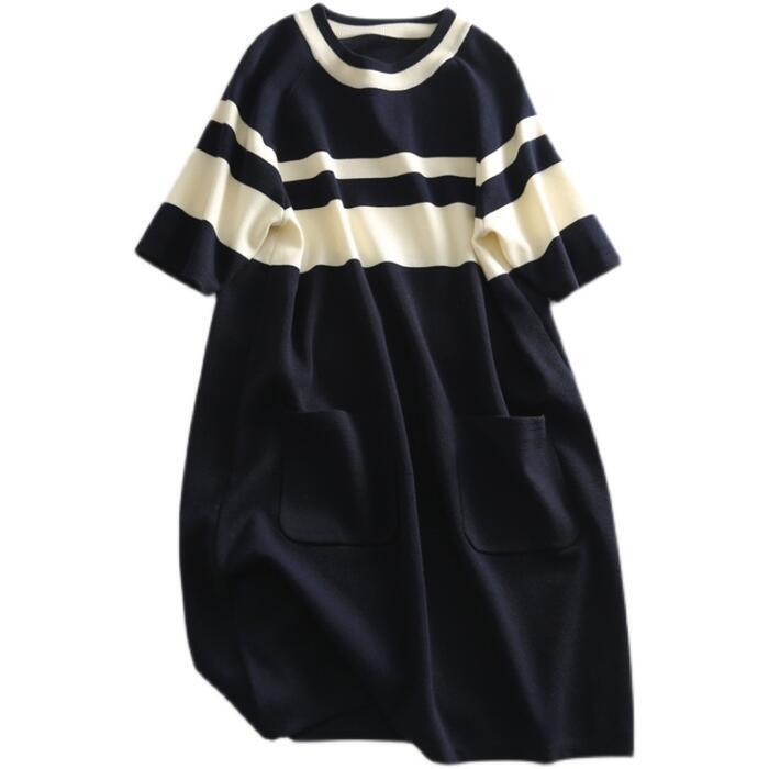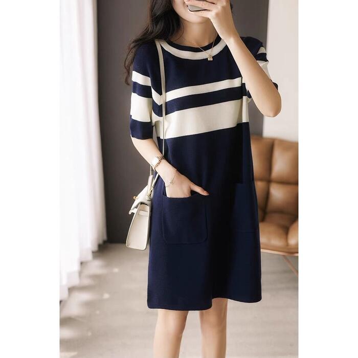ワンピース ニット ボーダー 袖あり エレガント レディース きれいめ カジュアル ひざ丈 ショート丈 半袖 おしゃれ 大人 可愛い クルーネック 体型カバー Aライン オフィス 大きいサイズ ネイビー 春 秋 夏 20代 30代 40代 50代