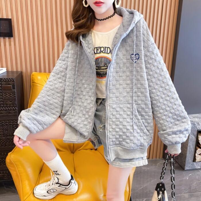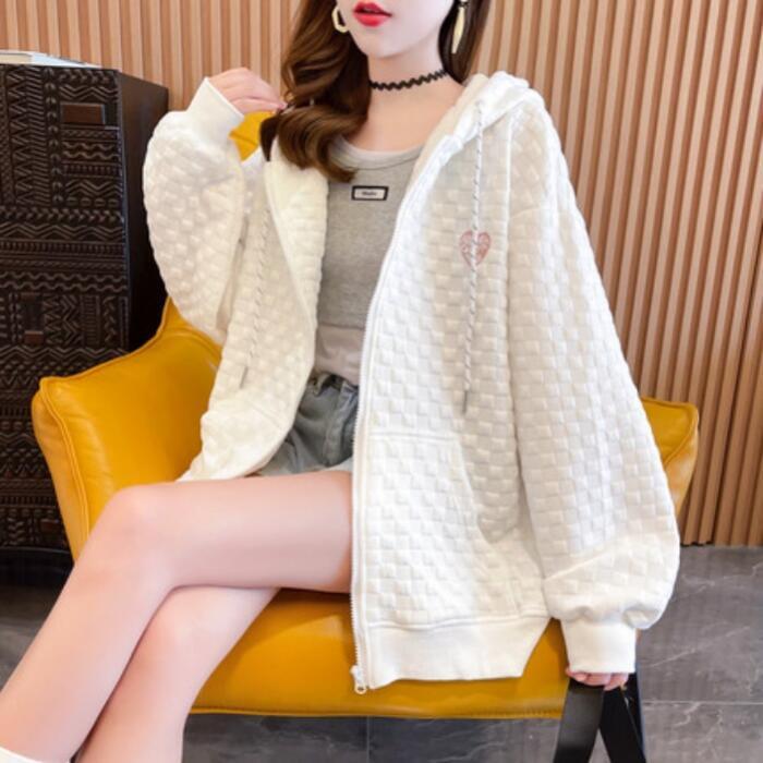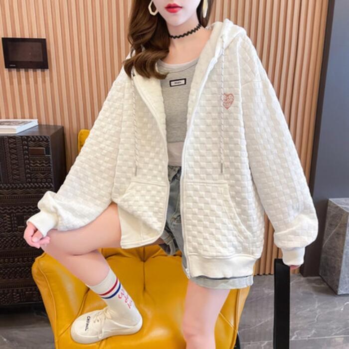 全2色 大きいサイズトップス パーカー アウター ジャケット フーディ レディース きれいめ カジュアル チェック おしゃれ 長袖 大人 可愛い ジップアップ 羽織 フェミニン かっこいい シンプル ホワイト 白 グレー 春 秋 冬 20代 30代 40代 50代