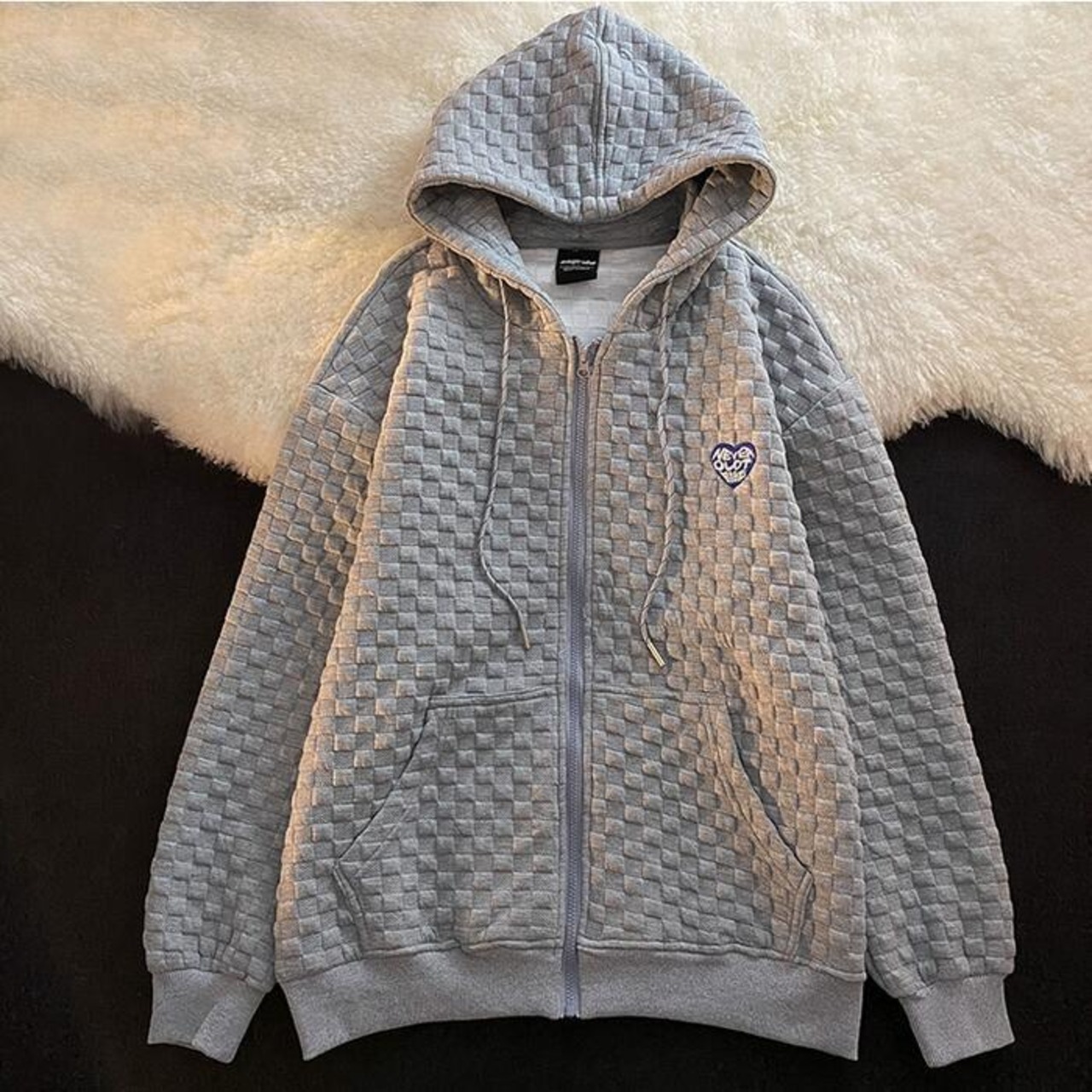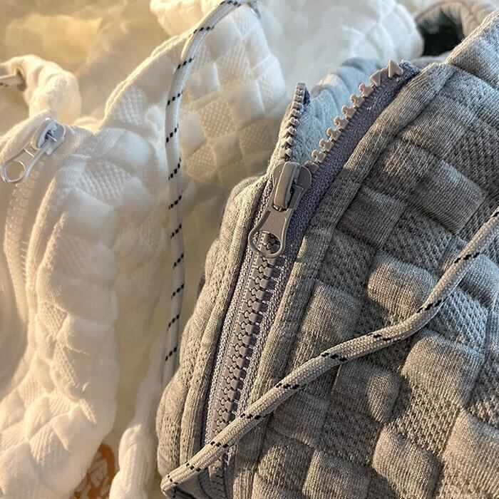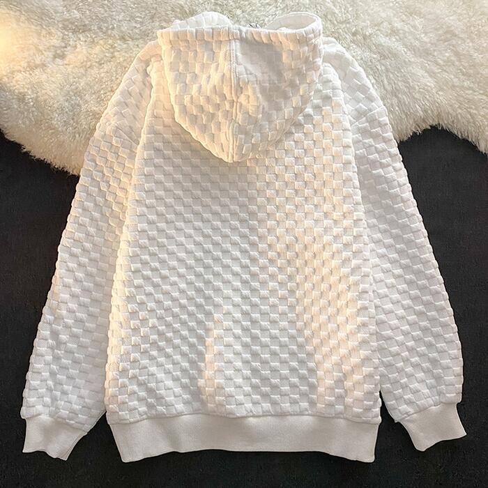 凹凸感のあるチェックパターン生地が新鮮なジップアップパーカー。