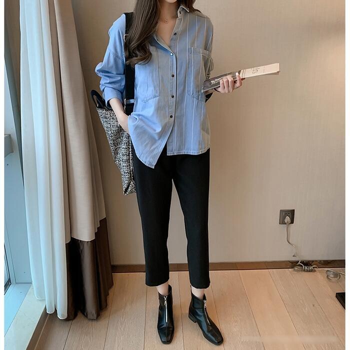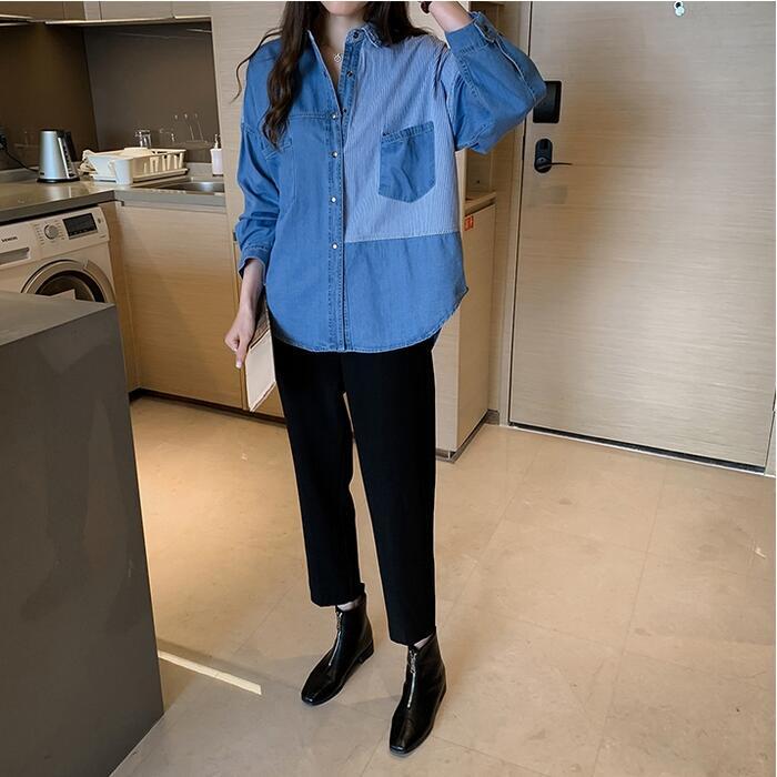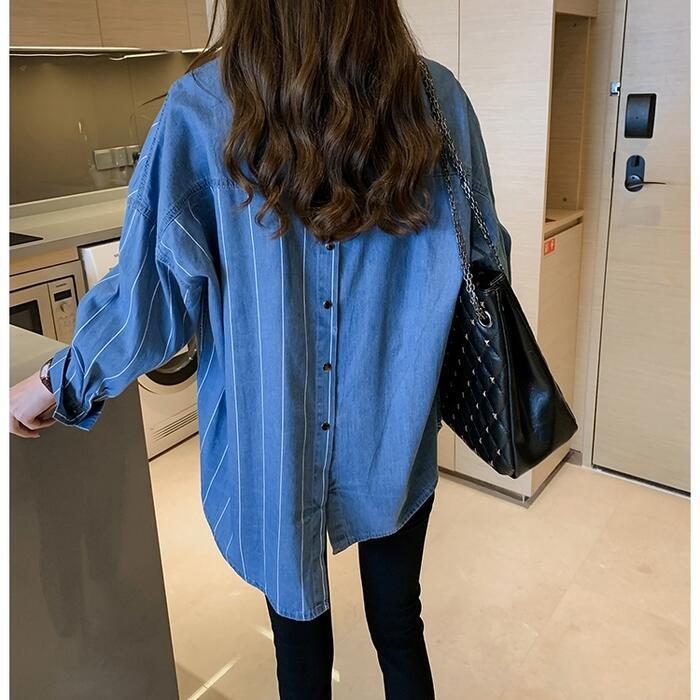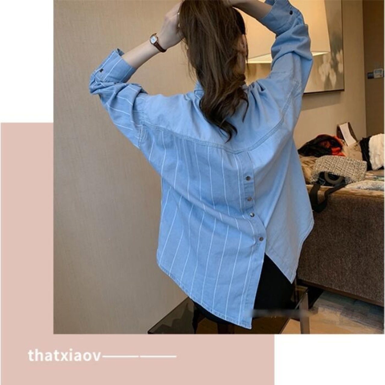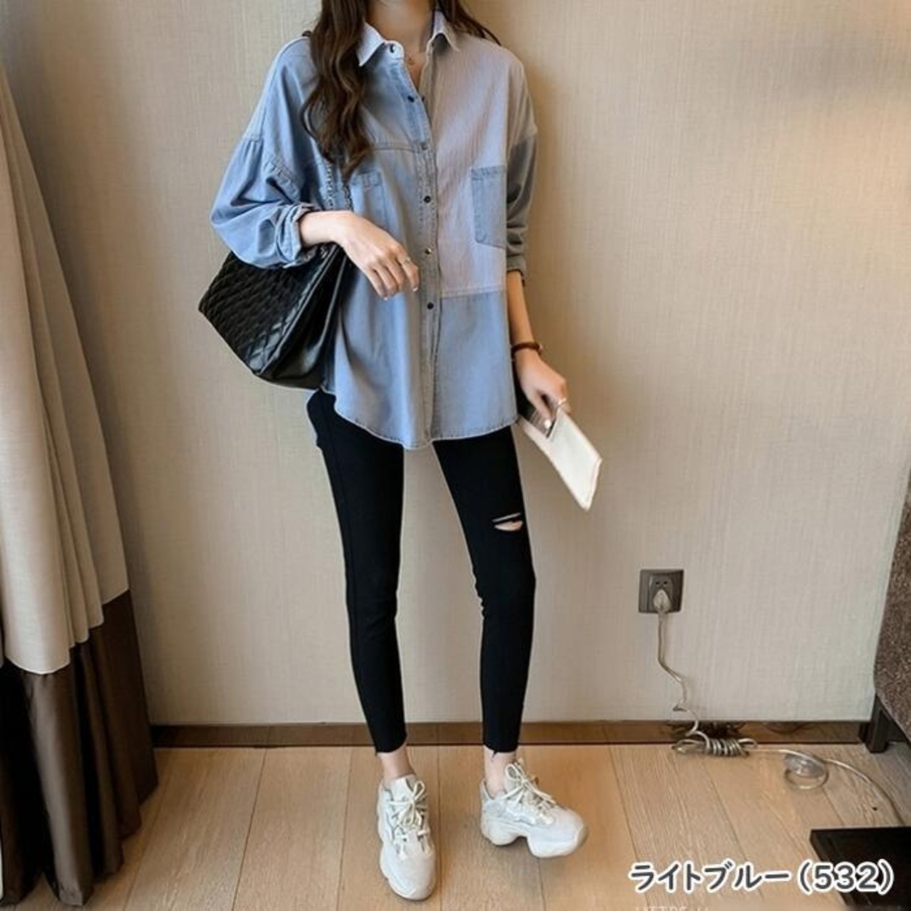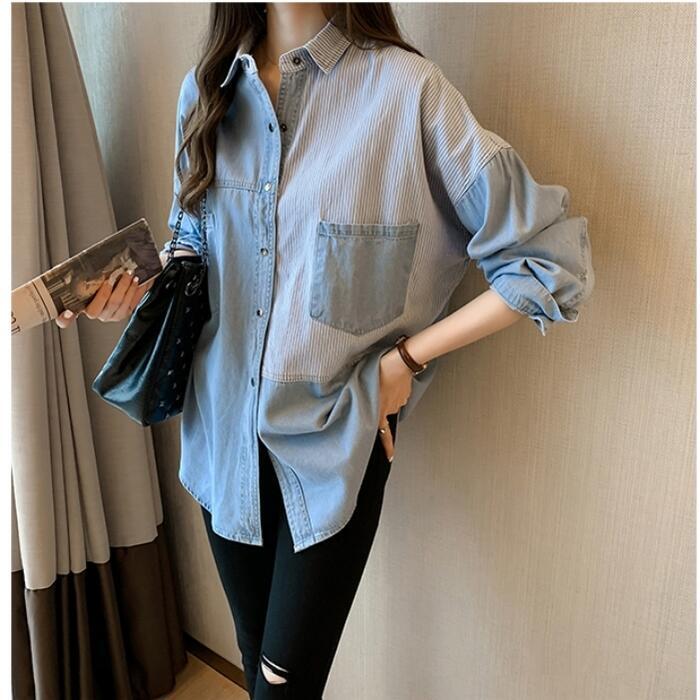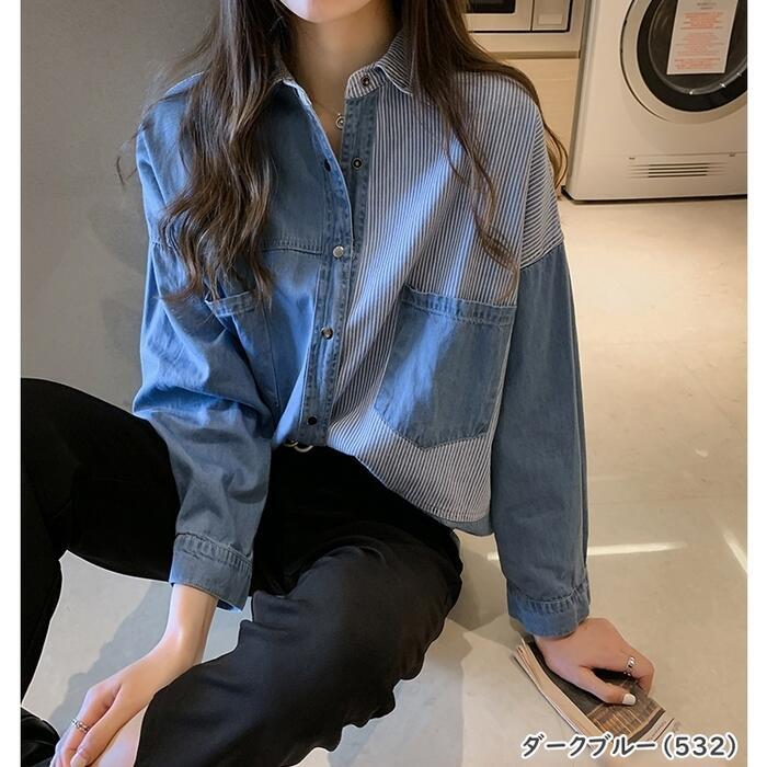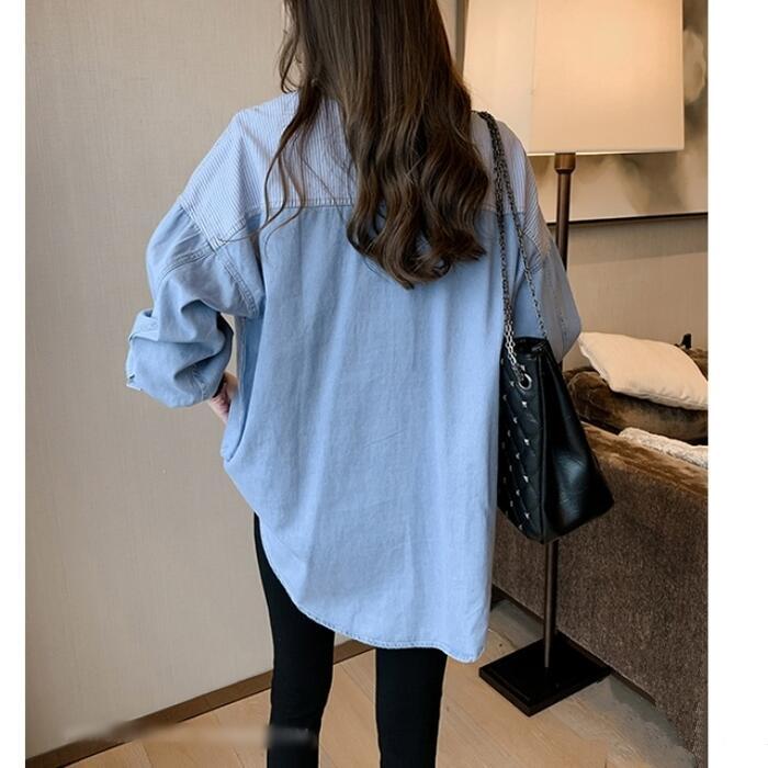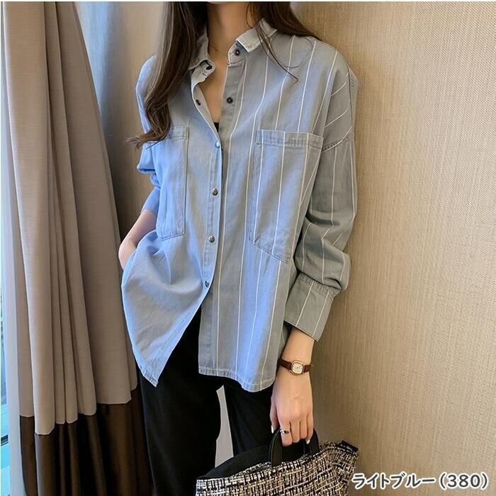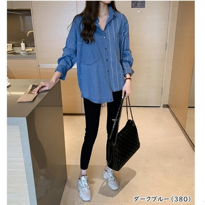 全4色 大きいサイズトップス シャツ ブラウス デニム アシンメトリー ストライプ 羽織り レディース きれいめ カジュアル おしゃれ 長袖 ダンガリー 大人 可愛い ゆったり 体型カバー オーバーサイズ ブルー 青 春 秋 冬 20代 30代 40代 50代