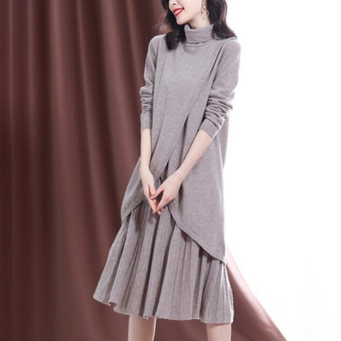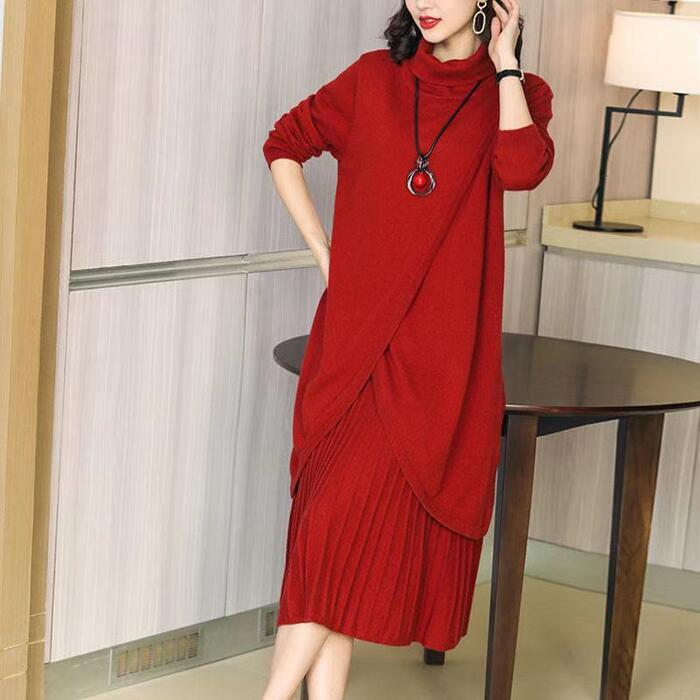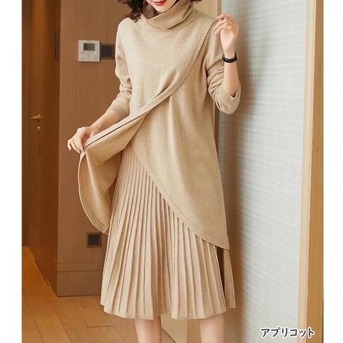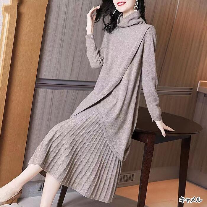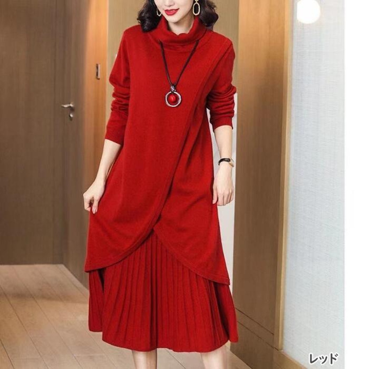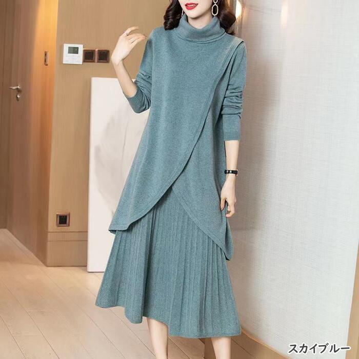 全5色 大きいサイズ 2点セット レイヤード セットアップ ワンピース トップス スカート ニット プリーツ チュニック タートル エレガント レディース きれいめ カジュアル ミモレ丈 長袖 おしゃれ ブルー ベージュ レッド オレンジ ブラック 黒 春 秋 冬 20代 30代 40代 50代