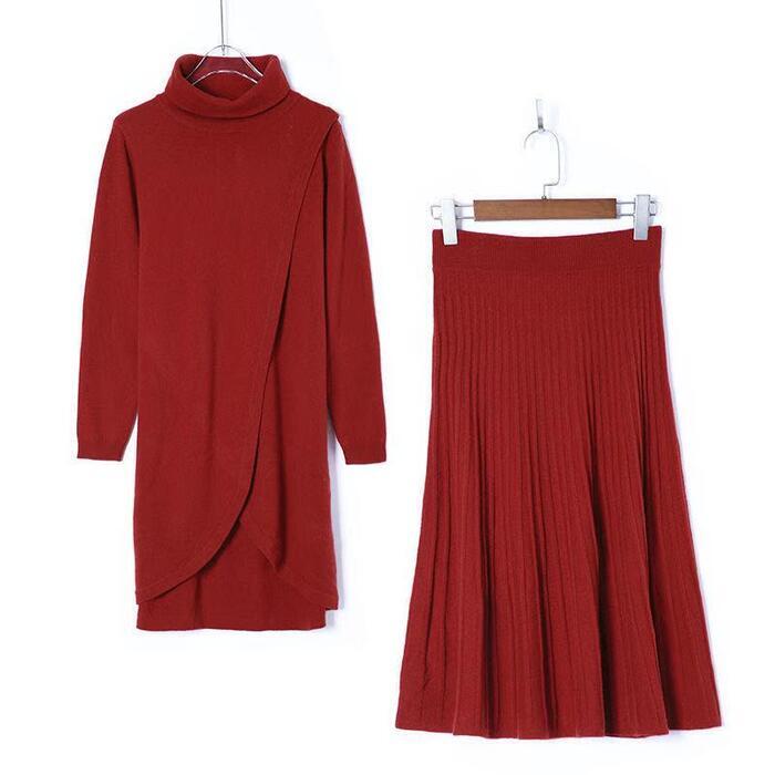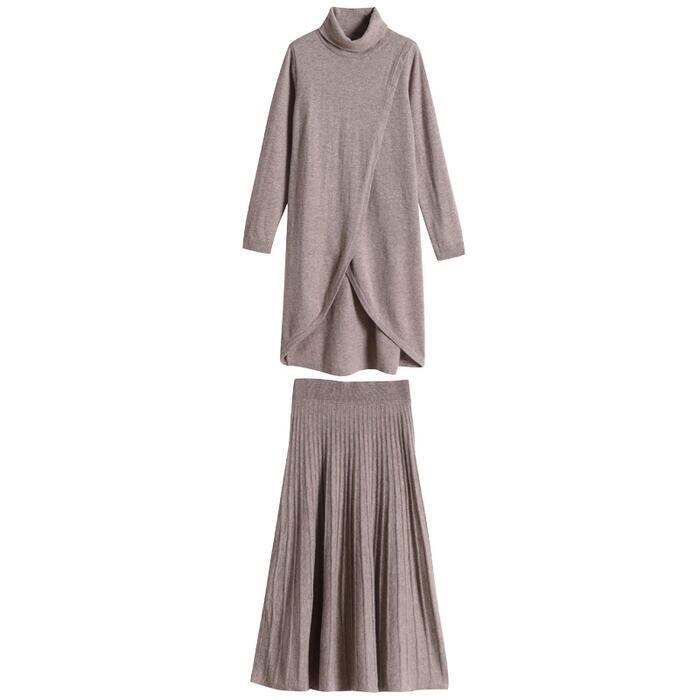 タートルネックのロングトップスとプリーツスカートのセットアップ。