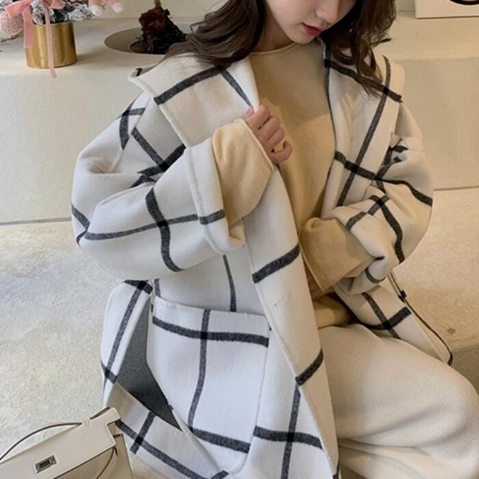 ウールで暖かいミドル丈チェックコート。