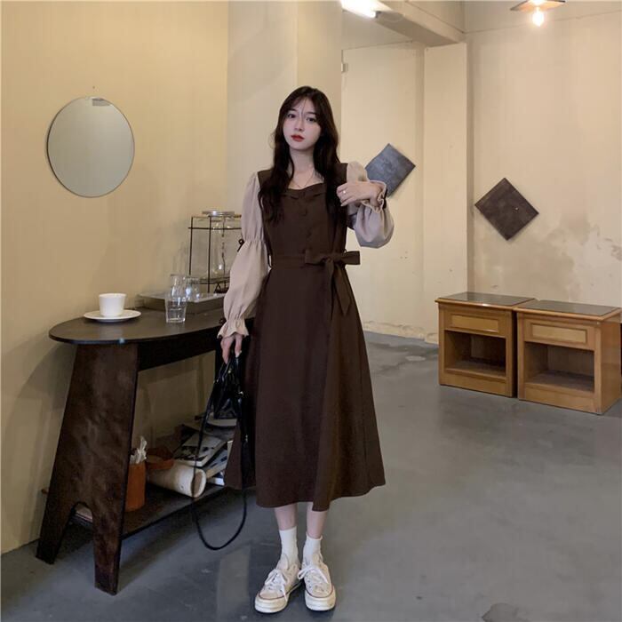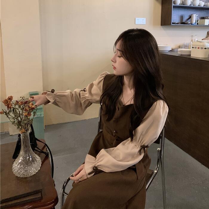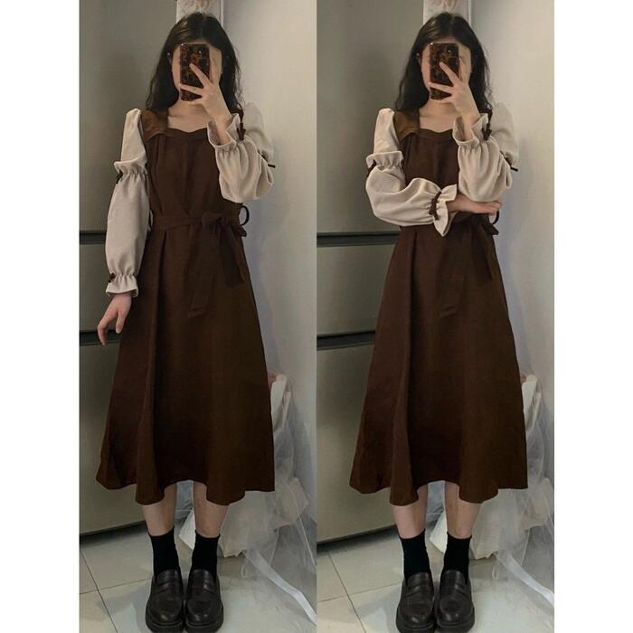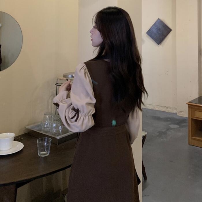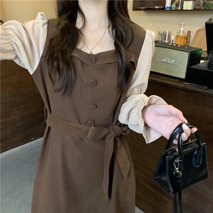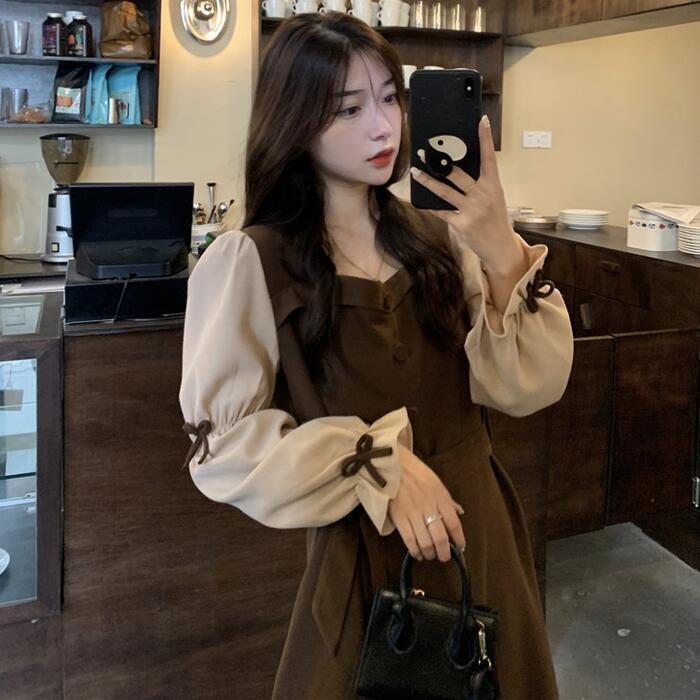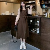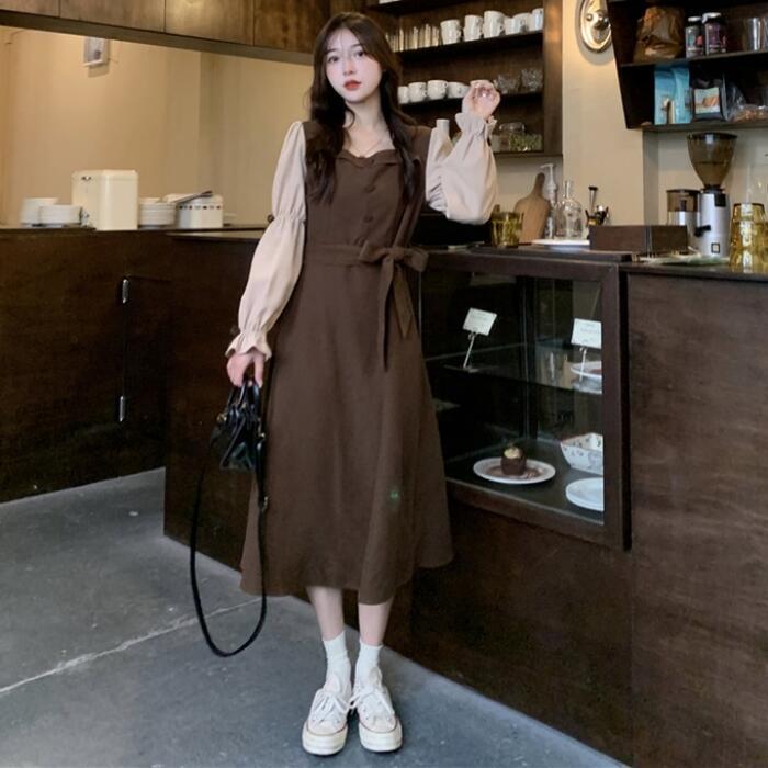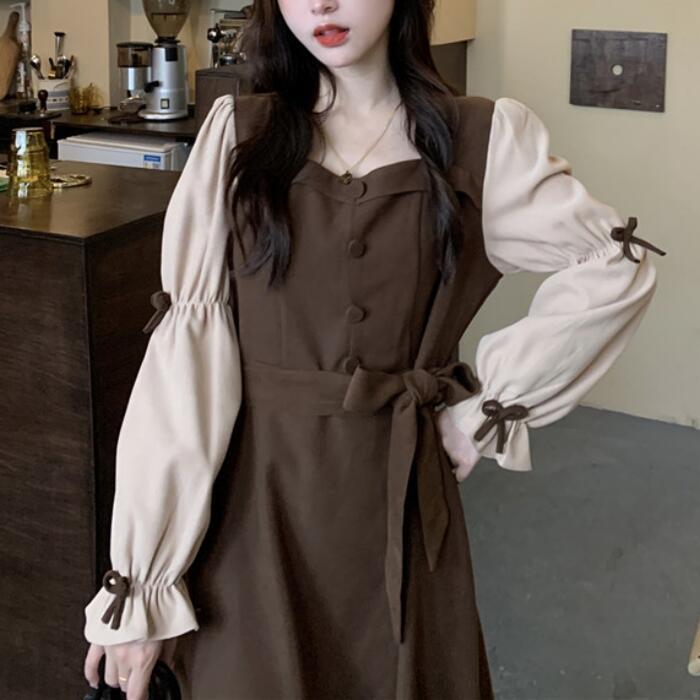 大きいサイズワンピース 切り替え 配色 袖あり リボン パフスリーブ エレガント レディース きれいめ カジュアル ミモレ丈 長袖 おしゃれ 大人 可愛い ガーリー Aライン ウエストリボン ハイウエスト ブラウン 春 秋 冬 20代 30代 40代 50代
