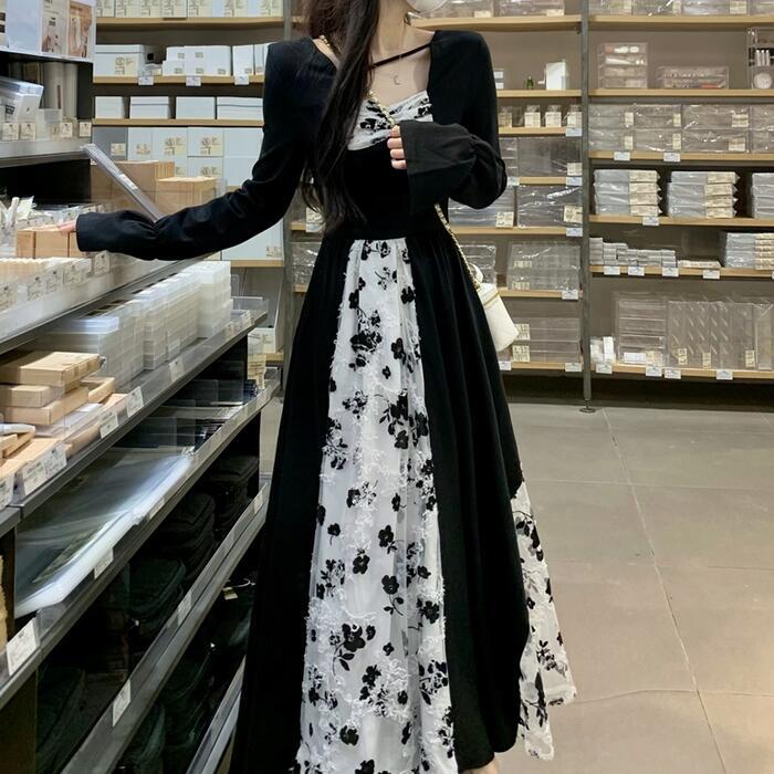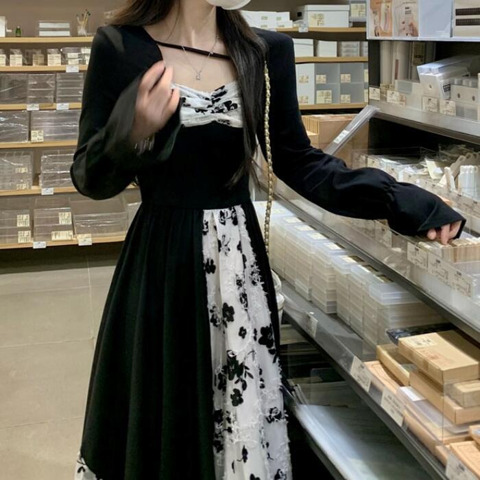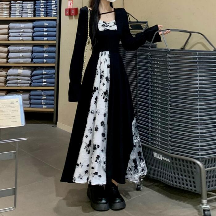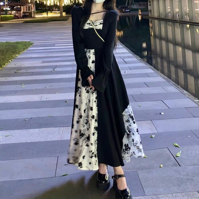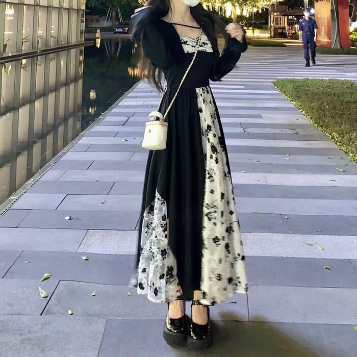 大きいサイズワンピース 切り替え 花柄 レース パフスリーブ エレガント レディース きれいめ カジュアル ロング丈 長袖 おしゃれ 大人 可愛い ガーリー クラシカル Aライン シャーリング ハイウエスト ブラック 黒 春 秋 冬 20代 30代 40代 50代