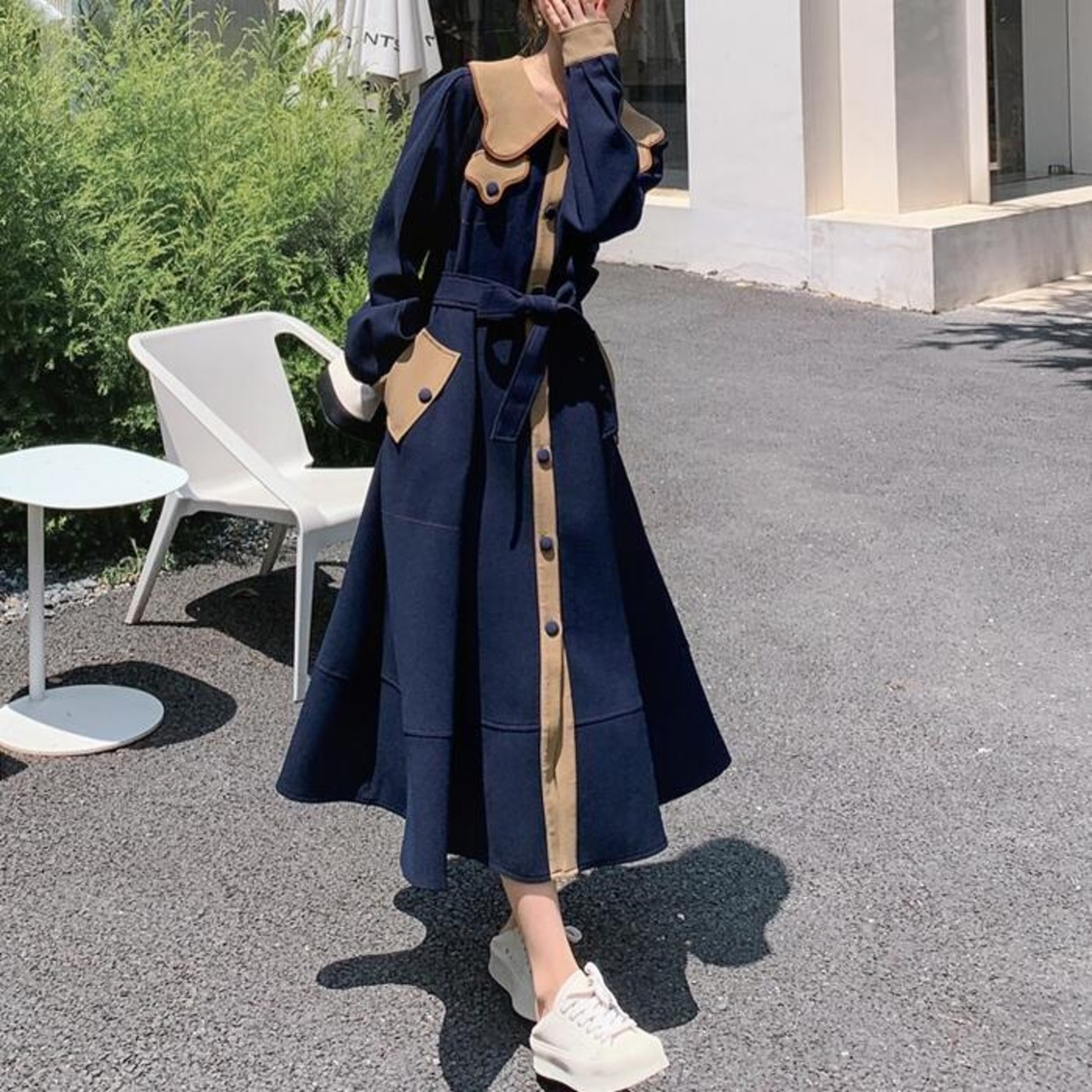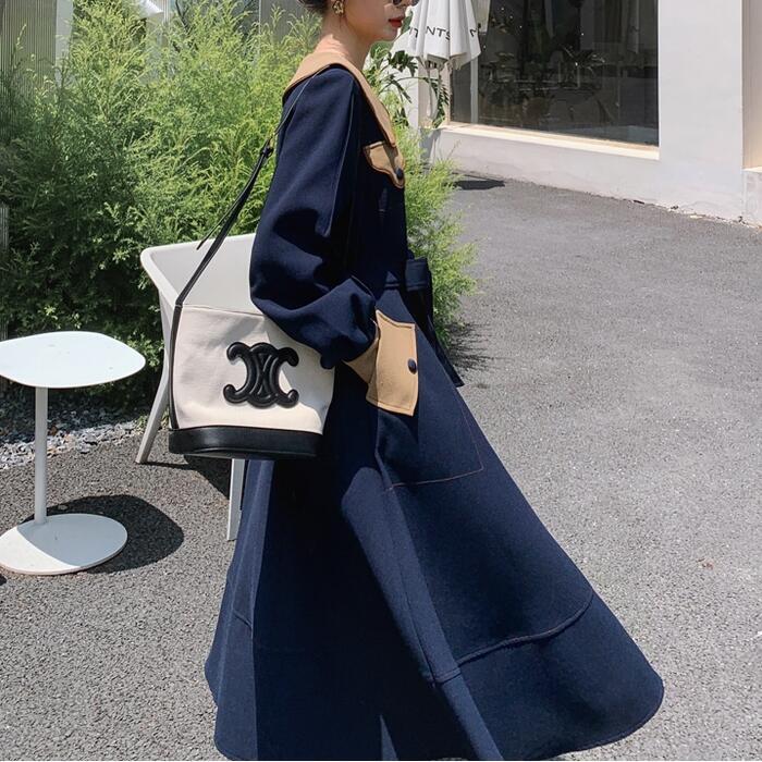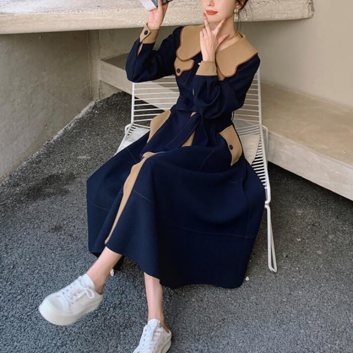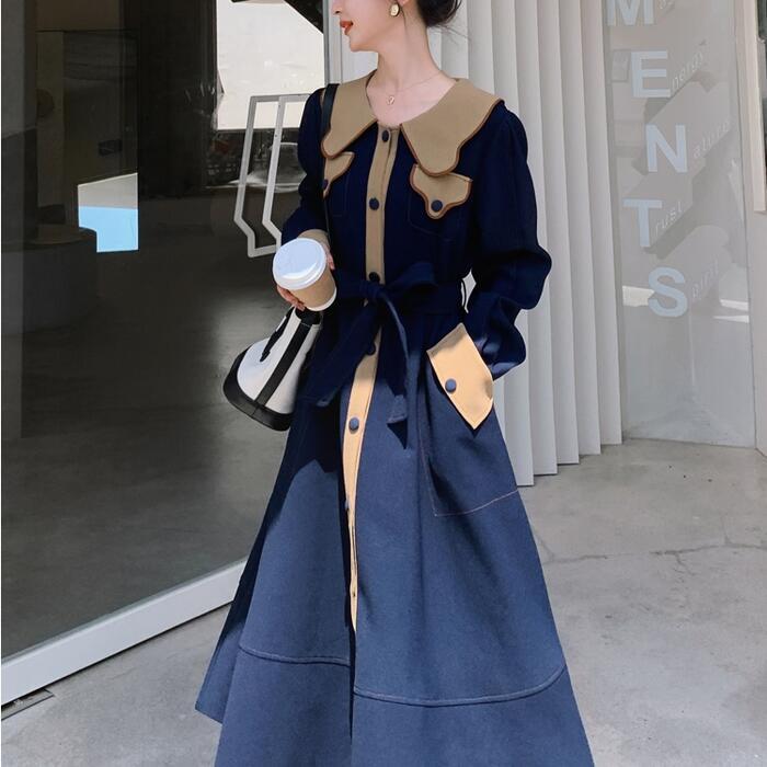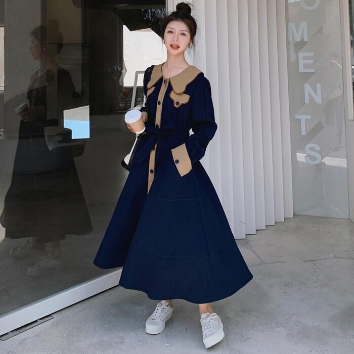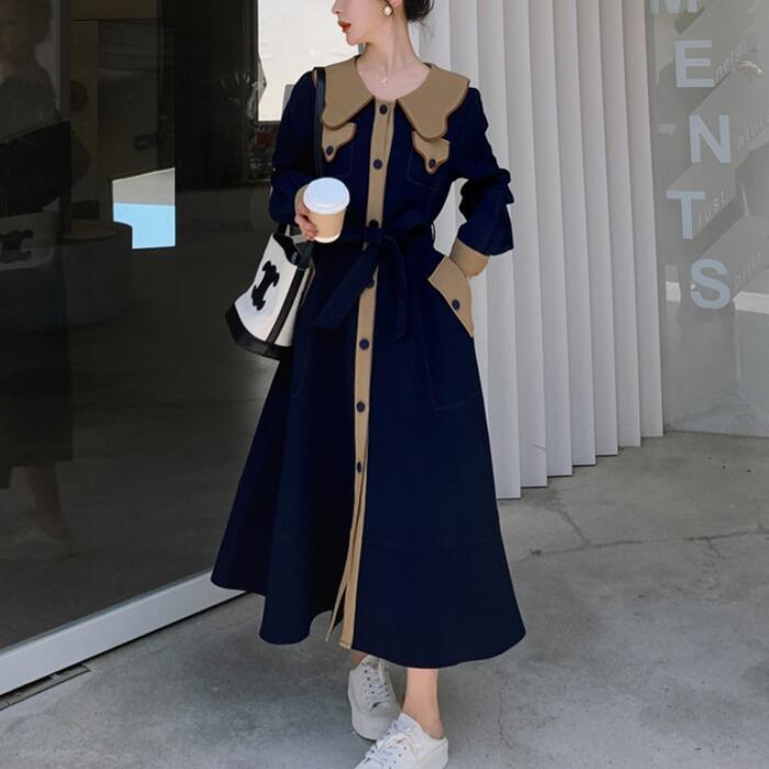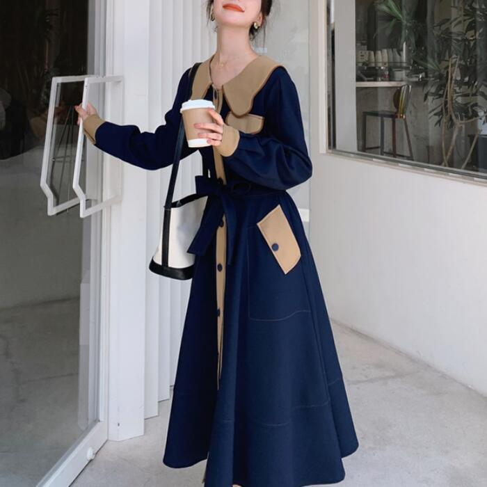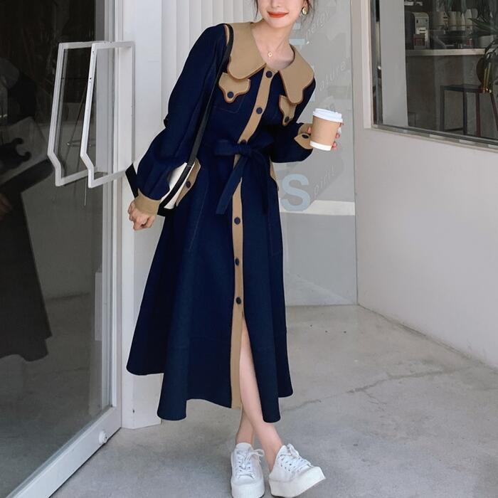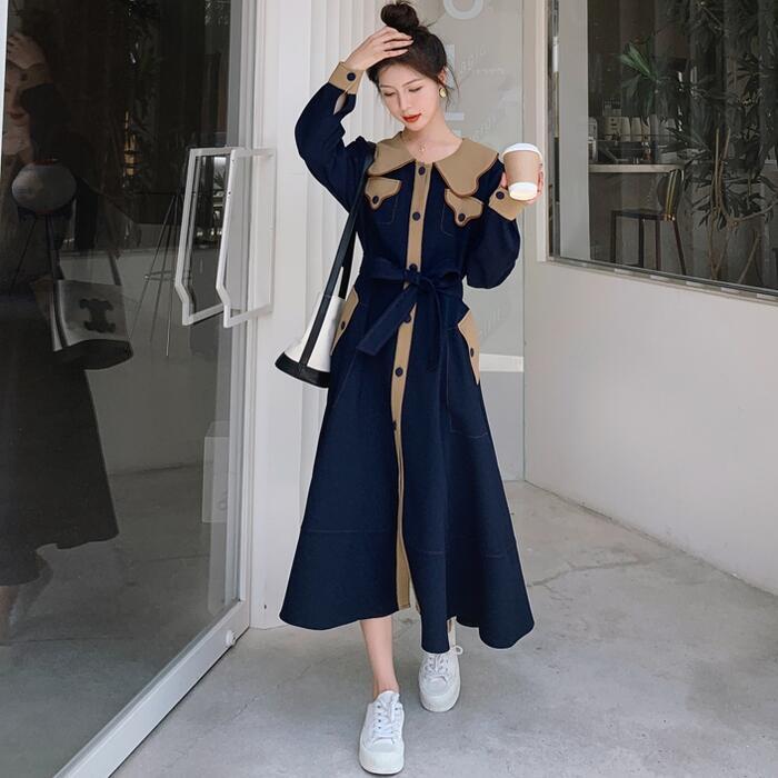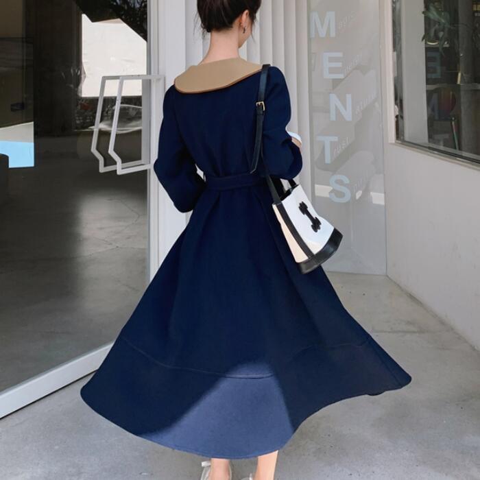 大きいサイズビッグカラー ワンピース コート ワンピ エレガント レディース きれいめ カジュアル ロングワンピ バイカラー ミモレ丈 おしゃれ 大人 可愛い ウエストリボン フェミニン 体型カバー ネイビー 春 秋 冬 20代 30代 40代 50代