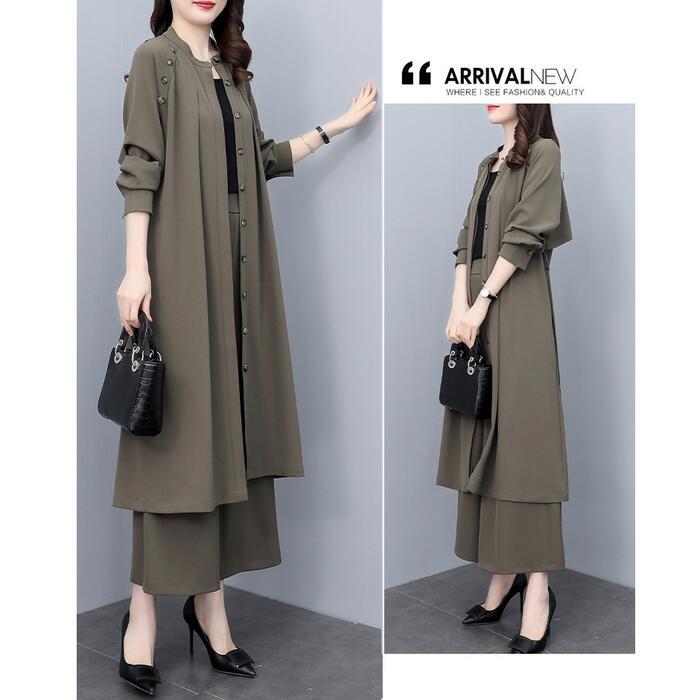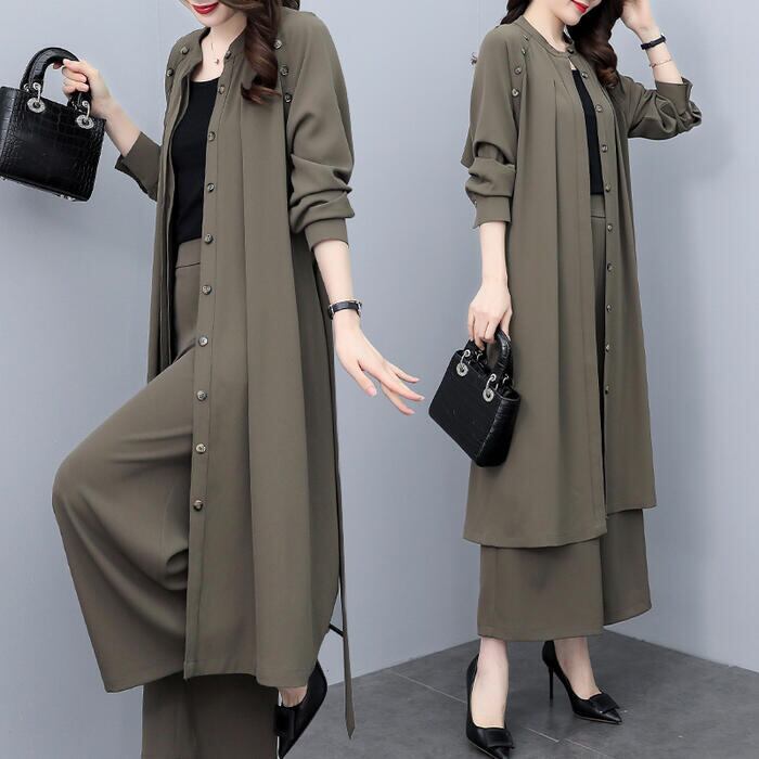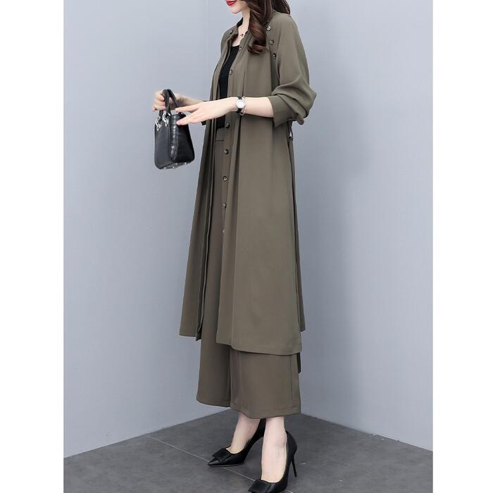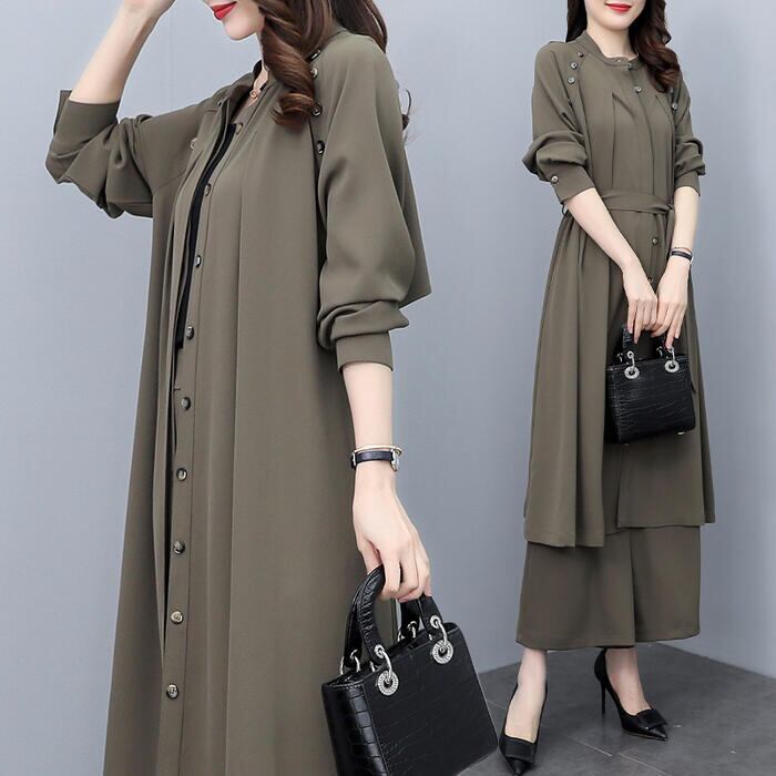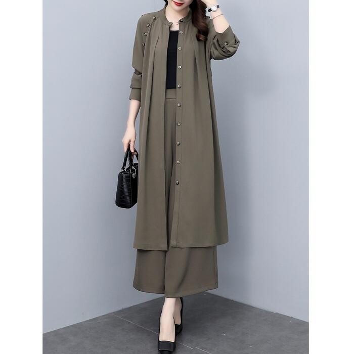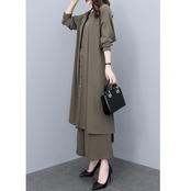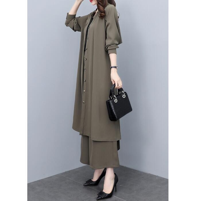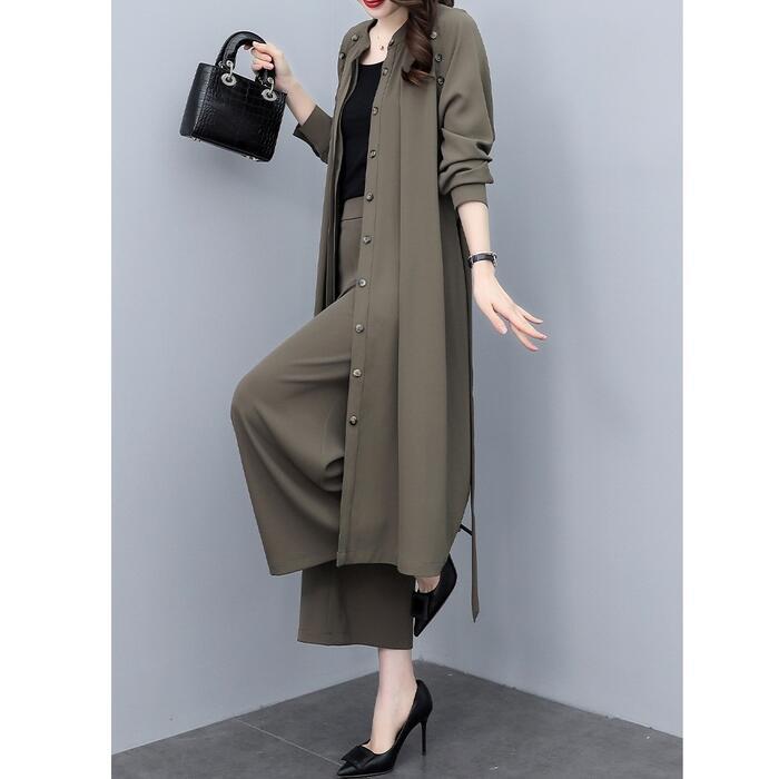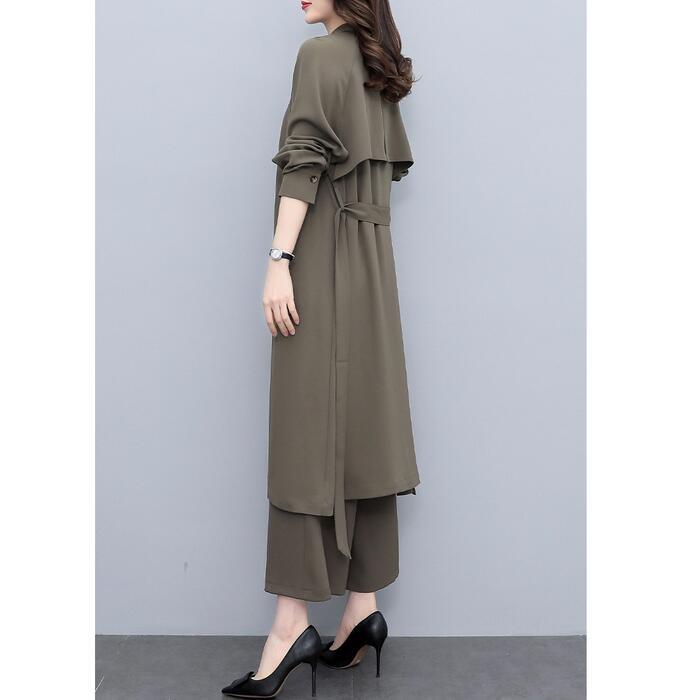 大きいサイズ 2点セットセットアップ コート ジャケット カーディガン パンツ ワイド ワンピース エレガント レディース きれいめ カジュアル 長袖 おしゃれ 大人 可愛い かっこいい ウエストベルト 体型カバー カーキ 春 秋 冬 20代 30代 40代 50代
