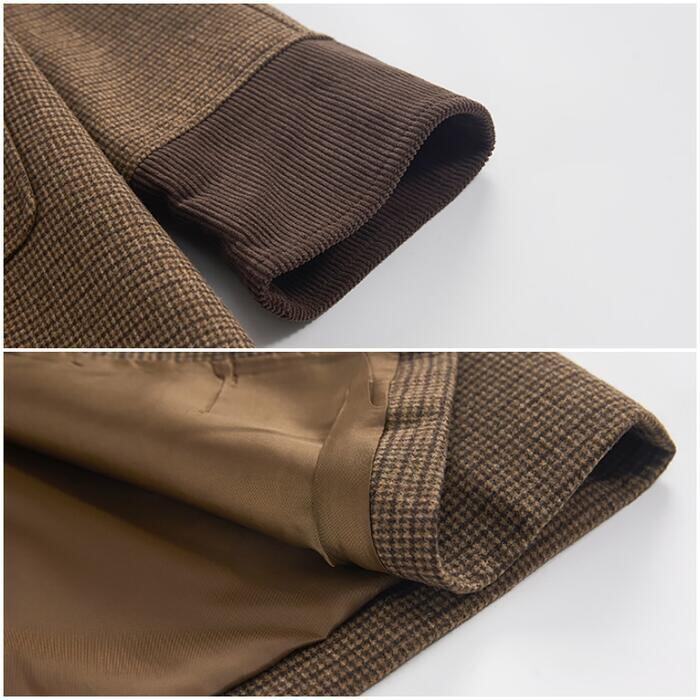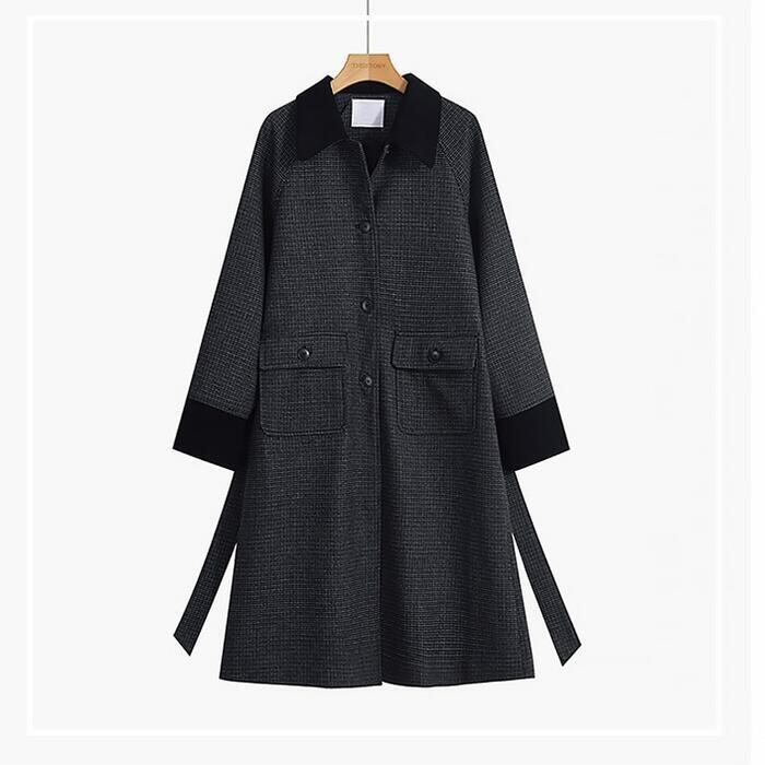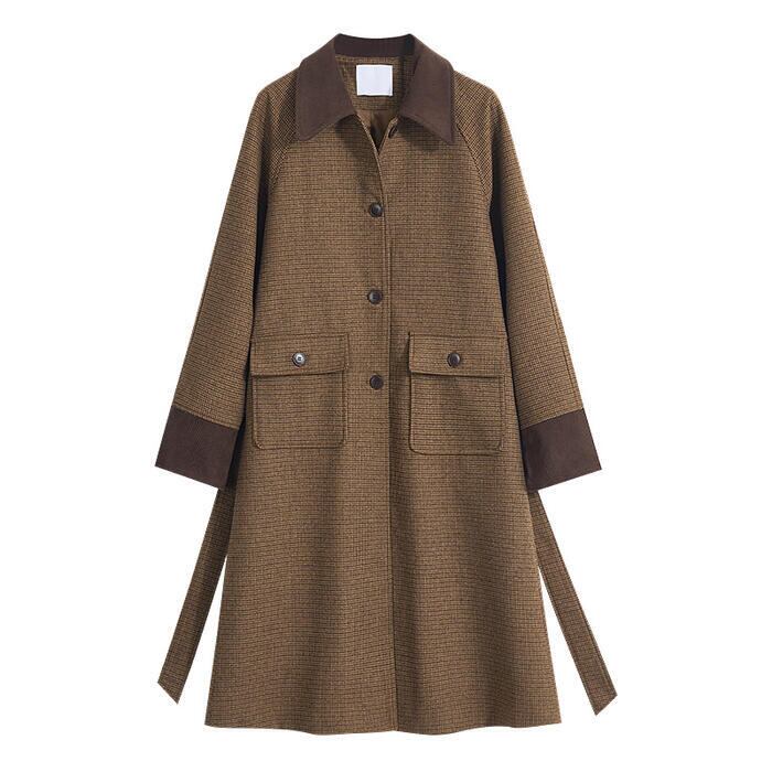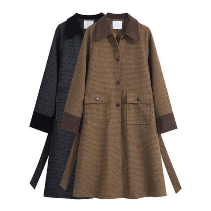 全2色 コート アウター トラッド 千鳥格子 ステンカラー コーデュロイ レディース きれいめ カジュアル おしゃれ 大人 可愛い 暖かい ロング丈 Aライン ウエストベルト 体型カバー シンプル チェック ブラウン ブラック 黒 春 秋 冬 20代 30代 40代 50代