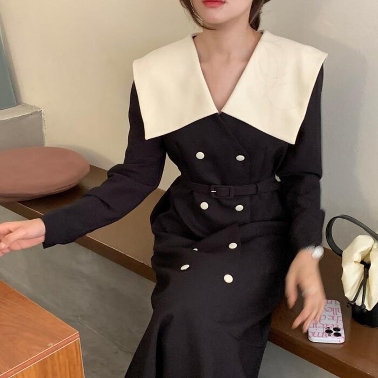 ビッグカラー ワンピース バイカラー 袖あり レディース エレガント きれいめ カジュアル 長袖 セーラーカラー ロングワンピ ロング丈 おしゃれ 大人 可愛い ハイウエスト クラシカル フェミニン ブラック 黒 春 秋 冬 20代 30代 40代 50代