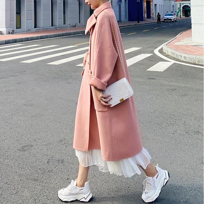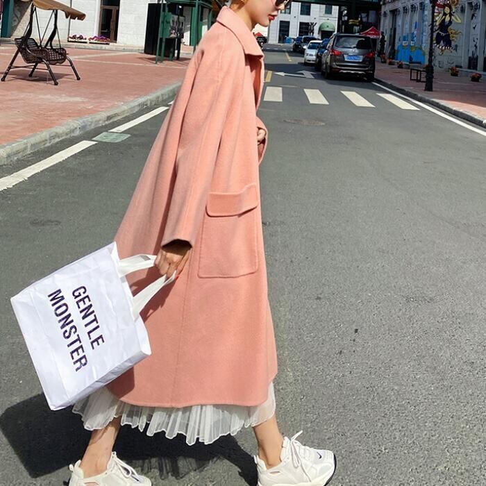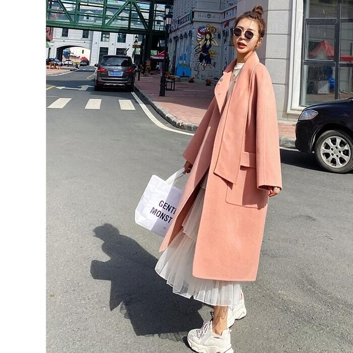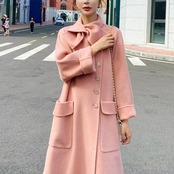 大人可愛いピンクが目を惹くロングコート。