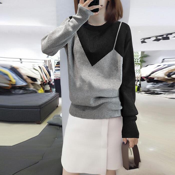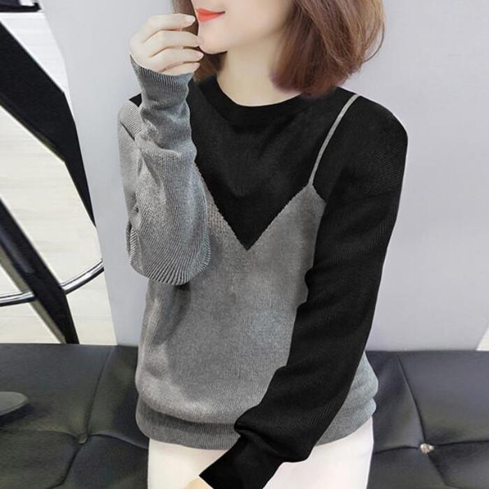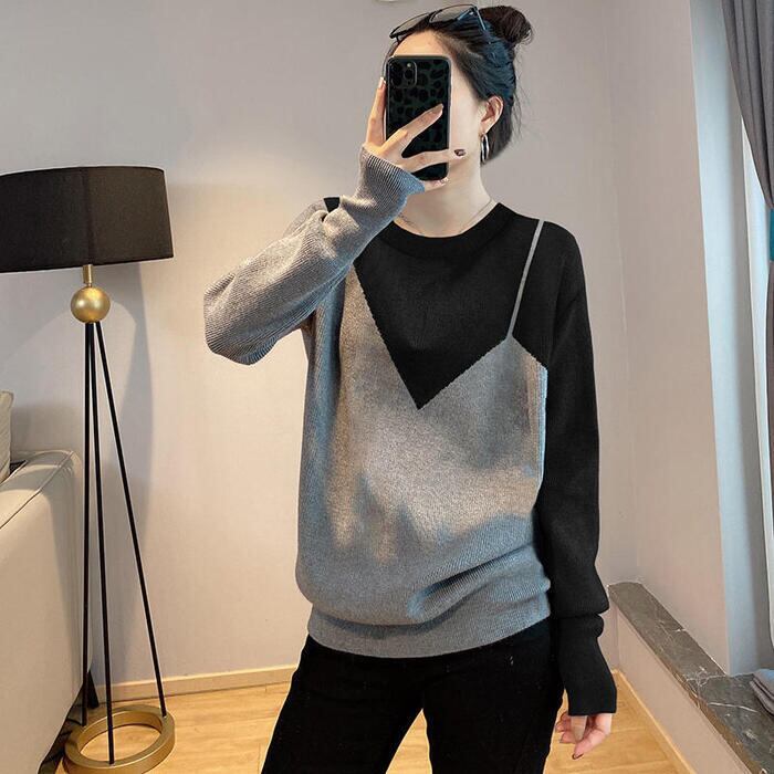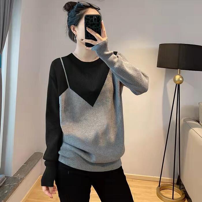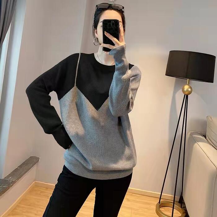 トップス ニット セーター レディース きれいめ エレガント カジュアル クルーネック バイカラー おしゃれ 長袖 大人 可愛い フェミニン モード 切り替え ゆったり 体型カバー 大きいサイズ グレー 春 秋 冬 20代 30代 40代 50代