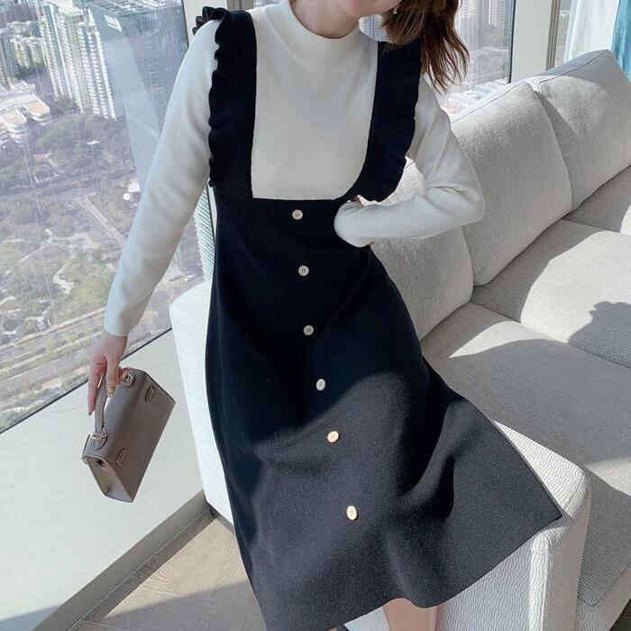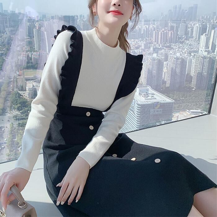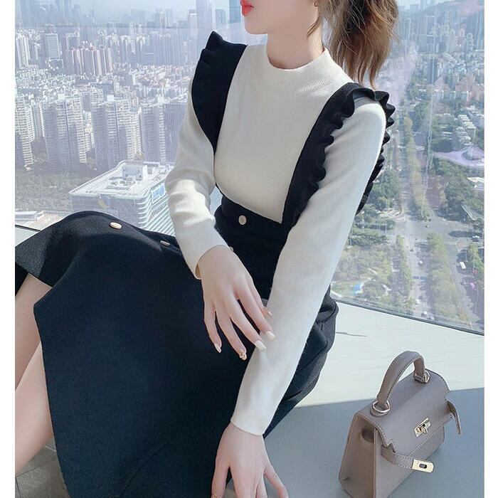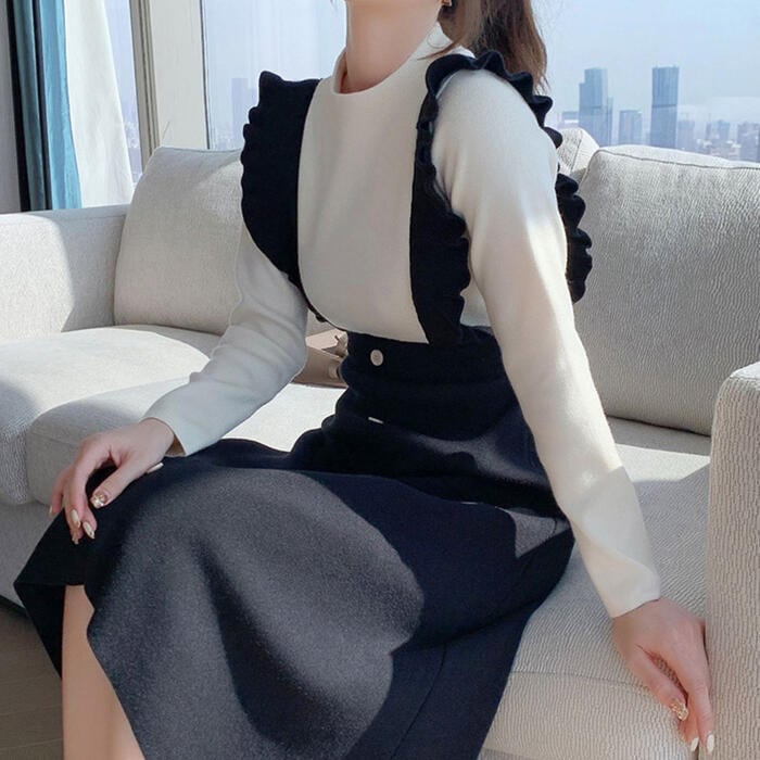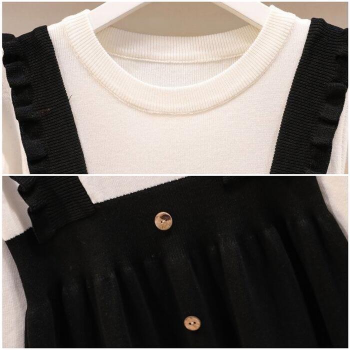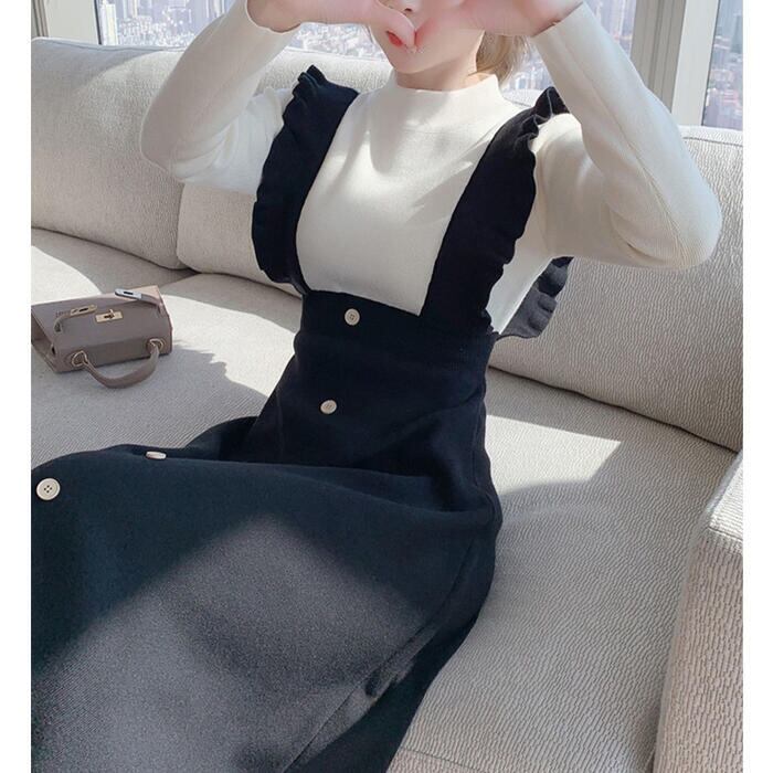 ワンピース レイヤード風 ニット ロングワンピ モックネック ワンピ ドレス 袖あり レディース きれいめ カジュアル バイカラー ミモレ丈 長袖 おしゃれ 大人 可愛い フェミニン ブラック 黒 春 秋 冬 20代 30代 40代 50代