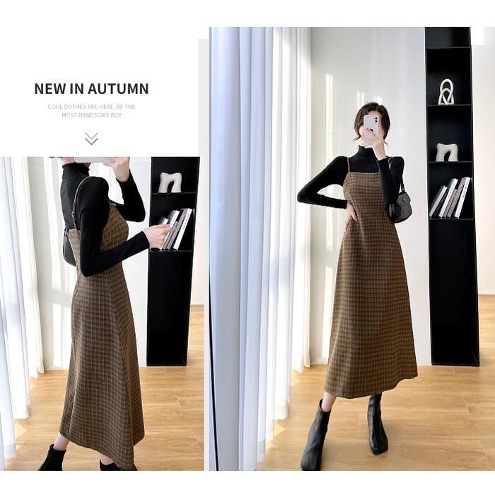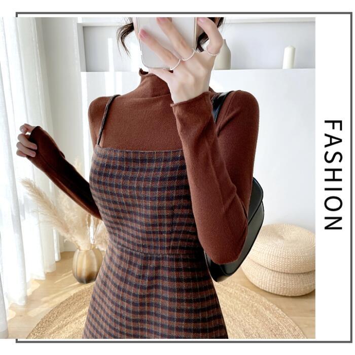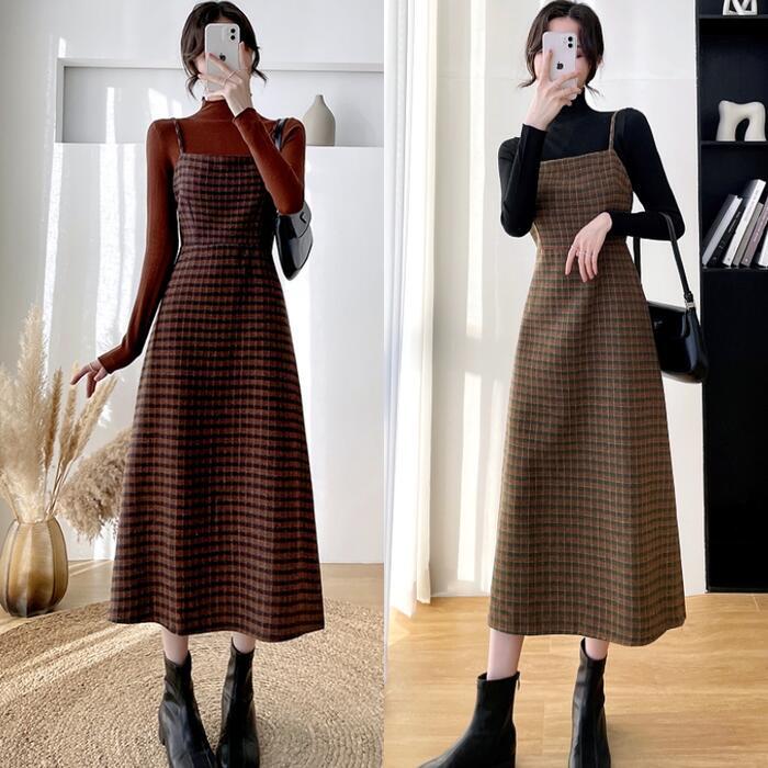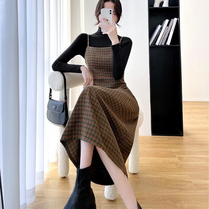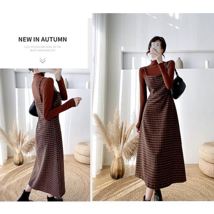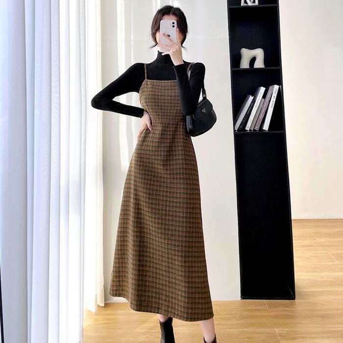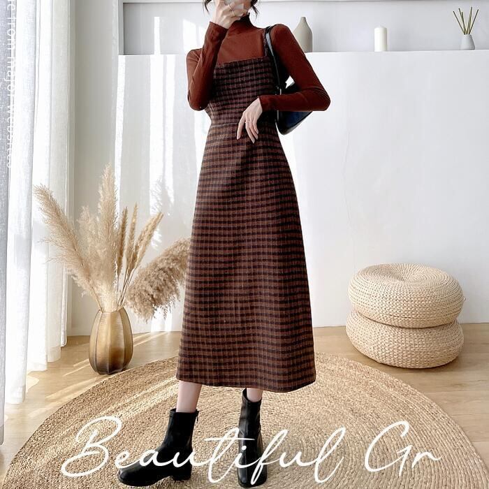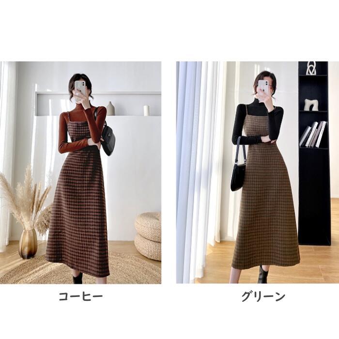 全2色 大きいサイズ 2点セットセットアップ トップス ワンピース キャミワンピ チェック ジャンパースカート タートルネック レディース きれいめ カジュアル 長袖 ミモレ丈 Aライン おしゃれ 大人 可愛い ブラウン グリーン 緑 春 秋 冬 20代 30代 40代 50代