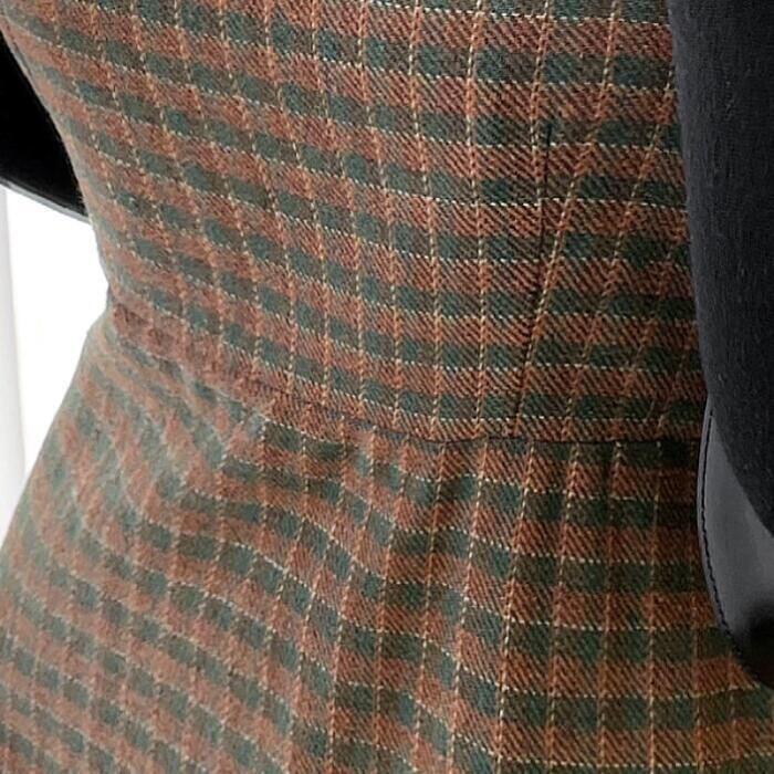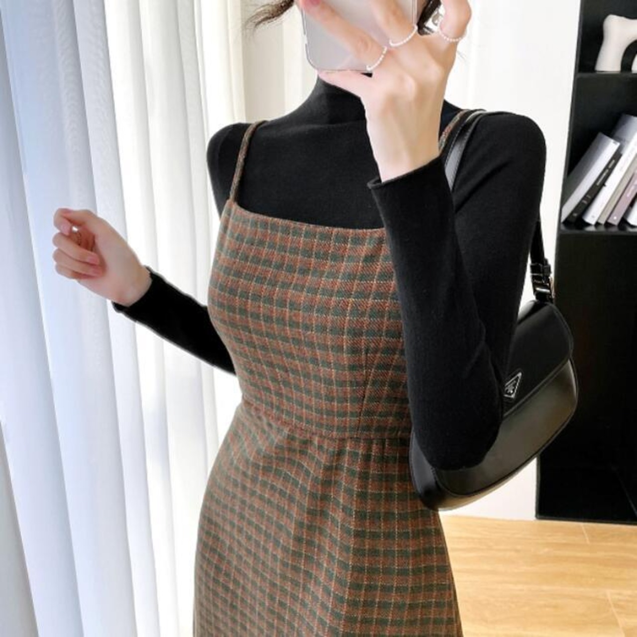 タートルニット&チェック柄ジャンパースカートのセットアップ。