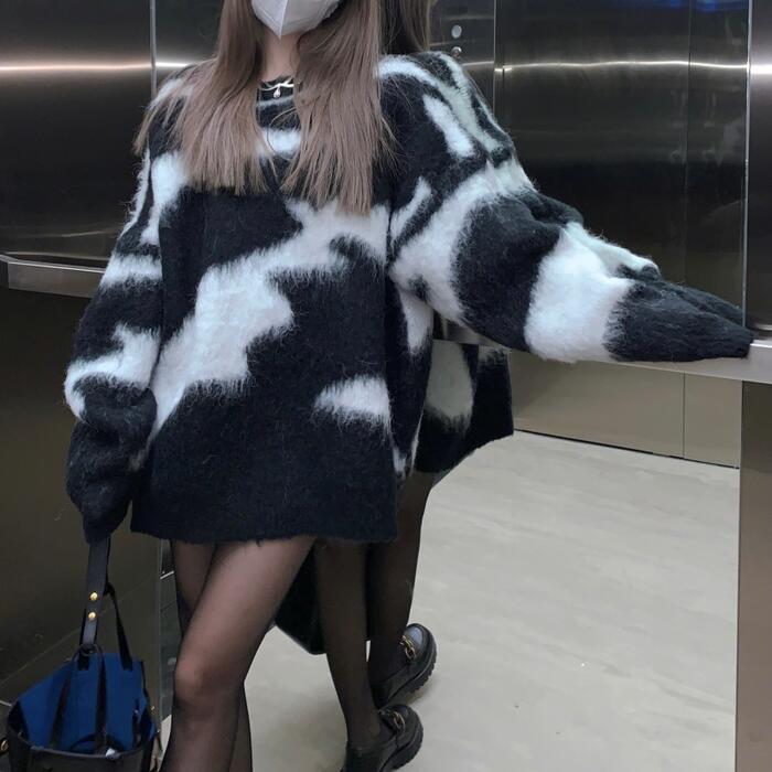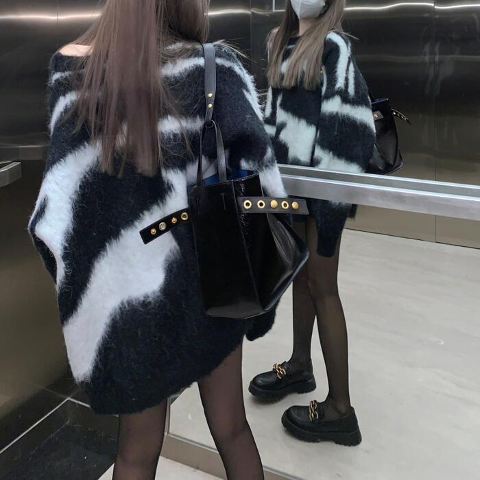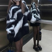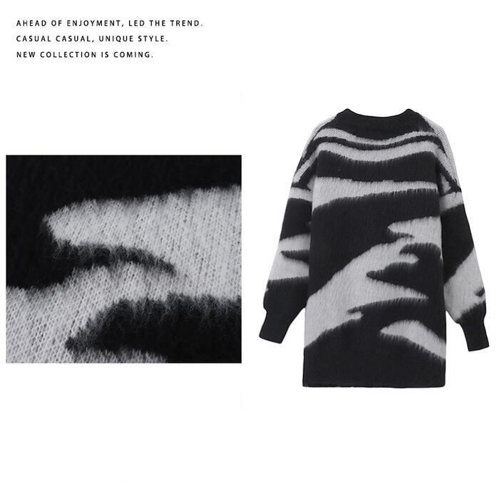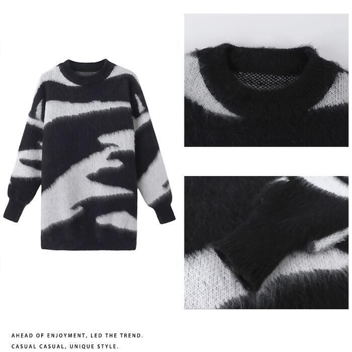 大きいサイズトップス ニット セーター ゼブラ アニマル レディース シャギー きれいめ カジュアル クルーネック おしゃれ 長袖 大人 可愛い フェミニン ナチュラル ゆったり 体型カバー ホワイト 白 ブラック 黒 春 秋 冬 20代 30代 40代 50代
