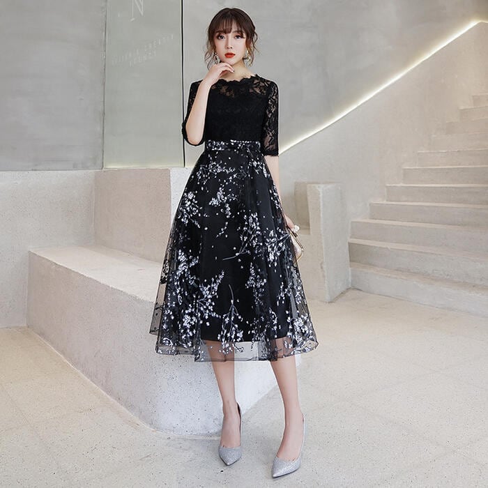 トップスは総レース、スカート部分にチュールを重ねた華やかなワンピース。