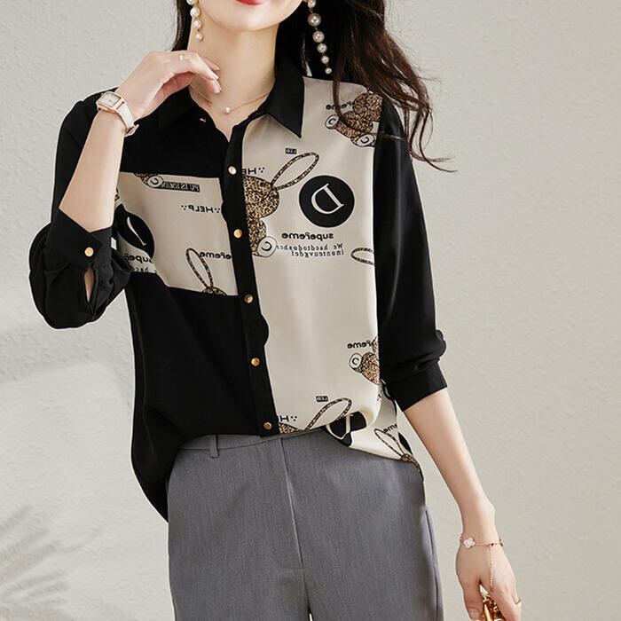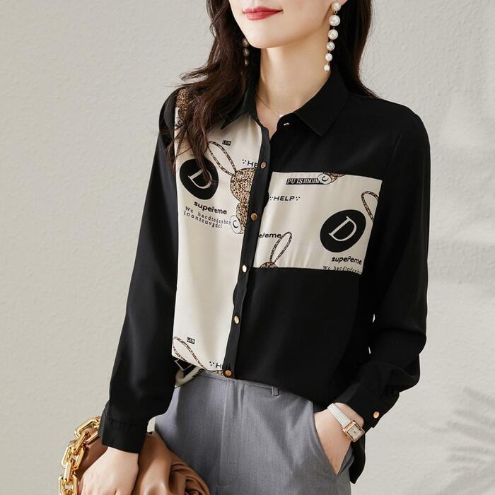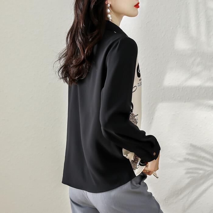 全2色 大きいサイズトップス シャツ ブラウス プリント レディース エレガント きれいめ カジュアル おしゃれ 長袖 大人 可愛い シフォン フェミニン アシンメトリー 切り替え ホワイト 白 ブラック 黒 春 秋 冬 20代 30代 40代 50代