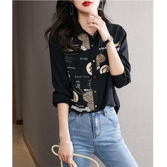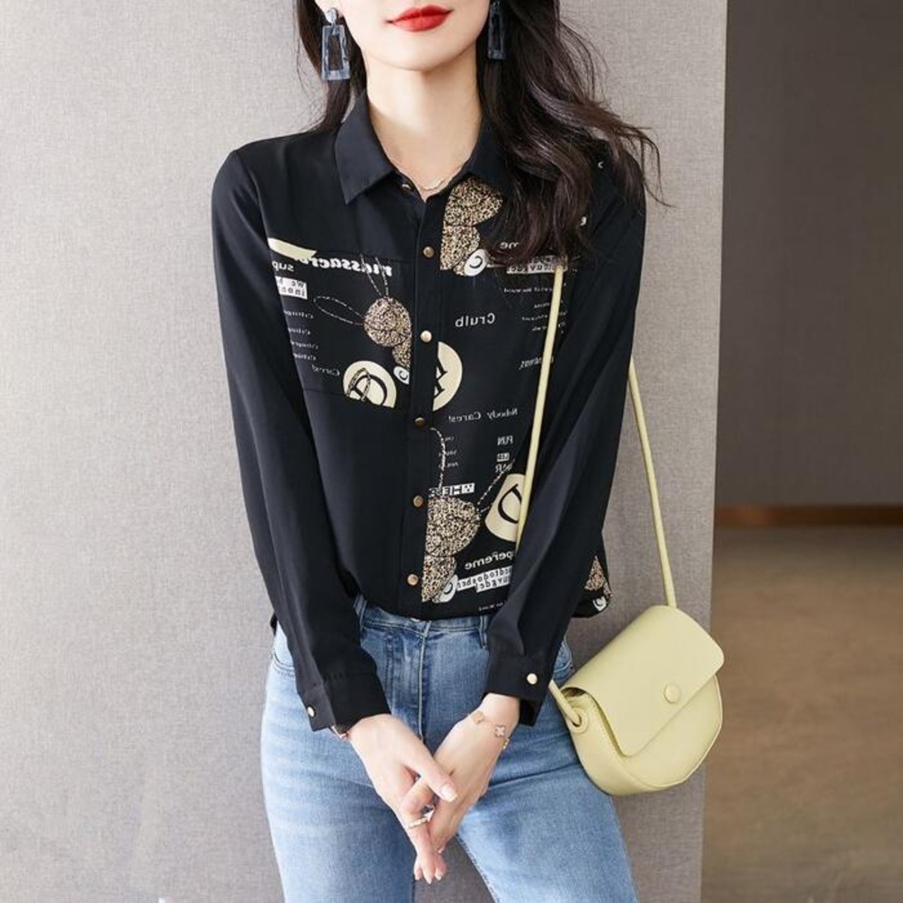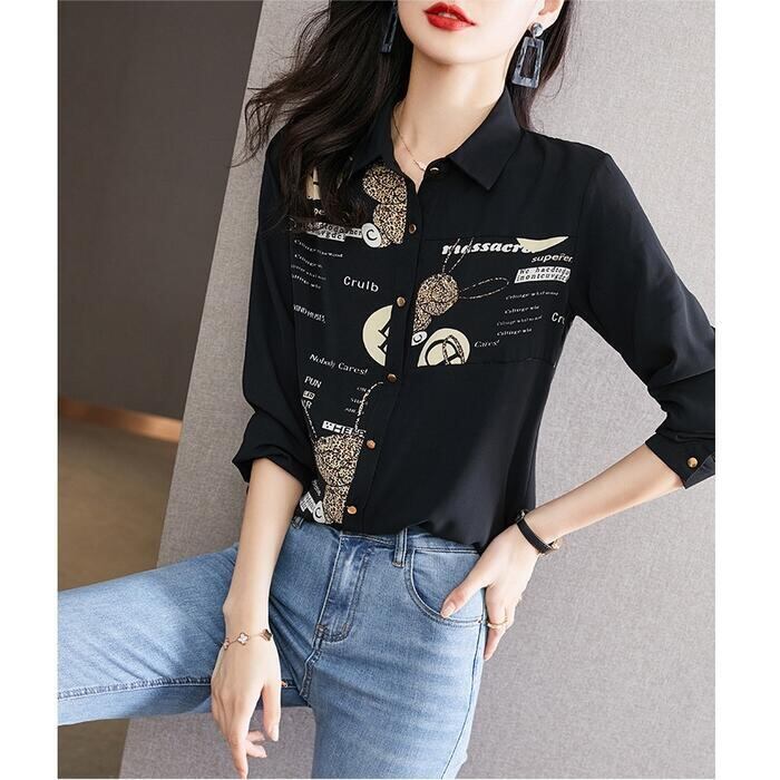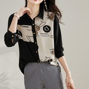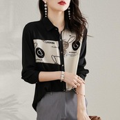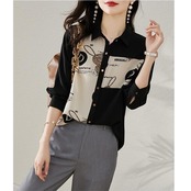 プリント柄のアシメ切り替えがおしゃれなシフォンシャツ。