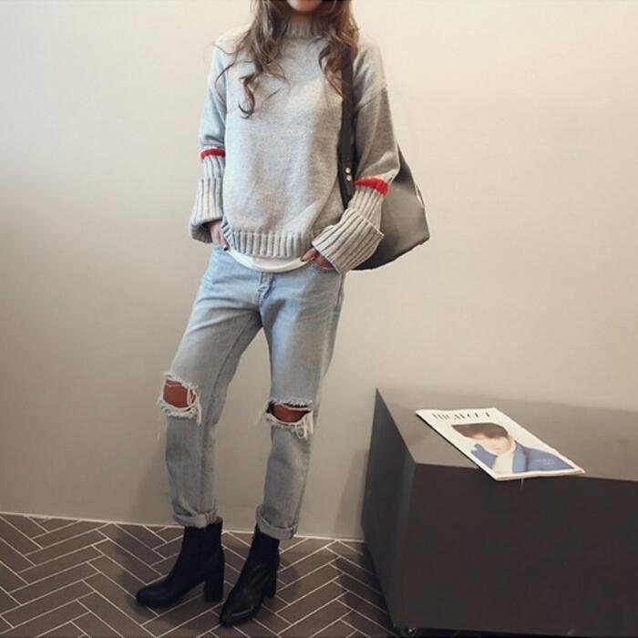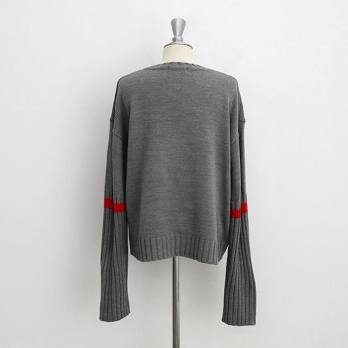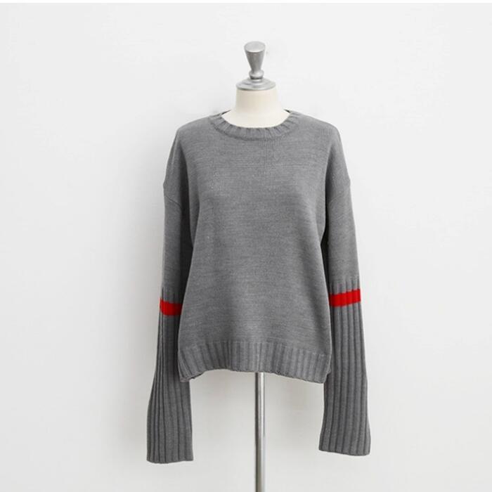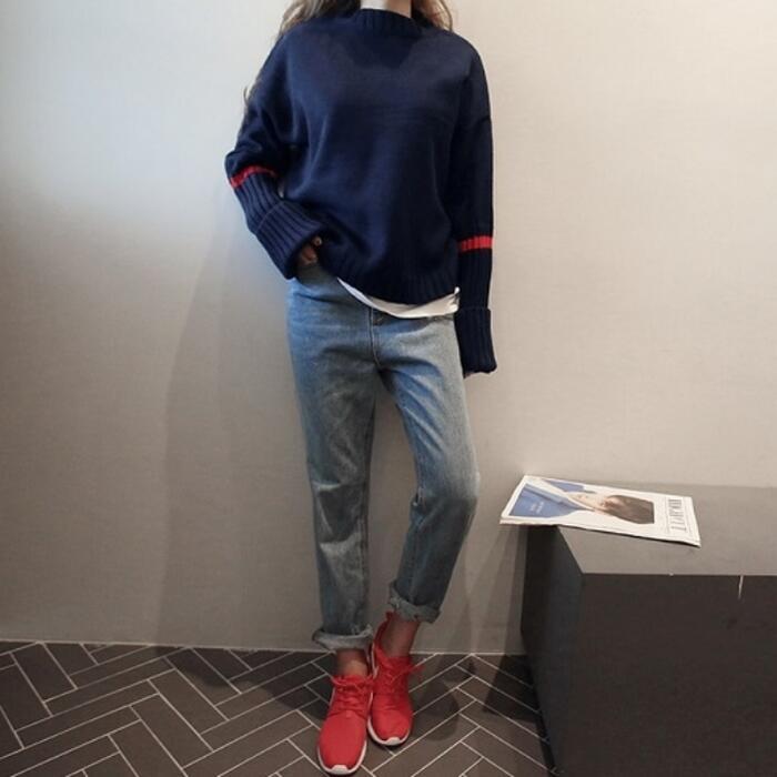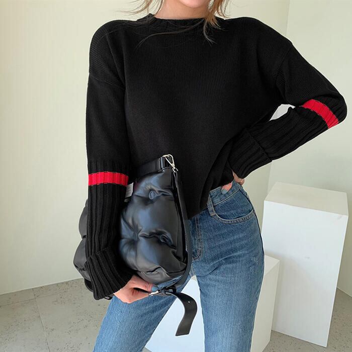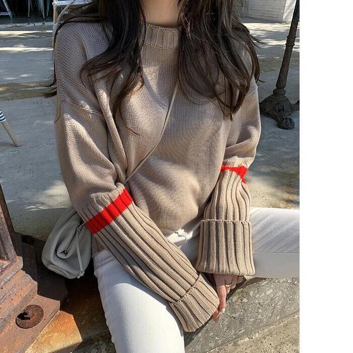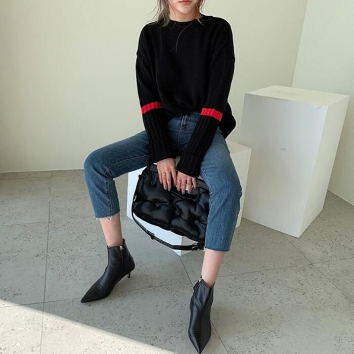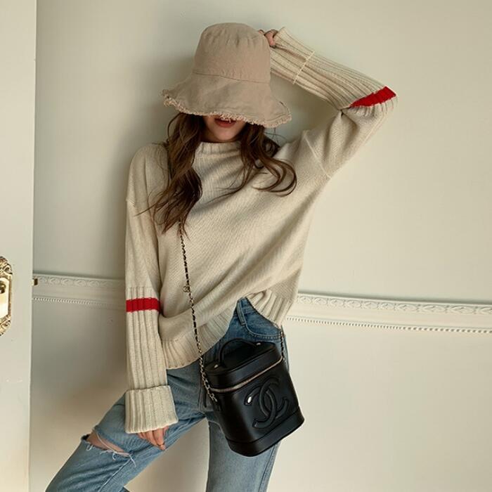 リブ切り替えと配色ラインがアクセントになったニットトップス。