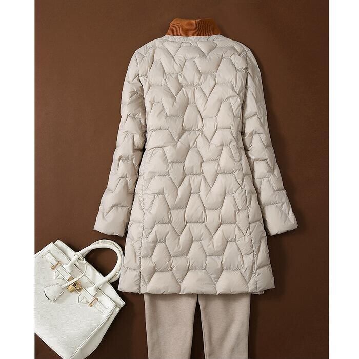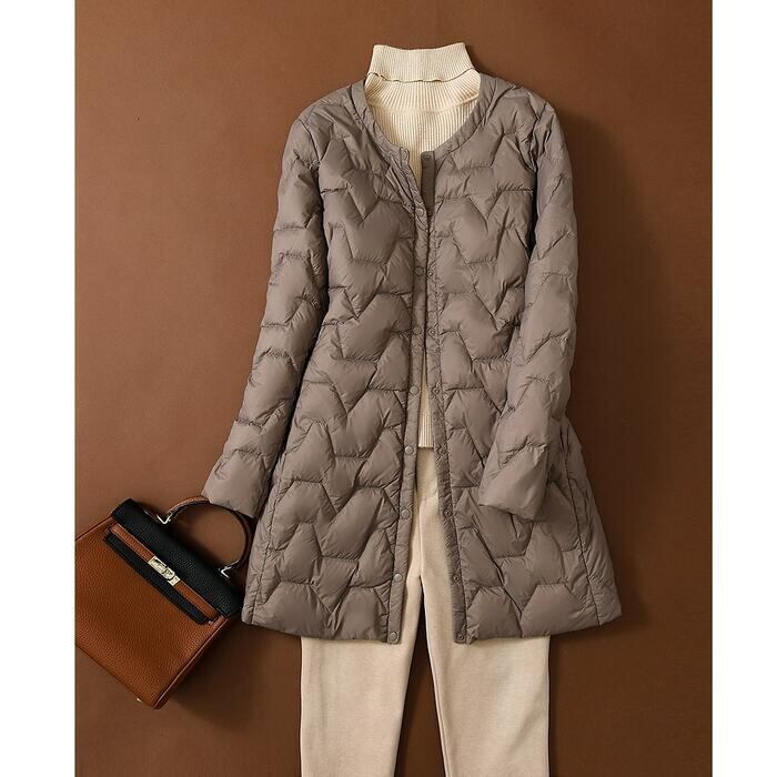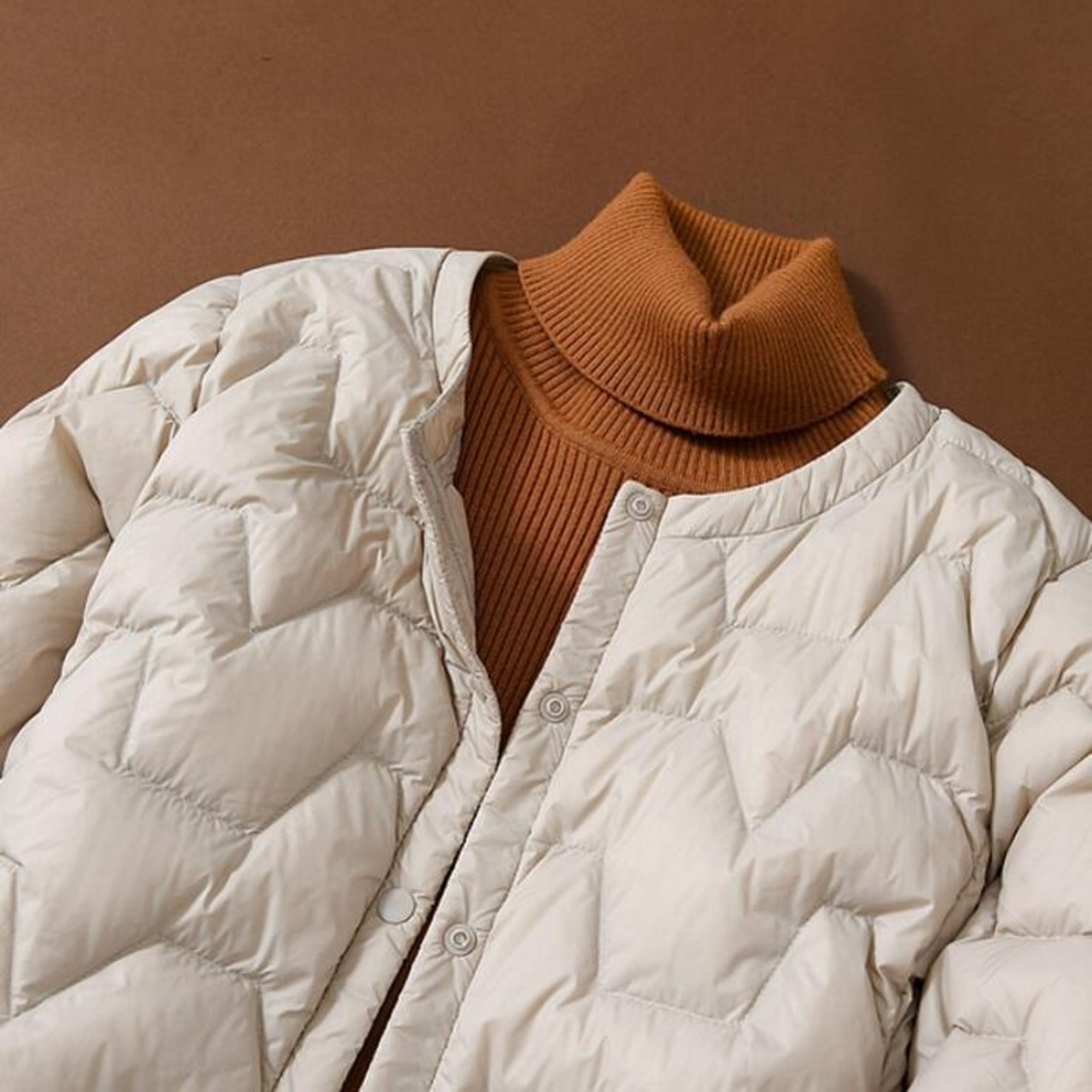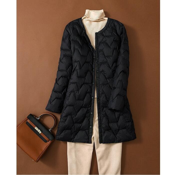 すっきりとしたノーカラーで、フードやタートルネックのインナーにも使いやすいアイテムです♪