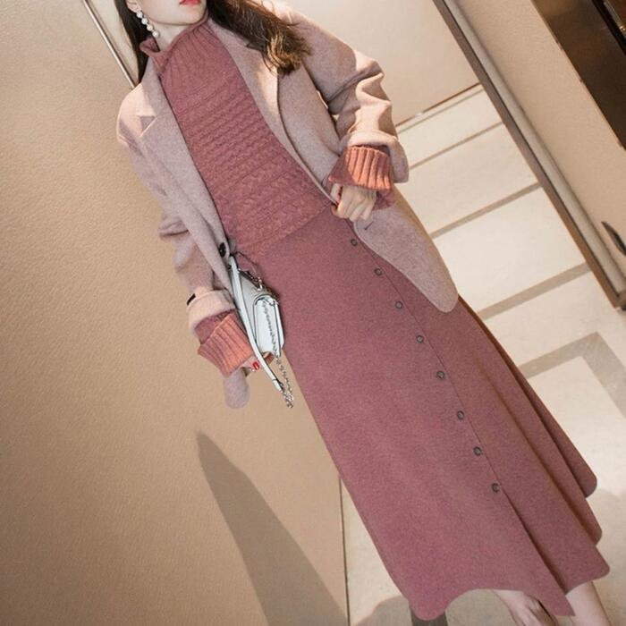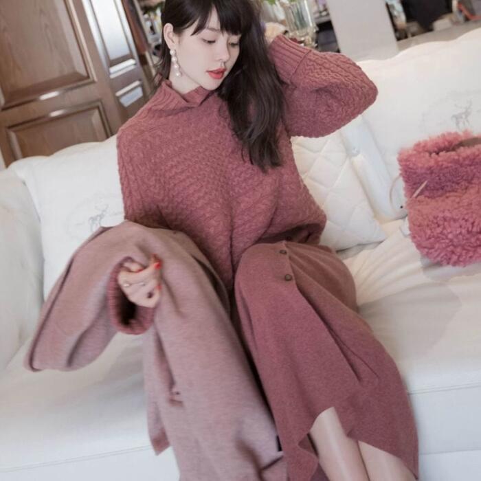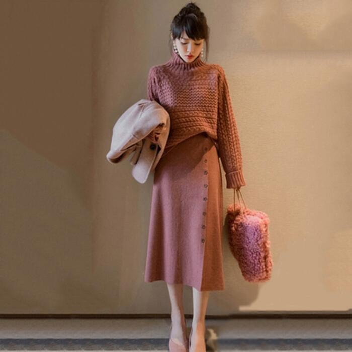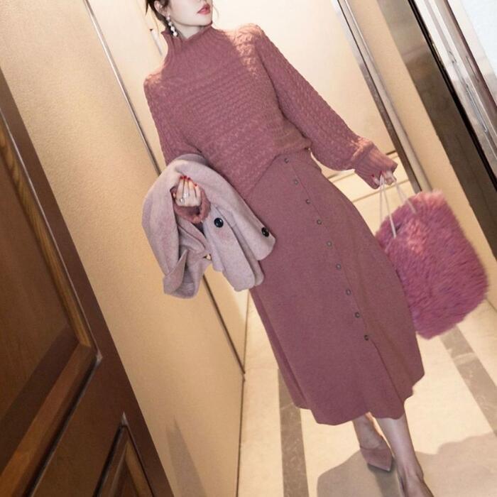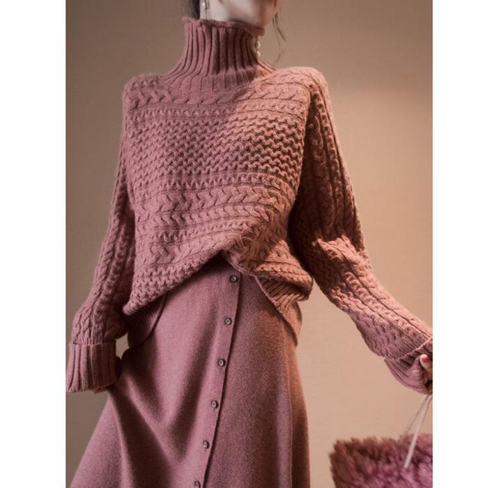 2点セットセットアップ トップス スカート ニット タートルネック 長袖 ミモレ丈 レディース きれいめ カジュアル おしゃれ 大人 可愛い フェミニン シンプル ゆったり 体型カバー 暖かい 大きいサイズ ピンク 春 秋 冬 20代 30代 40代 50代