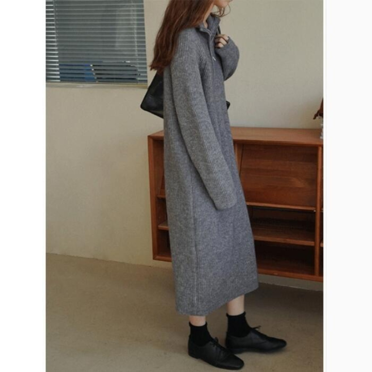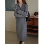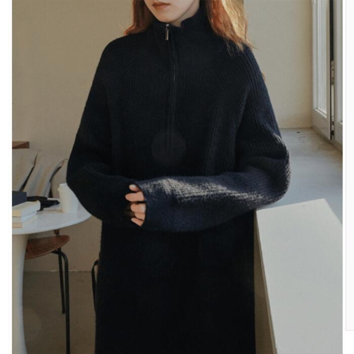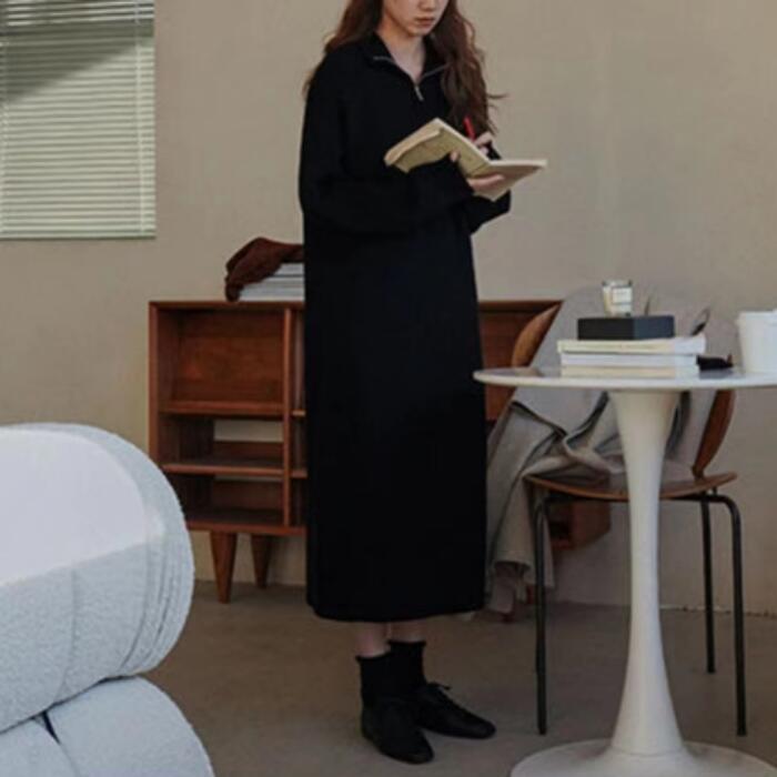 襟もとの雰囲気を変えられるハーフジップのニットワンピース。