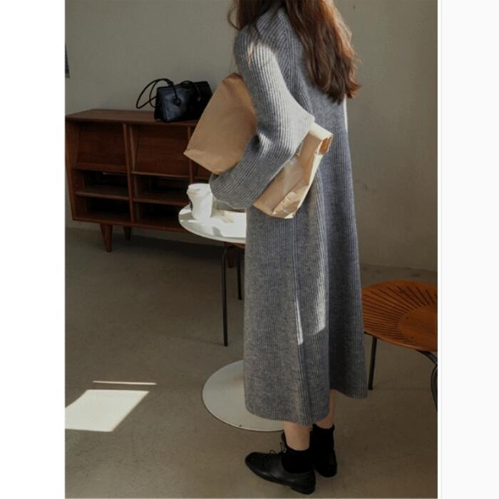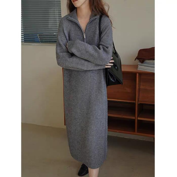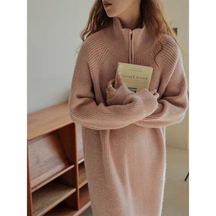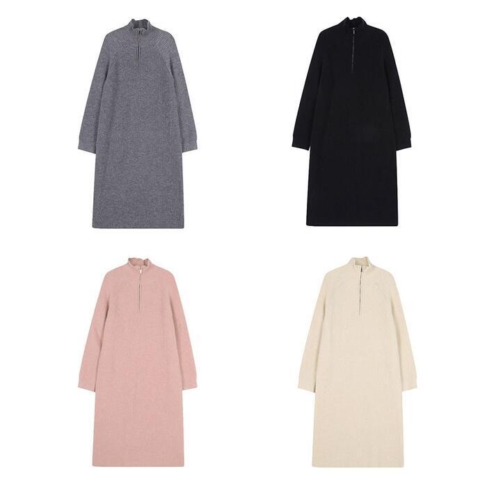 全4色 大きいサイズワンピース ニット ハーフジップ ハイネック レディース きれいめ カジュアル おしゃれ 長袖 大人 可愛い フェミニン ミモレ丈 ナチュラル ゆったり 体型カバー 韓国 グレー ホワイト 白 ピンク ブラック 黒 春 秋 冬 20代 30代 40代 50代