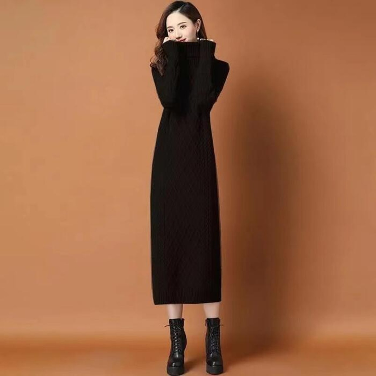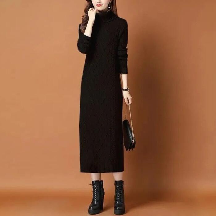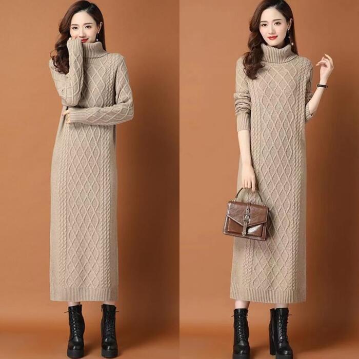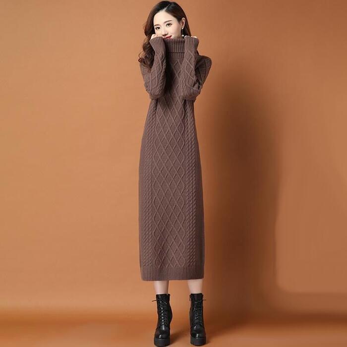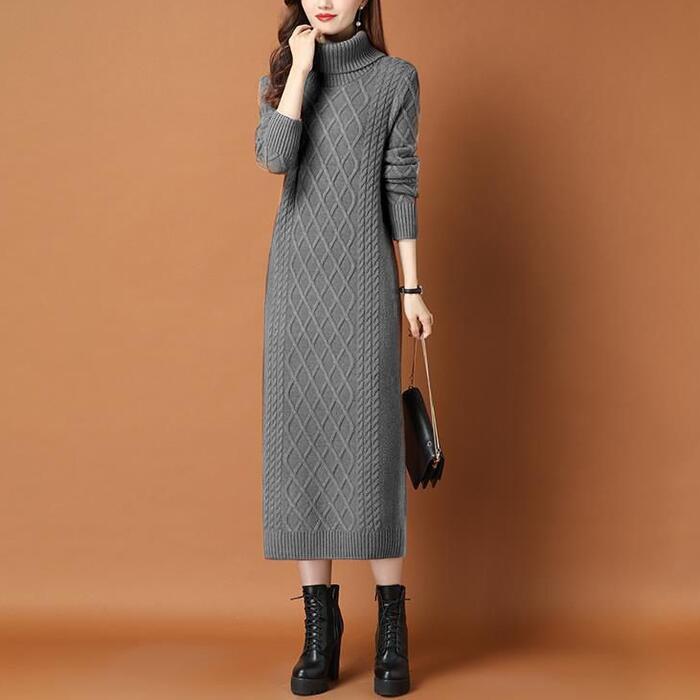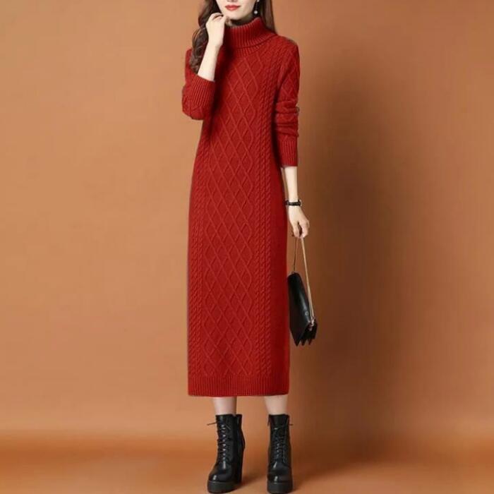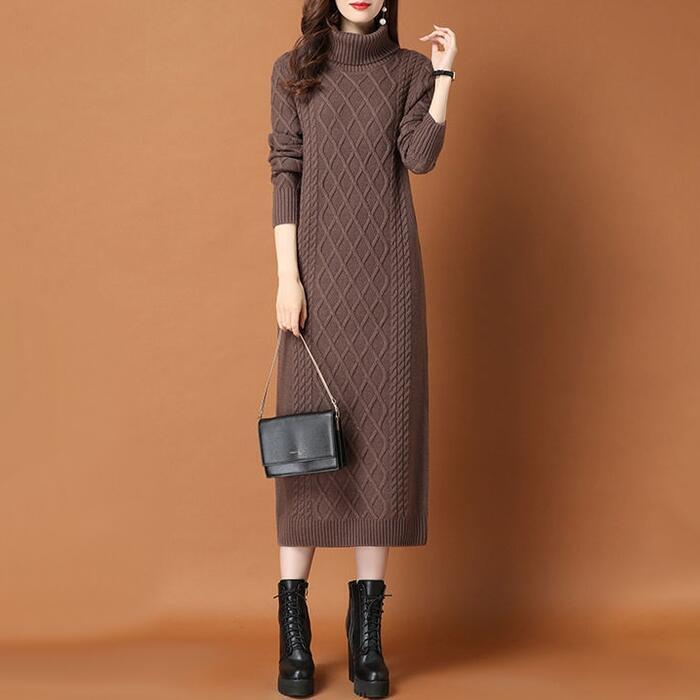 全2種5色 大きいサイズワンピース ニット 袖あり ケーブル タートルネック レディース きれいめ カジュアル おしゃれ 長袖 大人 可愛い フェミニン ミモレ丈 裏起毛 タイト スリム レッド 赤 ブラウン グレー ベージュ ブラック 黒 春 秋 冬 20代 30代 40代 50代