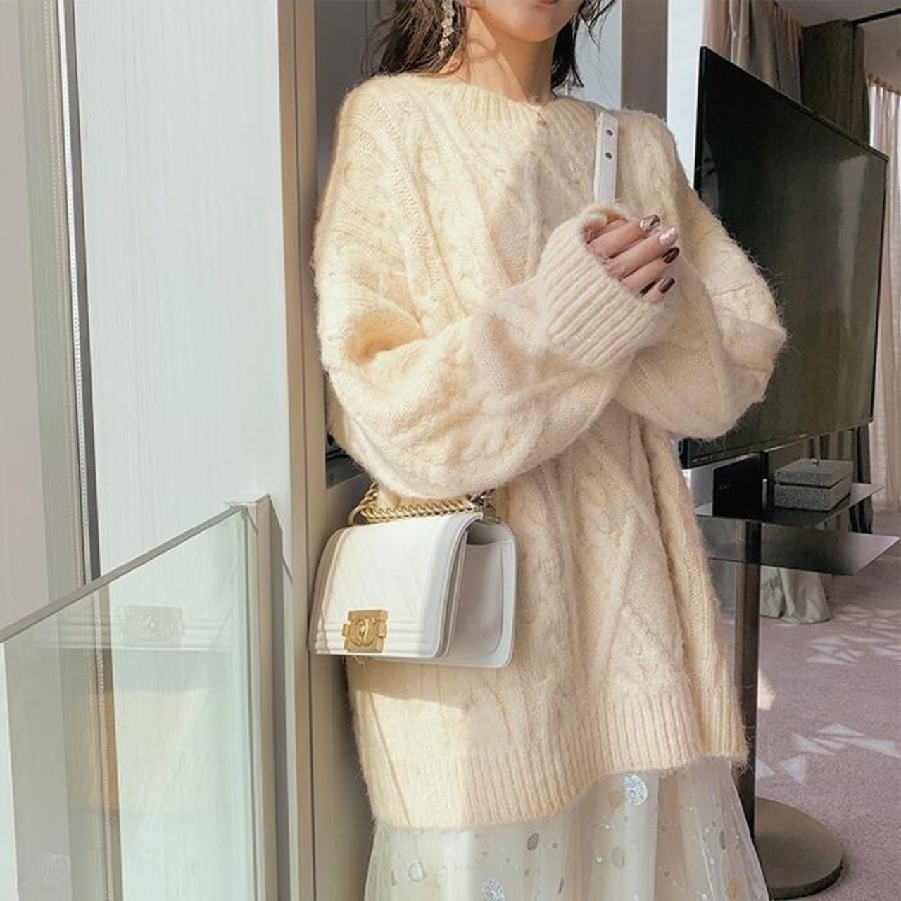 全4色 大きいサイズトップス ニット セーター クルーネック ケーブル レディース きれいめ カジュアル おしゃれ 長袖 大人 可愛い フェミニン ゆったり 体型カバー シンプル ベーシック 韓国 イエロー ピンク ベージュ レッド 赤 春 秋 冬 20代 30代 40代 50代