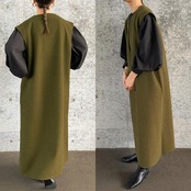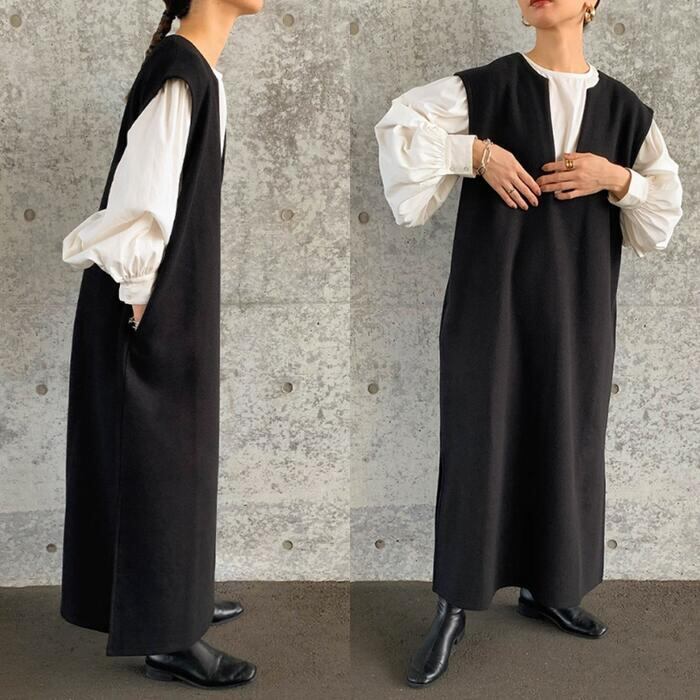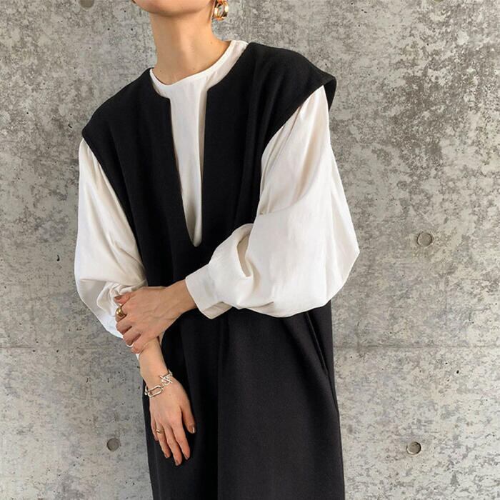 全3色 ゆったり 体型カバーレイヤード ワンピース キーネック レディース きれいめ カジュアル ノースリーブ ジャンパースカート サロペットスカート おしゃれ 大人 可愛い フェミニン ロング丈 韓国 グレー グリーン 緑 ブラック 黒 春 秋 冬 20代 30代 40代 50代