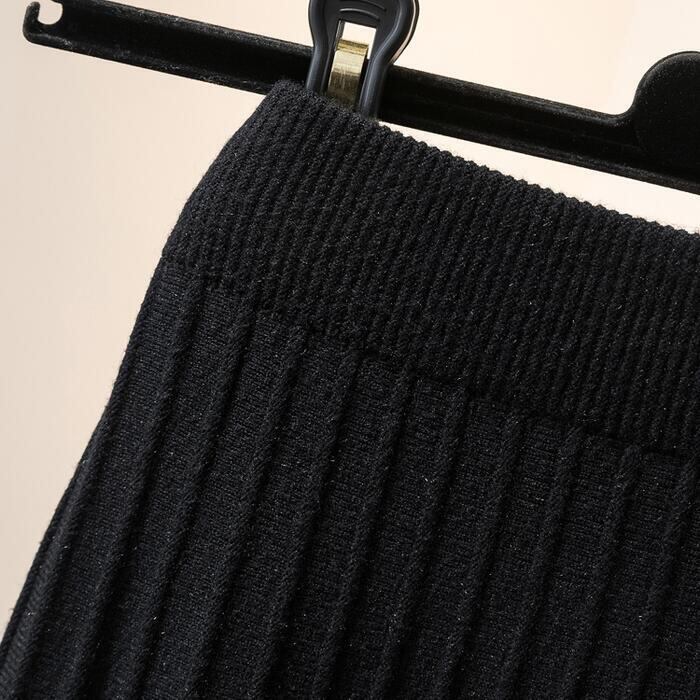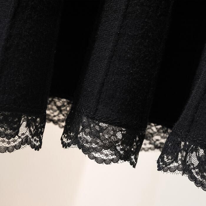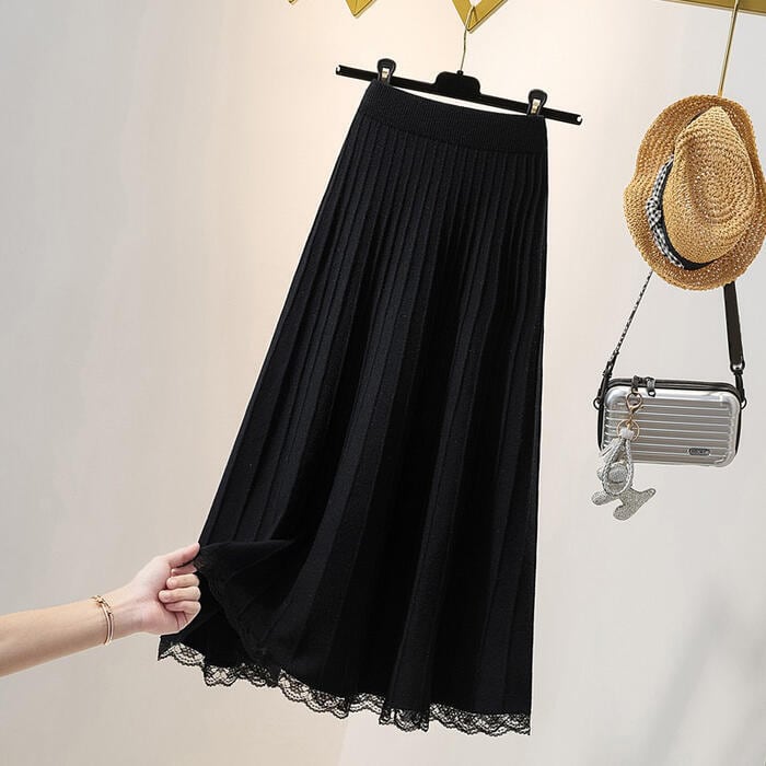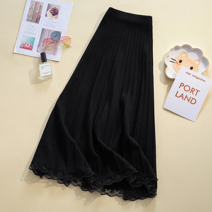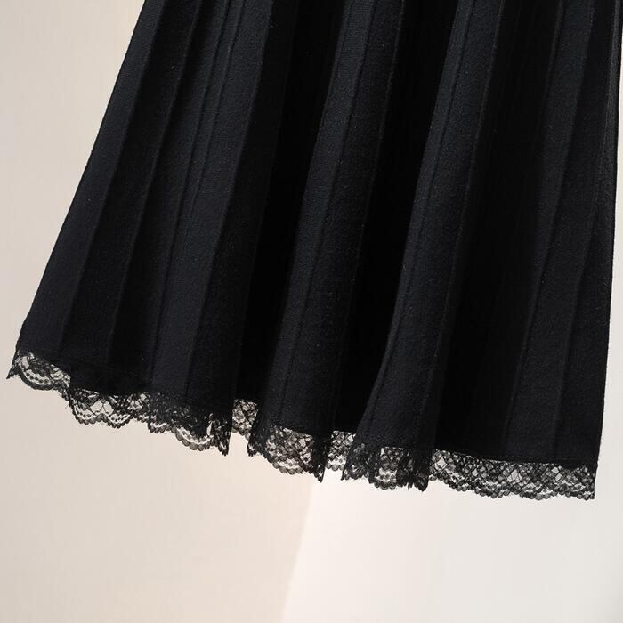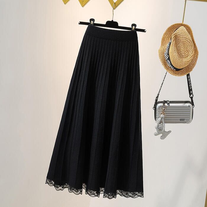 スカート ボトムス ニット ミモレ丈 レース プリーツ エレガント カジュアル レディース フェミニン 大人 可愛い きれいめ ナチュラル フレア ウエストゴム おしゃれ 楽ちん 大きいサイズ ブラック 黒 春 秋 冬 20代 30代 40代 50代