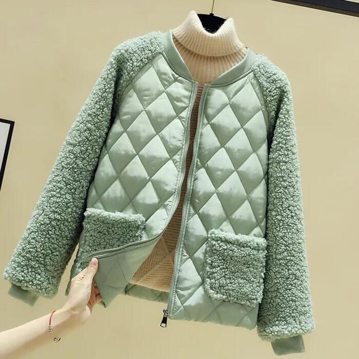 ボア×キルティングの切り替えデザインが新鮮なノーカラージャケット。