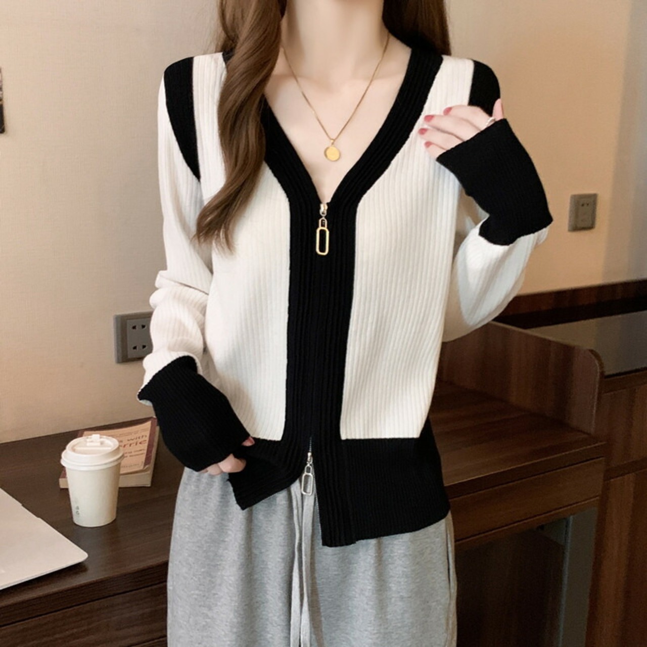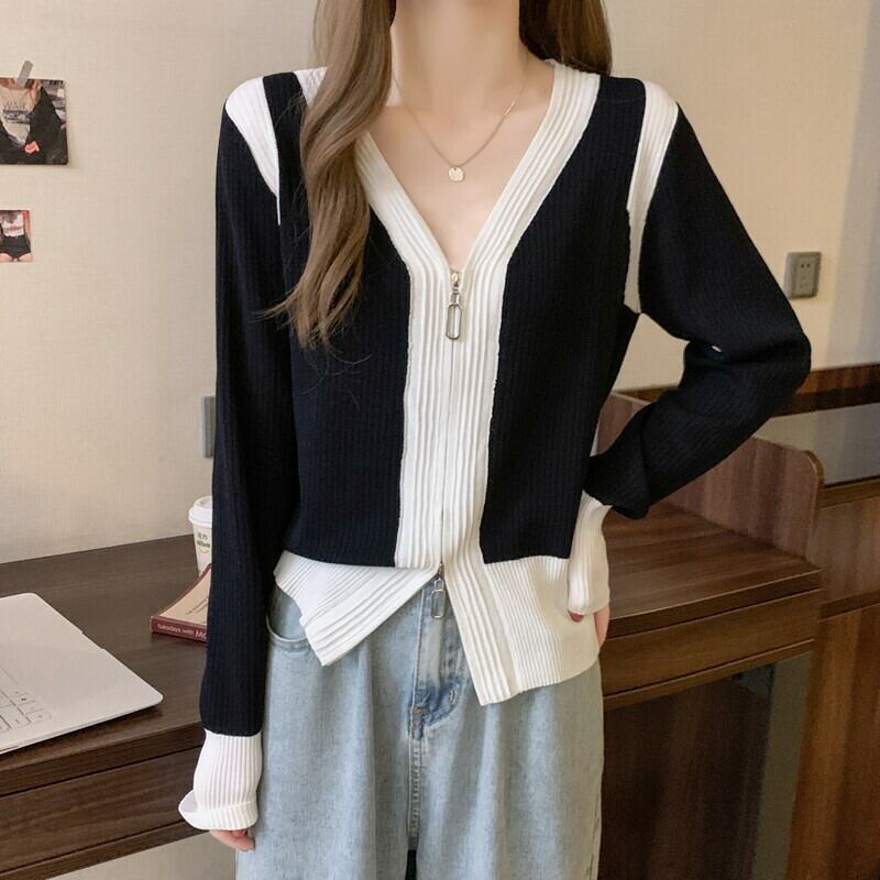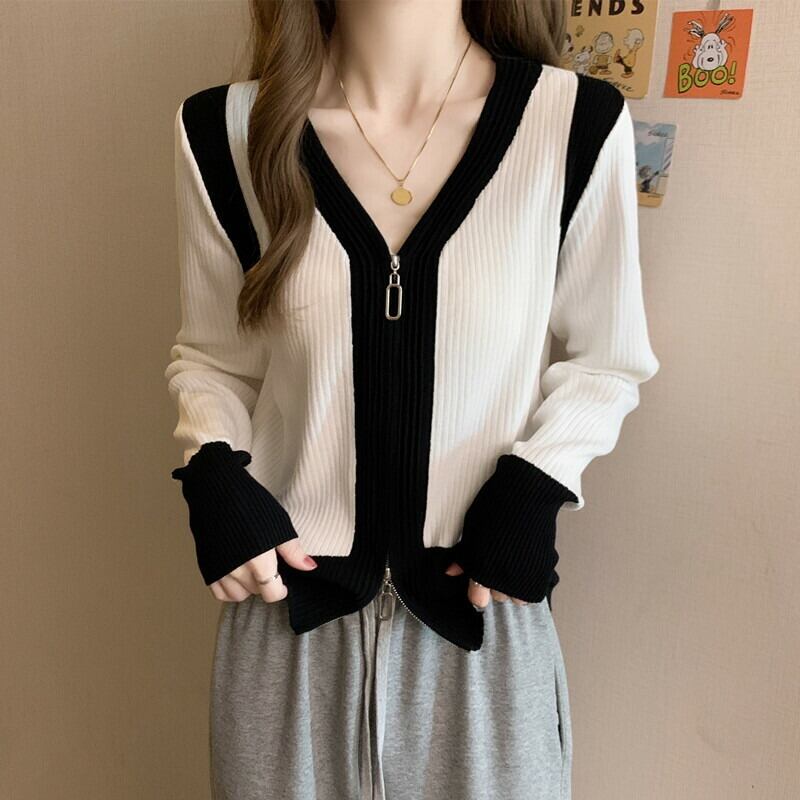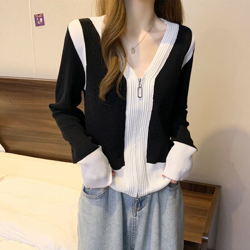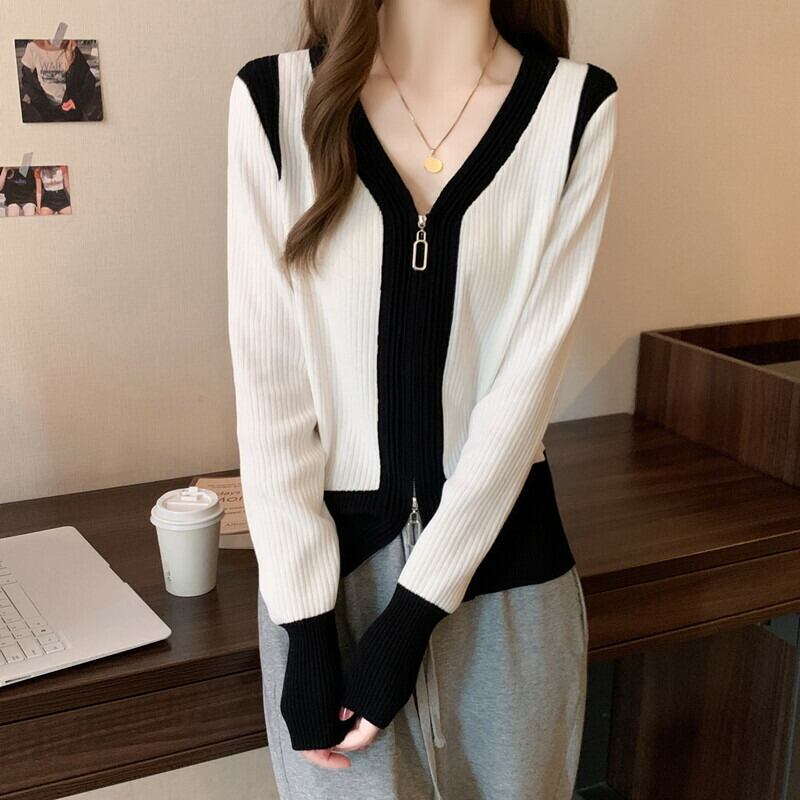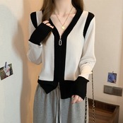 全2色 トップス ニット カーディガン セーター 配色 ライン バイカラー レディース きれいめ カジュアル おしゃれ 長袖 大人 可愛い 羽織り 体型カバー Vネック ジップアップ 大きいサイズ ホワイト 白 ブラック 黒 春 秋 冬 20代 30代 40代 50代