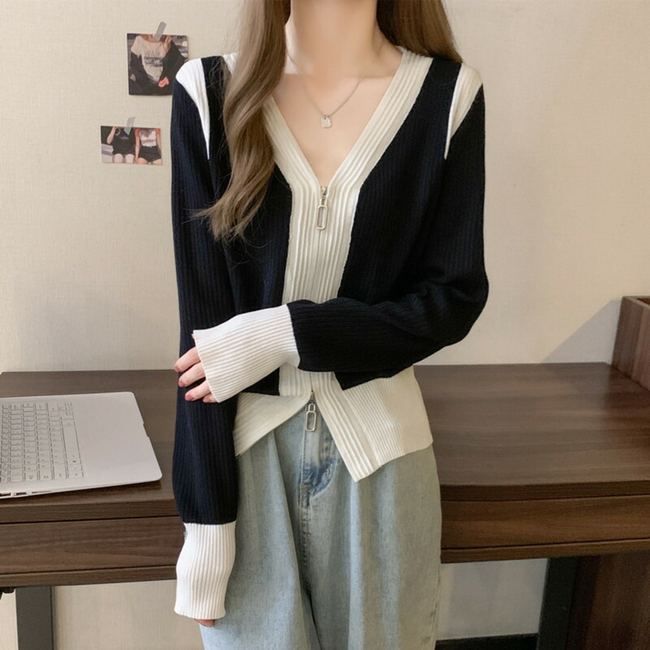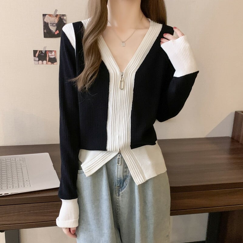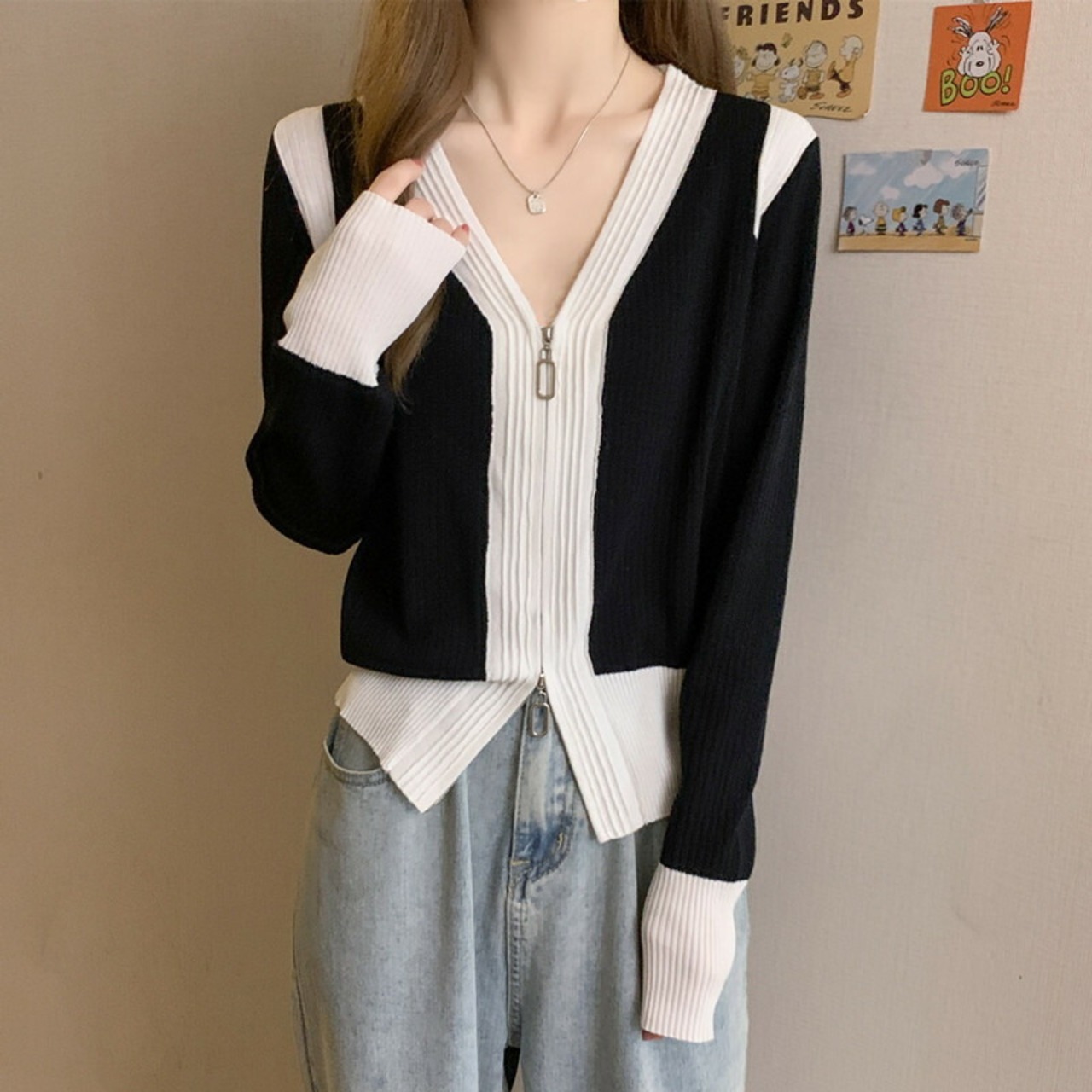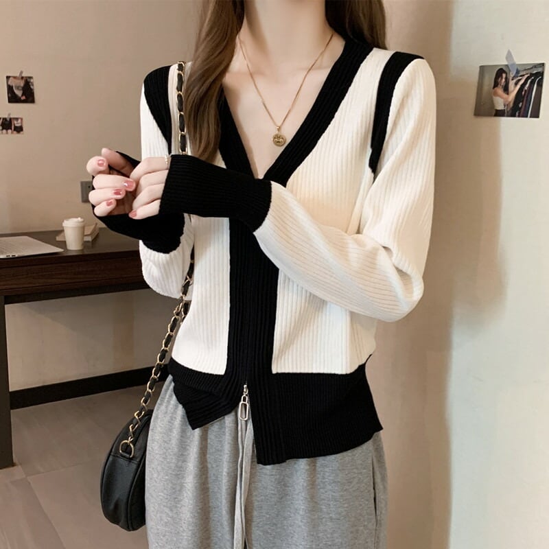 全2色 トップス ニット カーディガン セーター 配色 ライン バイカラー レディース きれいめ カジュアル おしゃれ 長袖 大人 可愛い 羽織り 体型カバー Vネック ジップアップ 大きいサイズ ホワイト 白 ブラック 黒 春 秋 冬 20代 30代 40代 50代